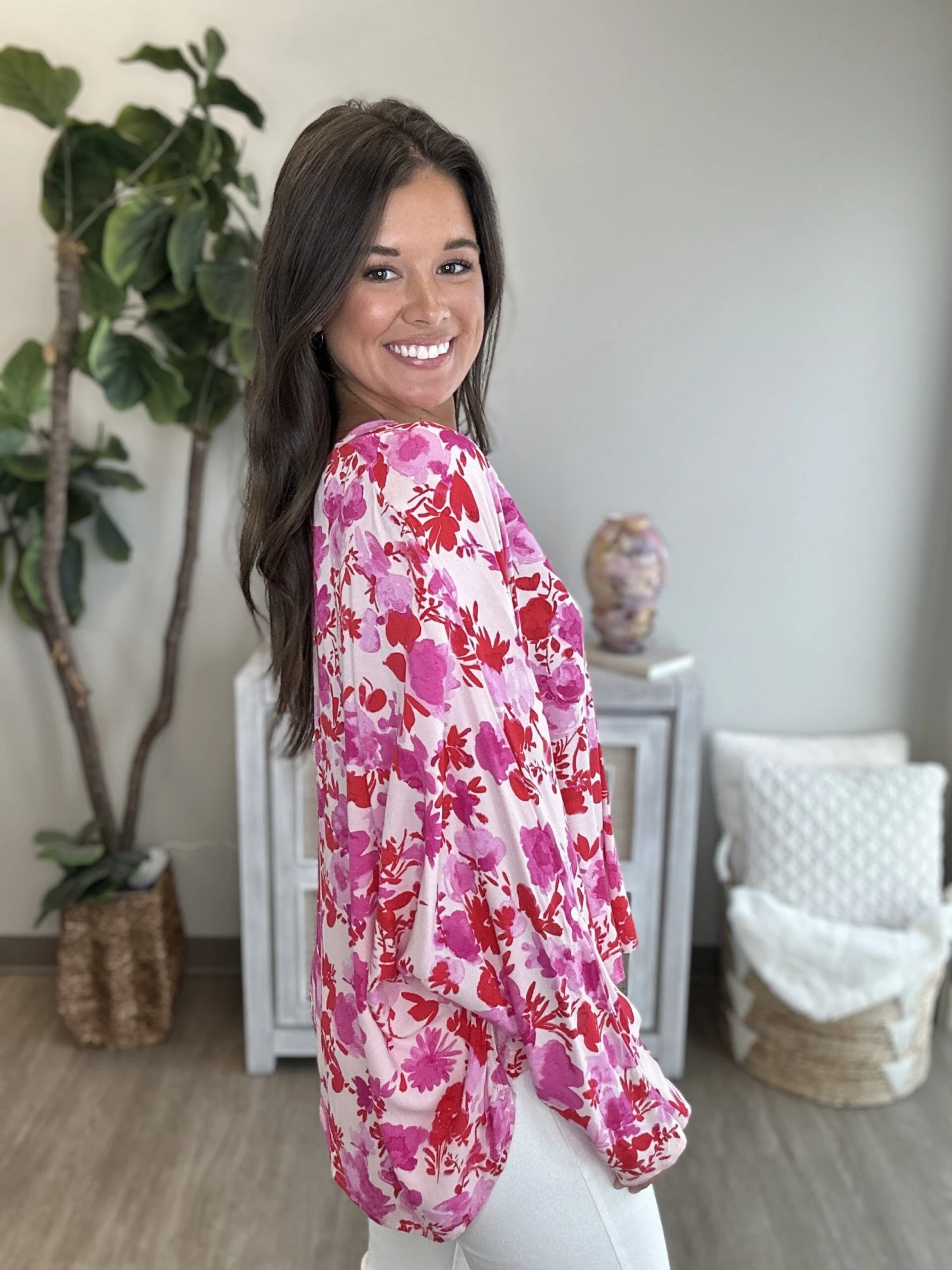 Features: V Neck, Long Sleeves, Floral Print, Side Slits