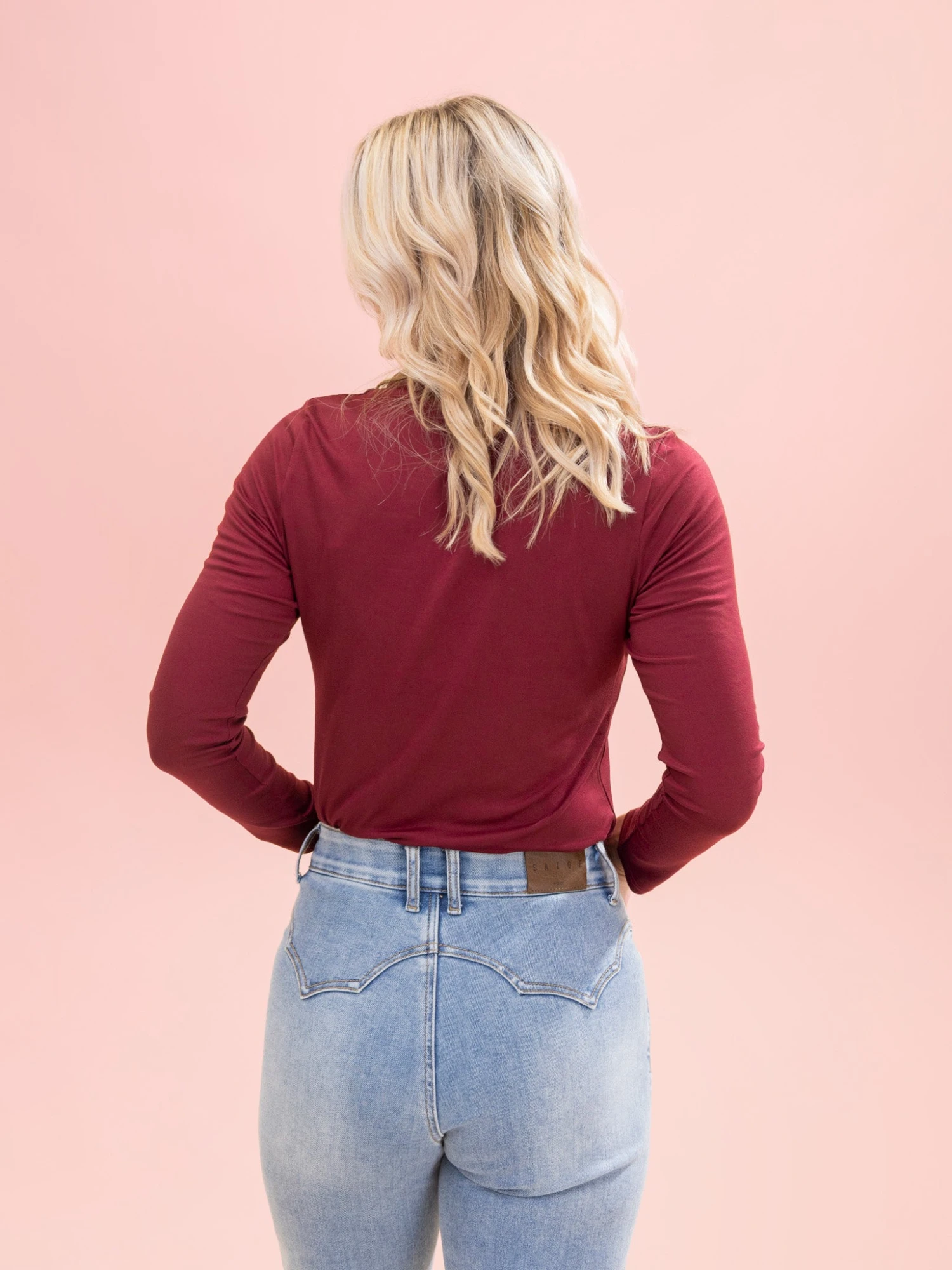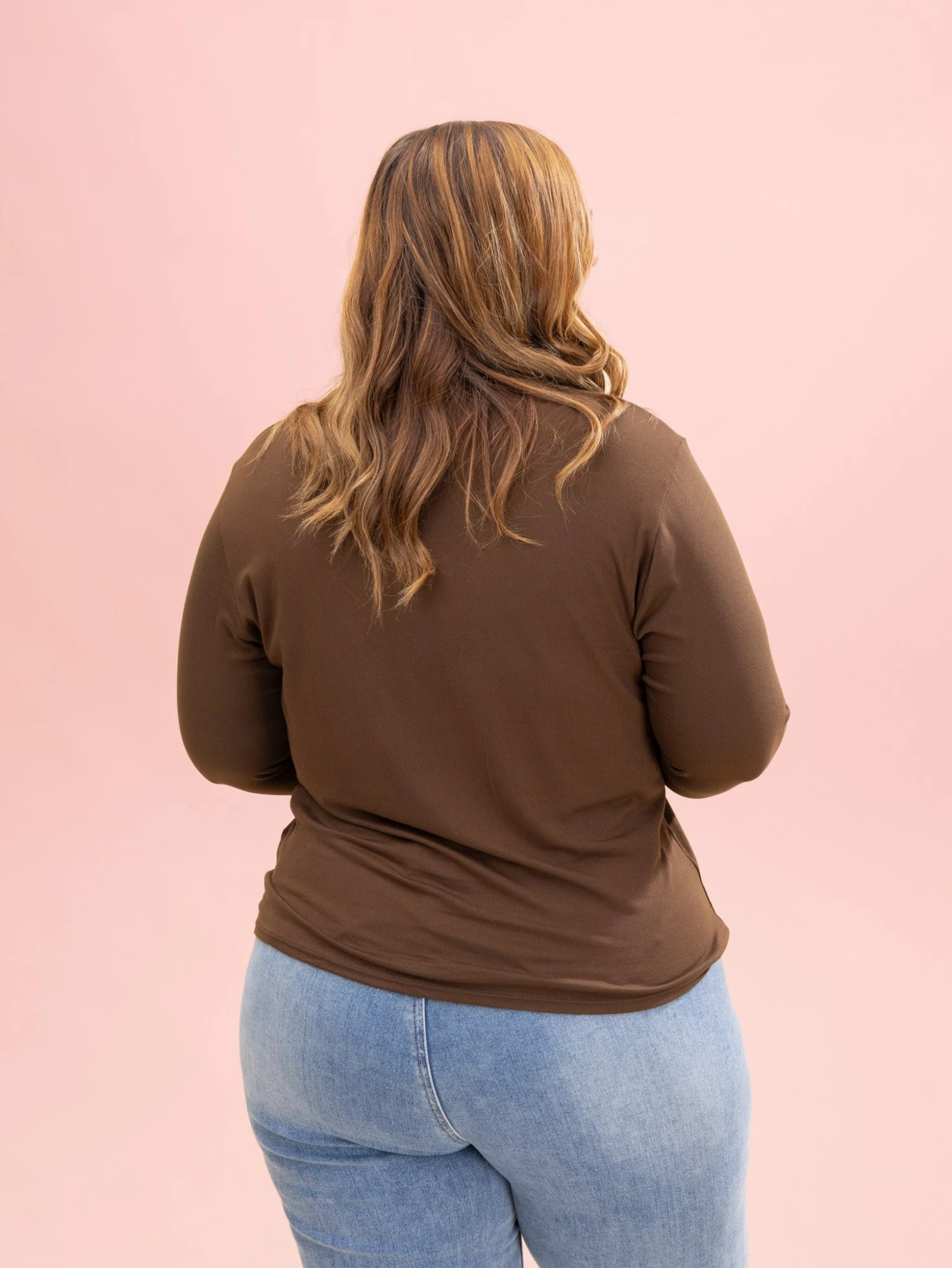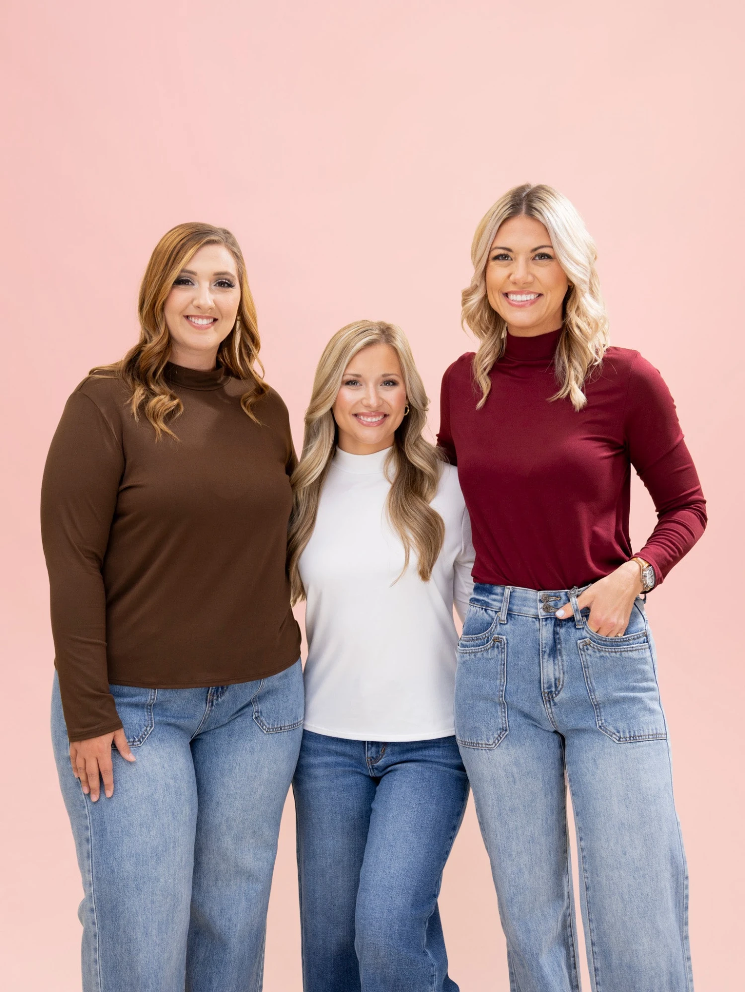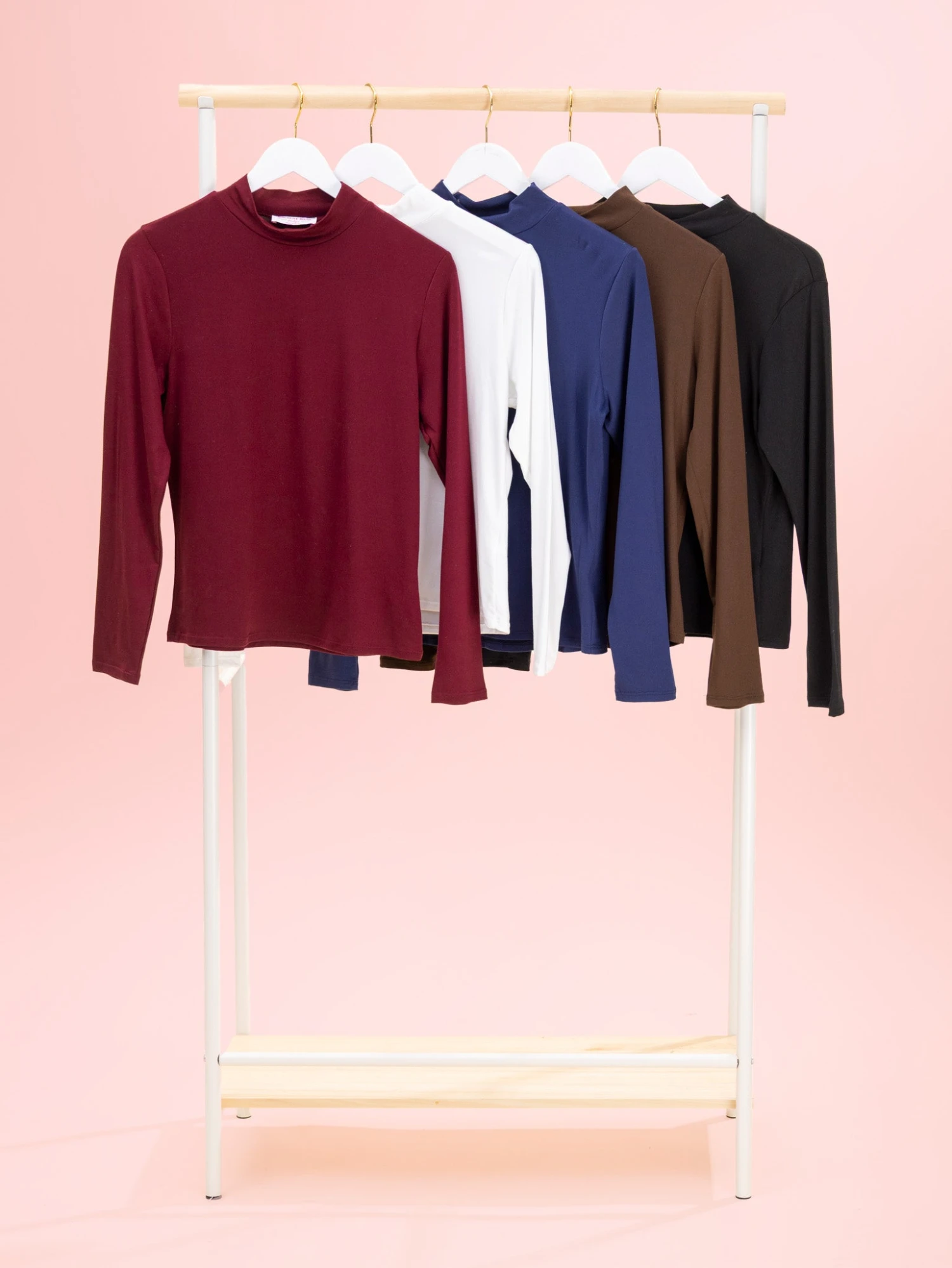 Features: Mock Neck, Long Sleeves, Solid Tee
