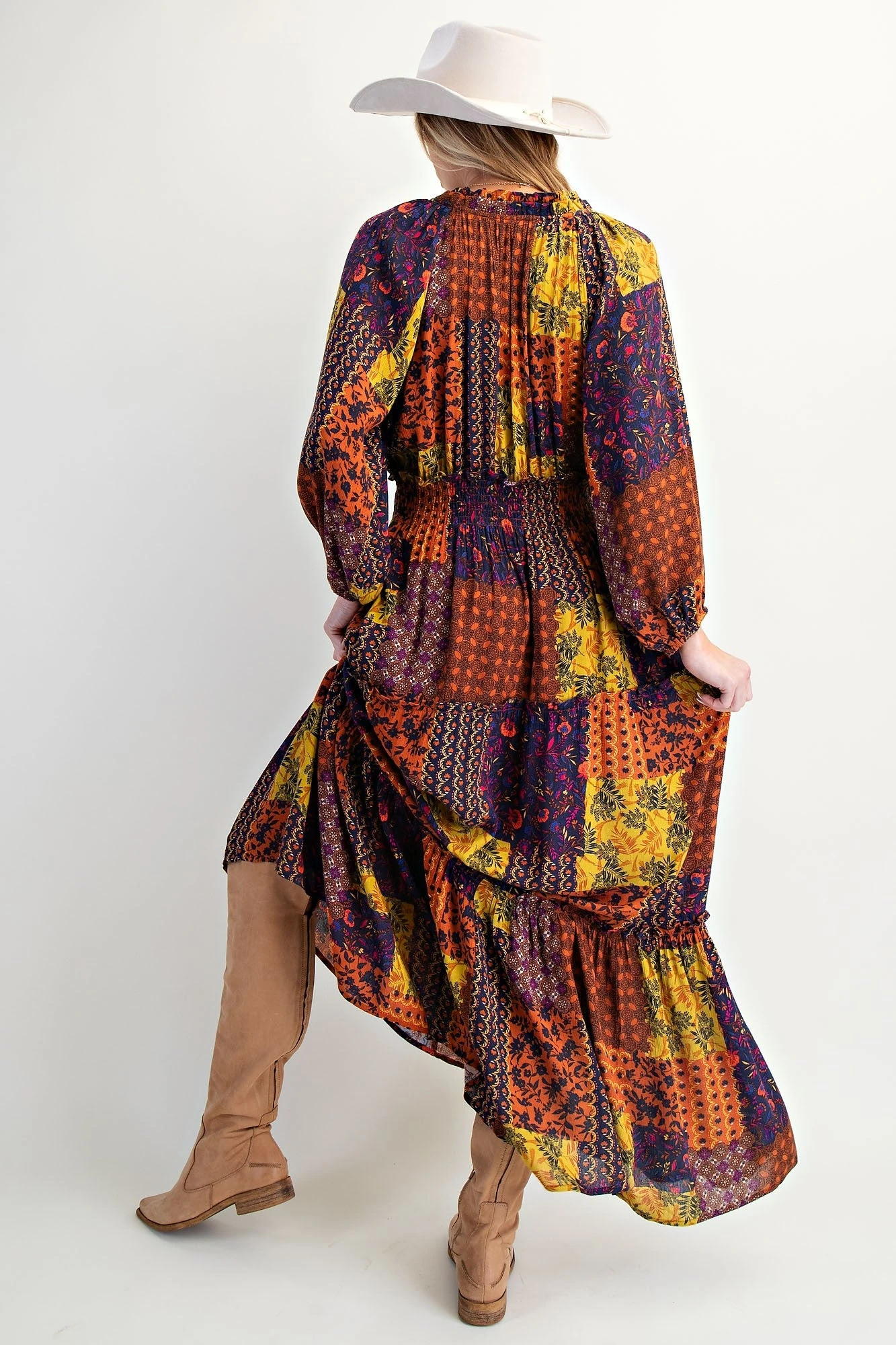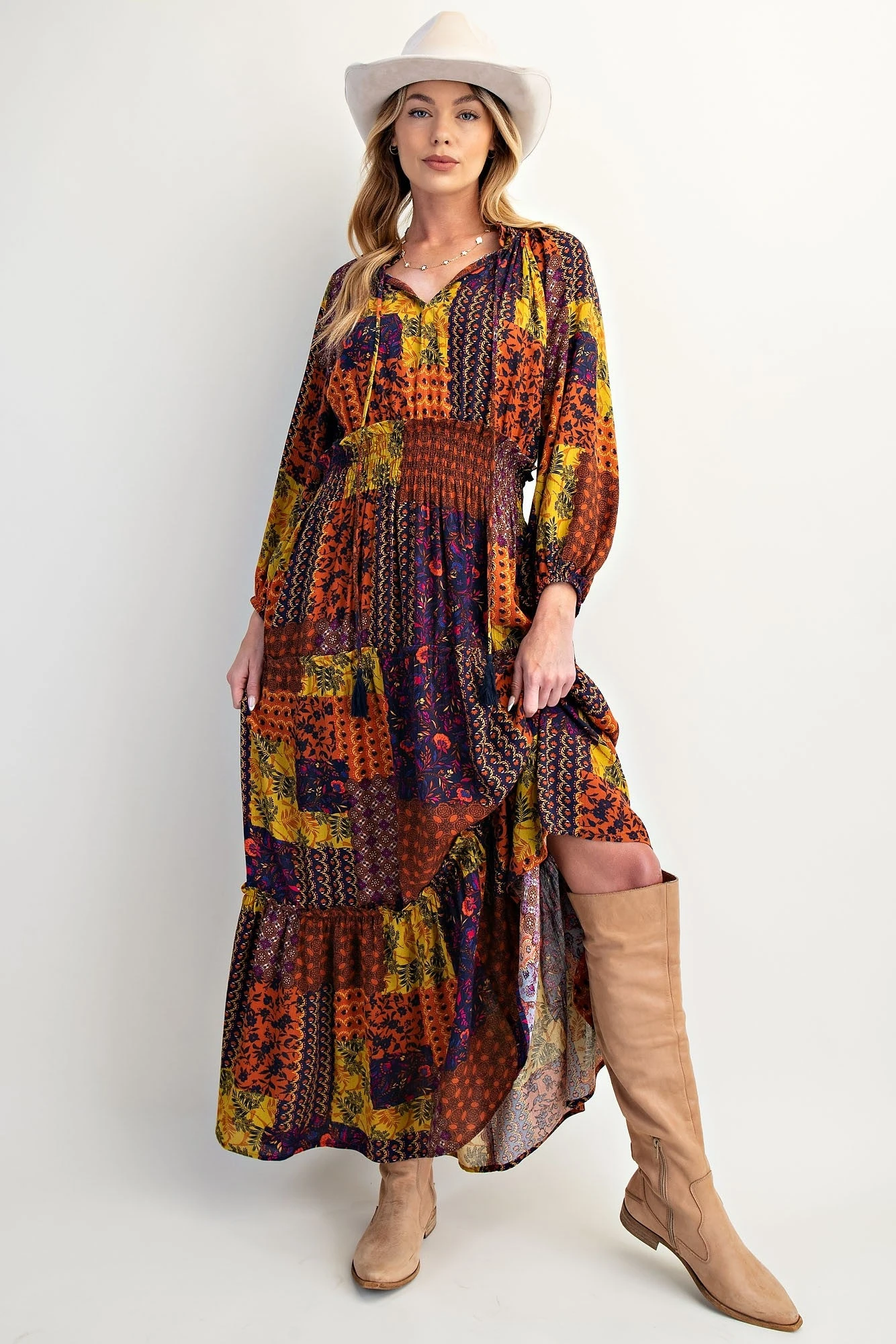 Features: Long Sleeve, Patch Print, Maxi, Dress