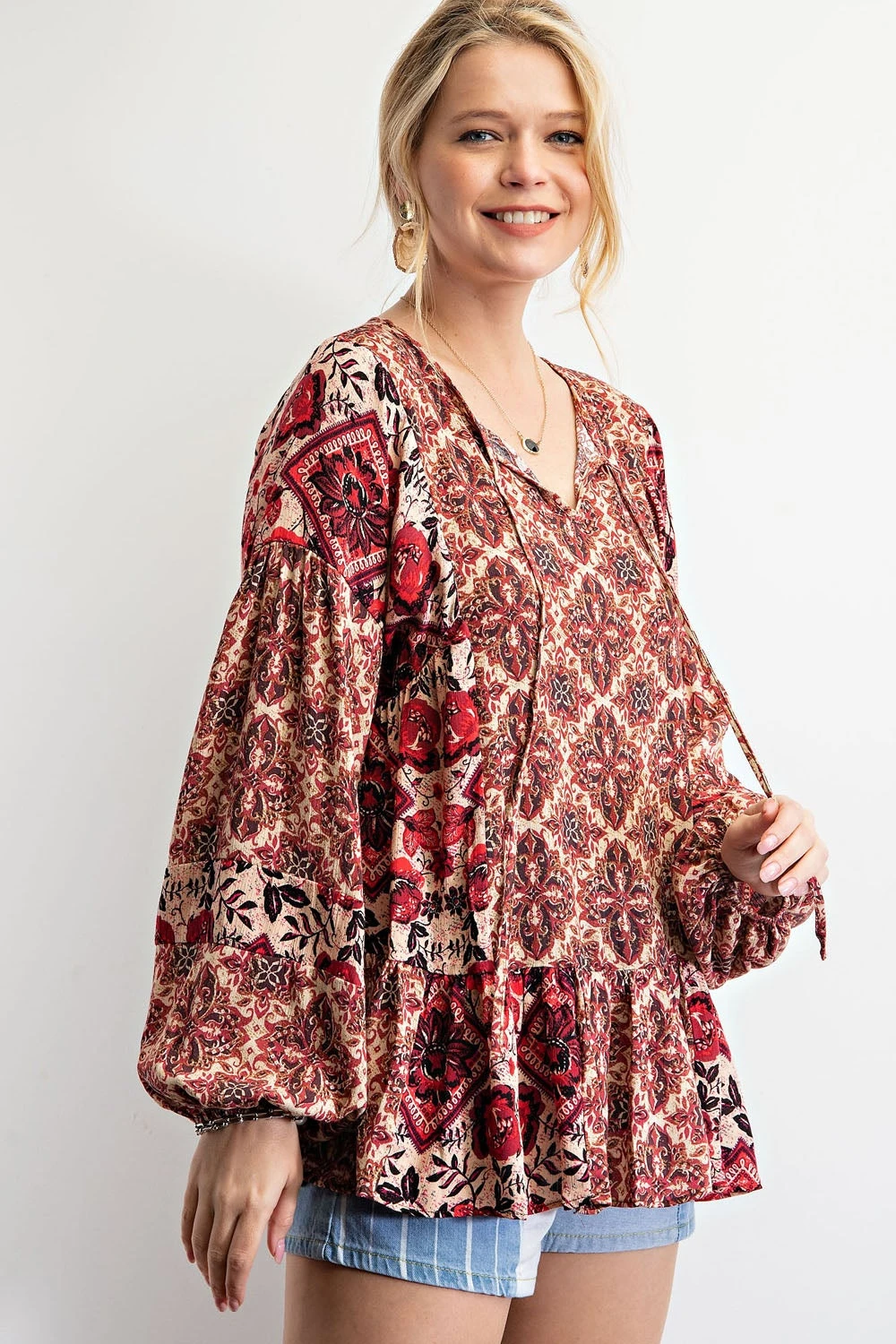 Features: Long Sleeves, Babydoll, Round Tie Neck