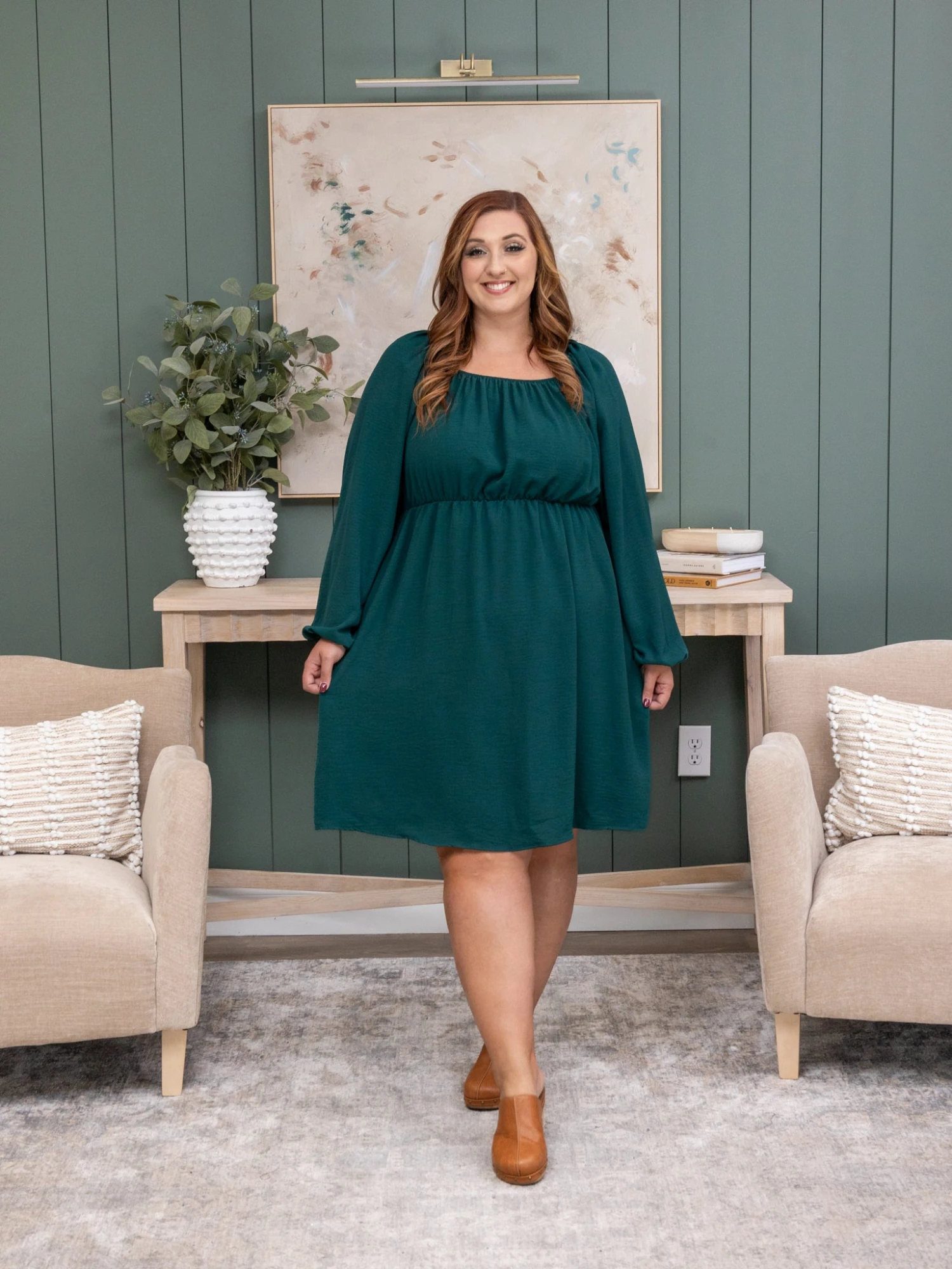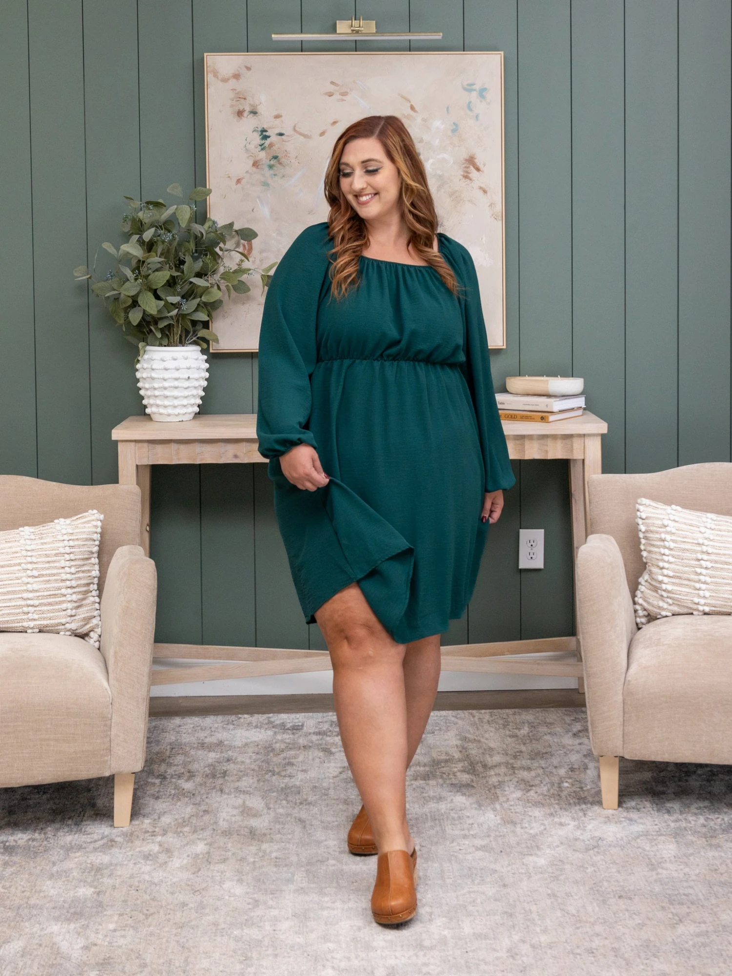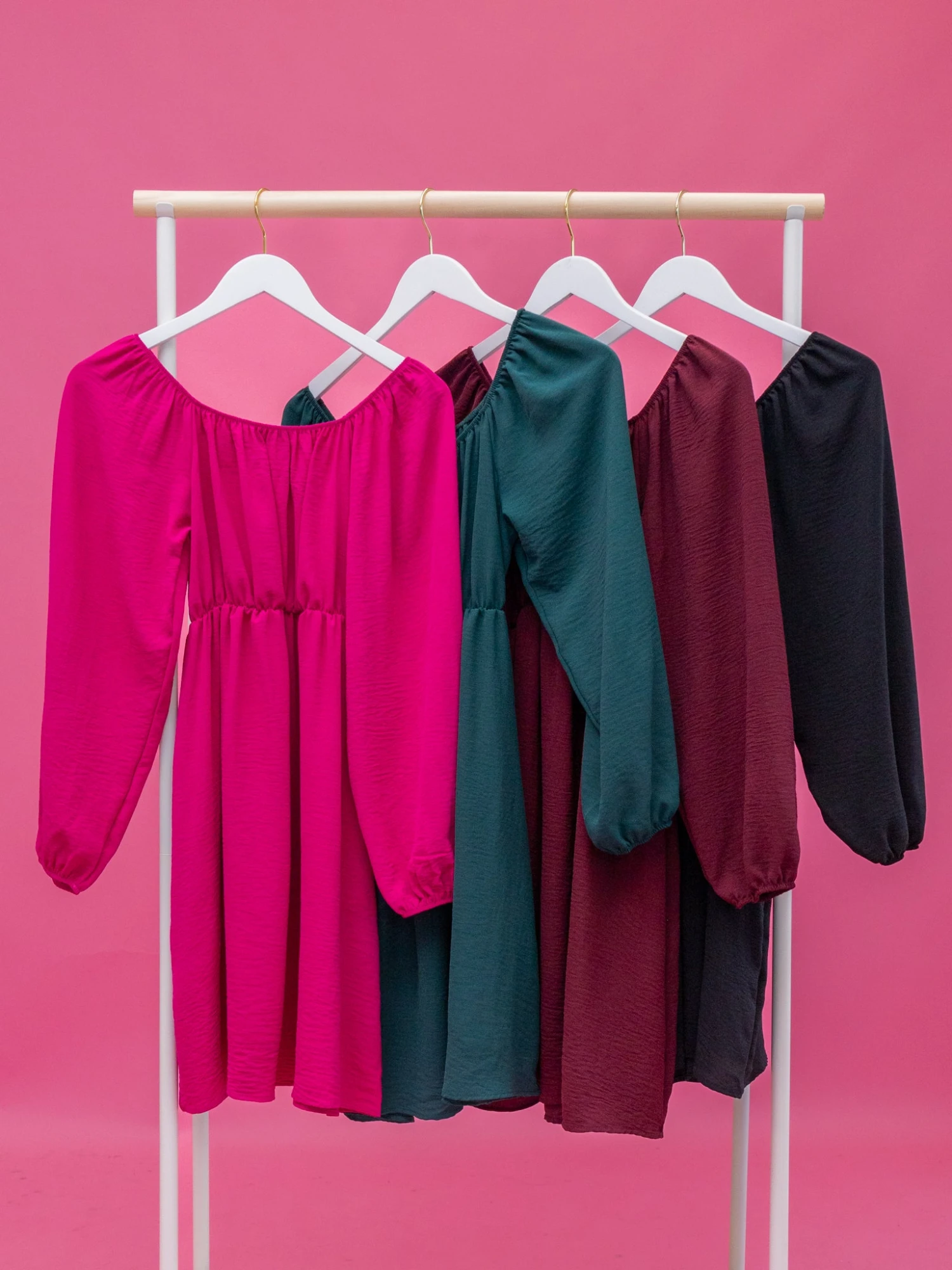 Features: Elastic Square Neck,Long Sleeves,Elastic Waist,Pockets,Solid Mini Dress