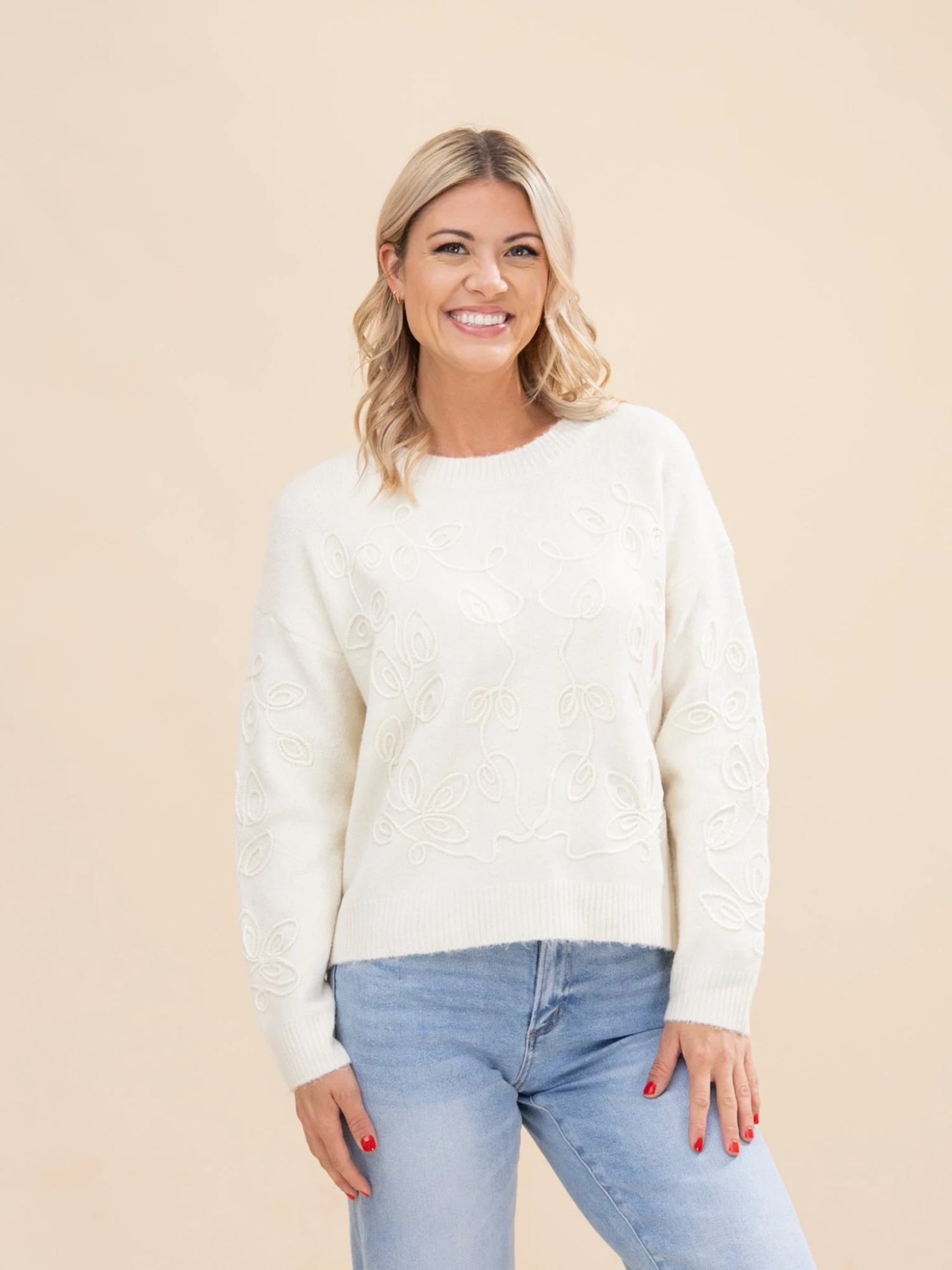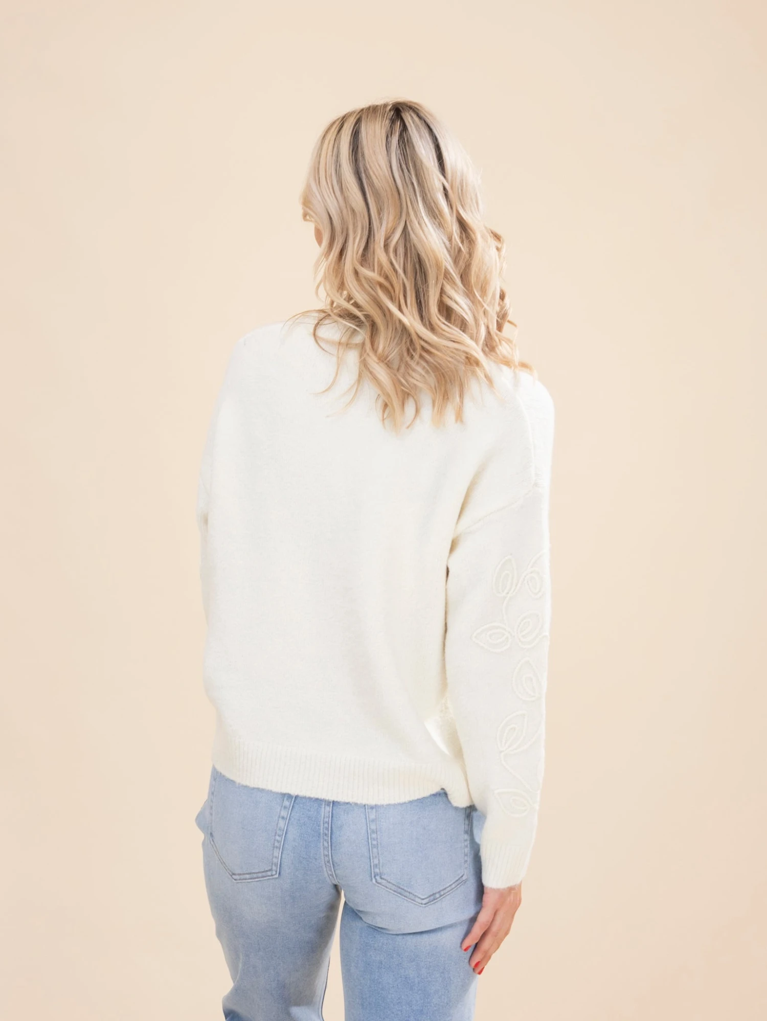 Features: Round Neck, Long Sleeves, Embroidered Pattern, Solid Sweater