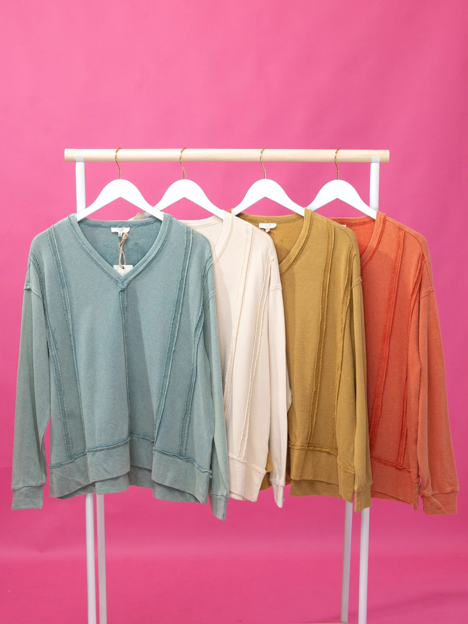 Features: V Neck, Long Sleeves, Mineral Wash Top