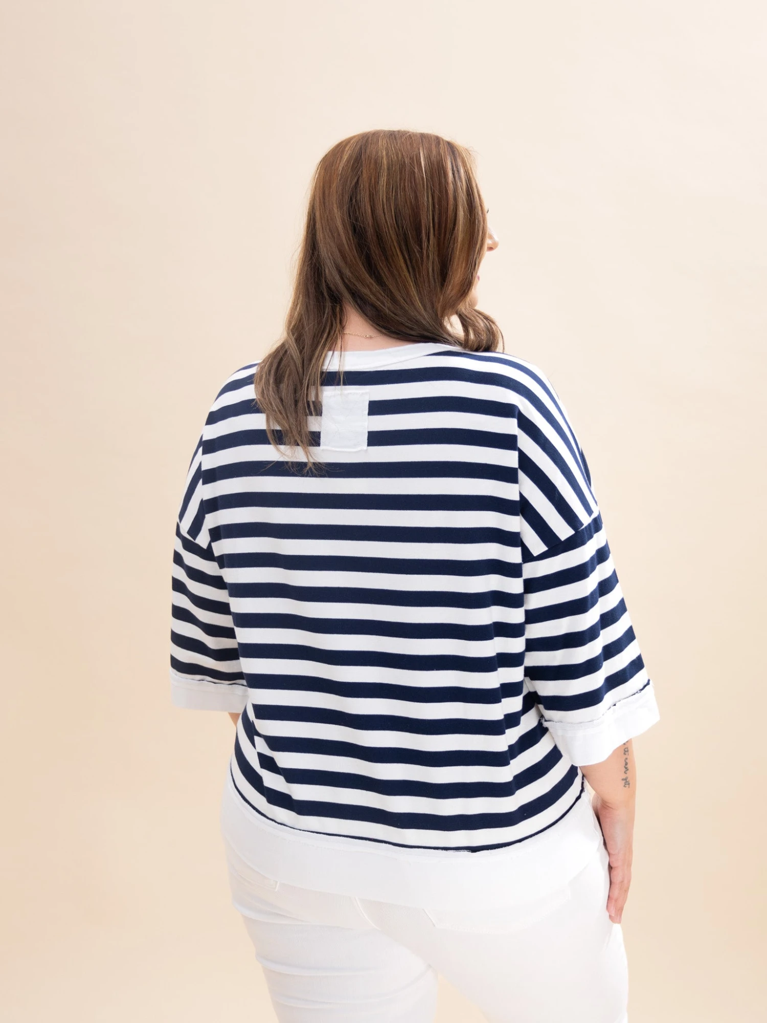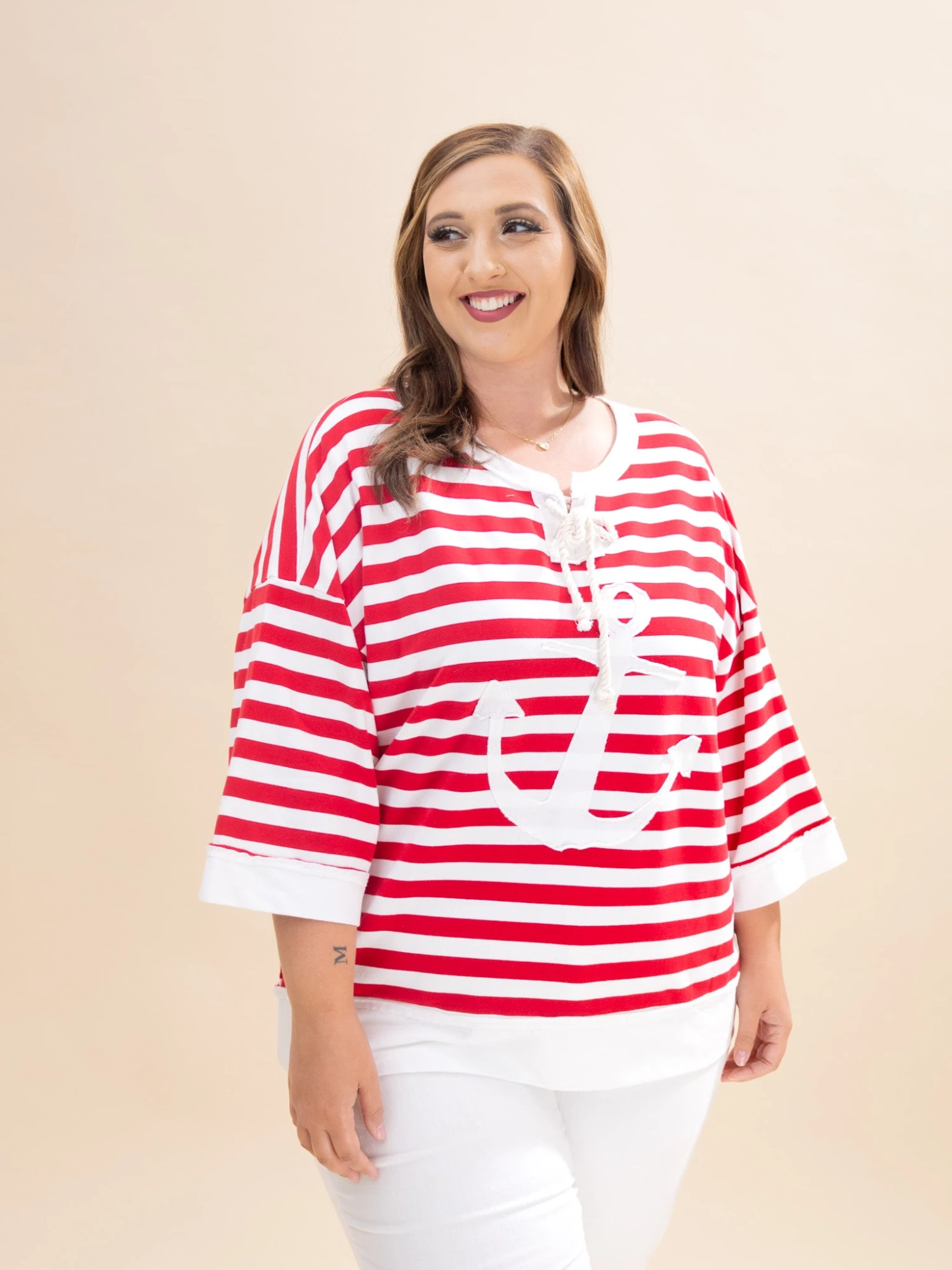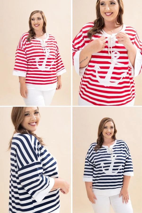 Features: V Neck W/ Tie Detail, Half Sleeve, Striped Anchor Top