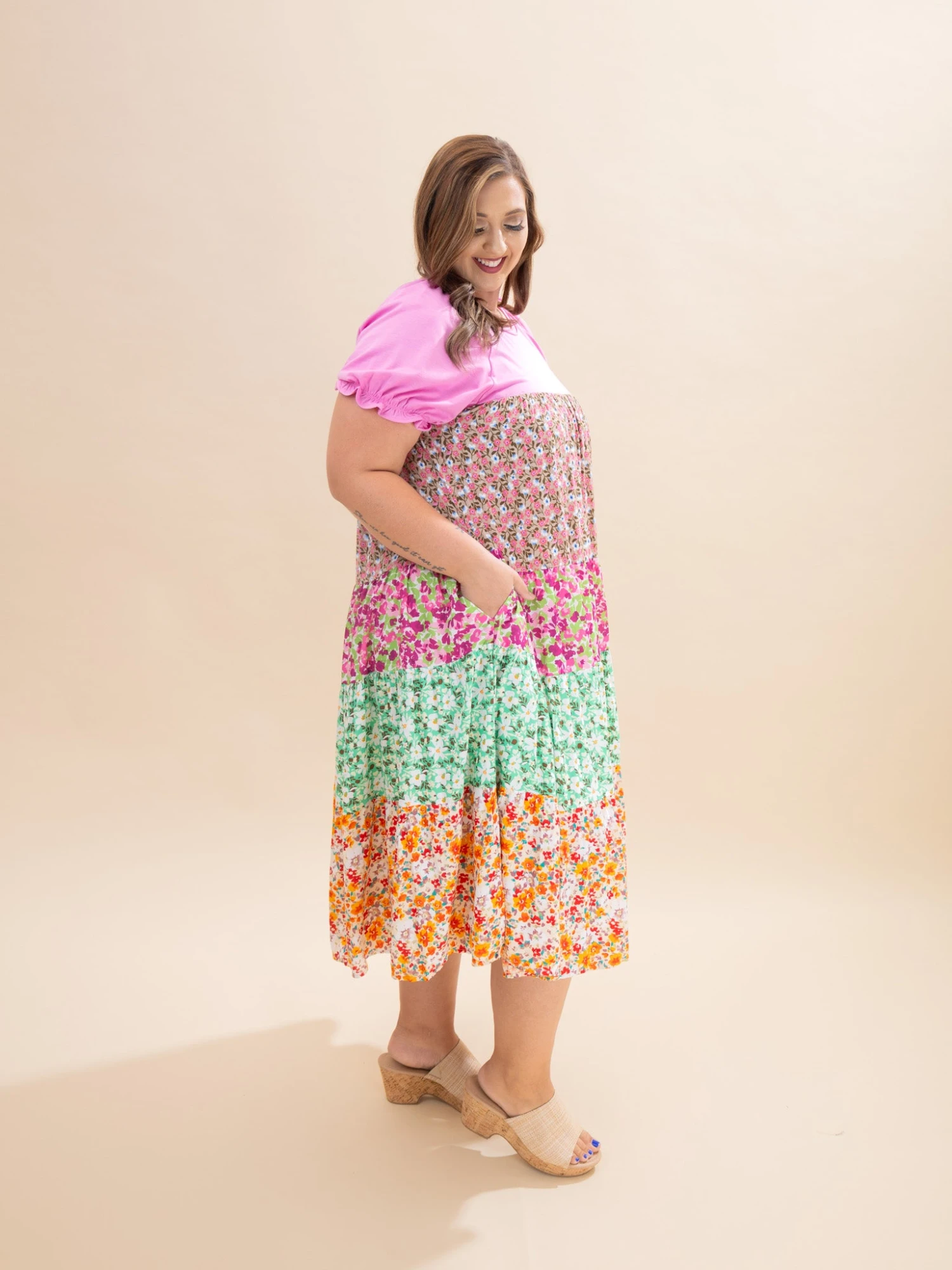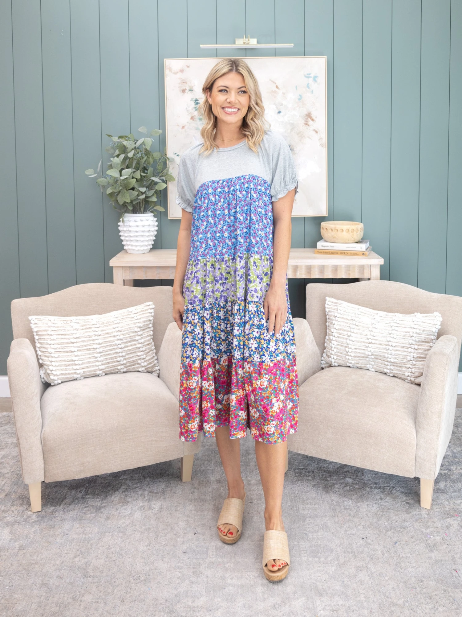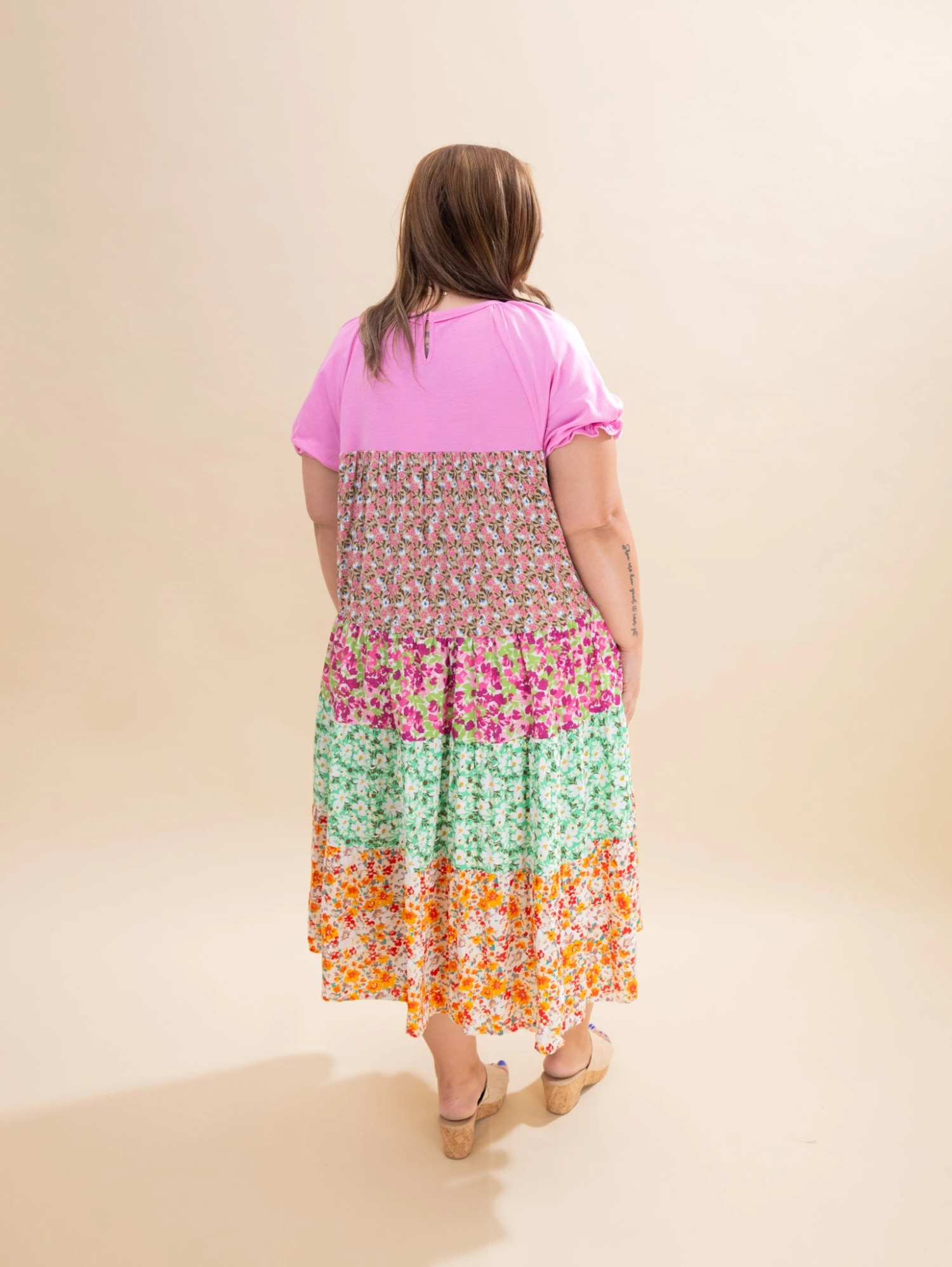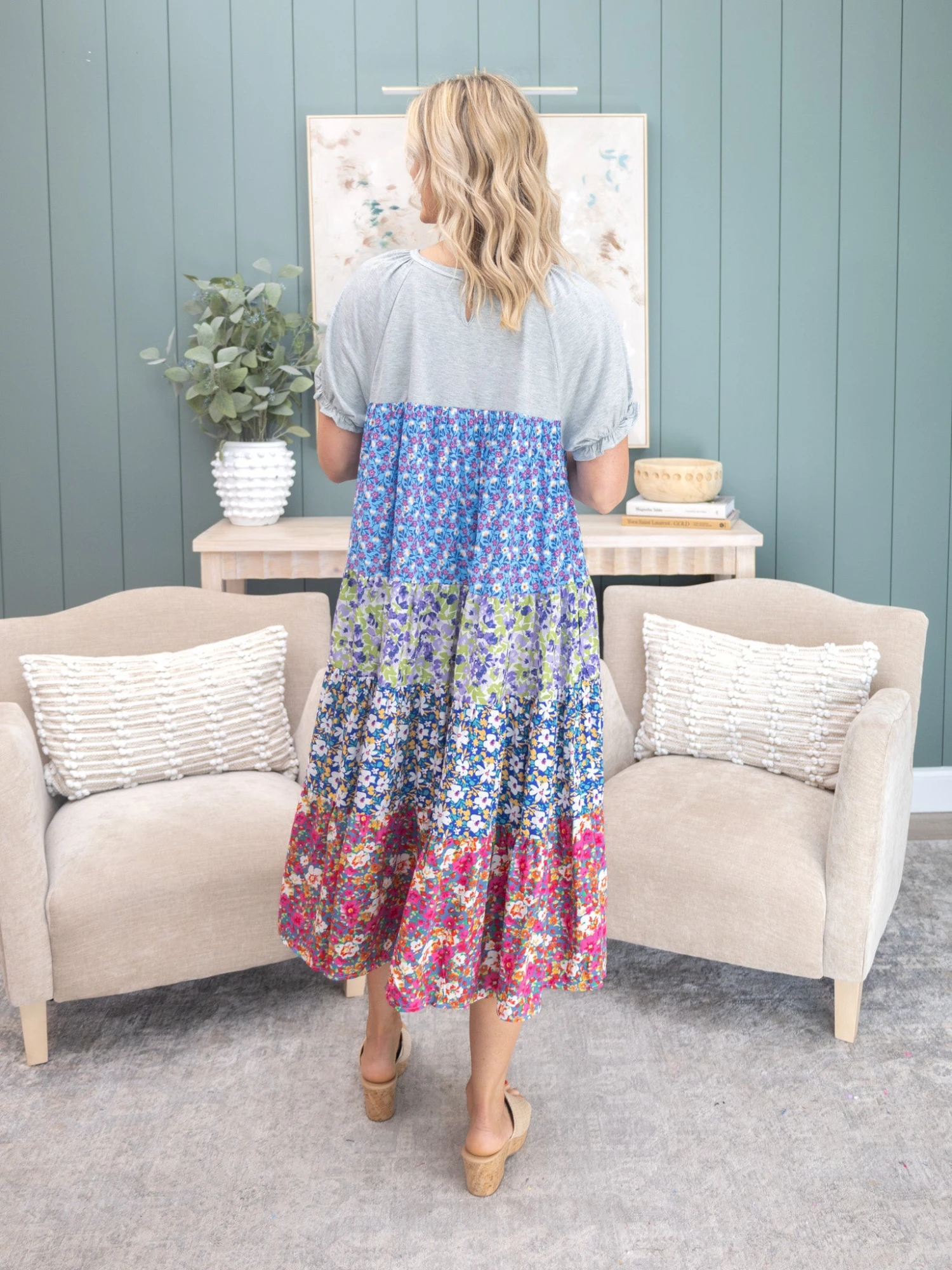 Features: Round Neck, Short Sleeves, Pockets, Keyhole Button Back, Floral Mixed Print Tiered Maxi Dress
