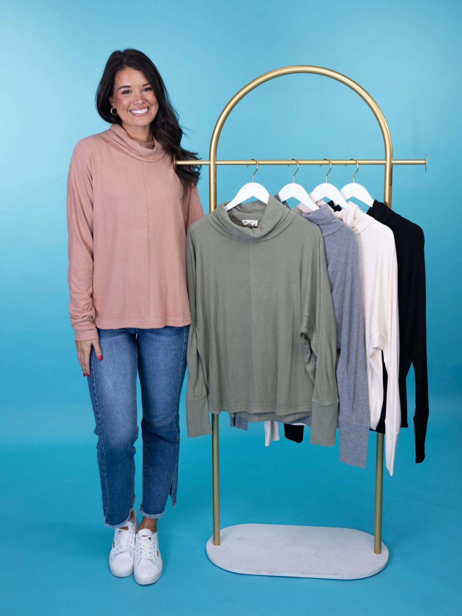 This chic top features a trendy mock neck and relaxed dolman sleeves, creating a stylish and cozy look! Effortlessly elevate your everyday look with this must-have piece!
