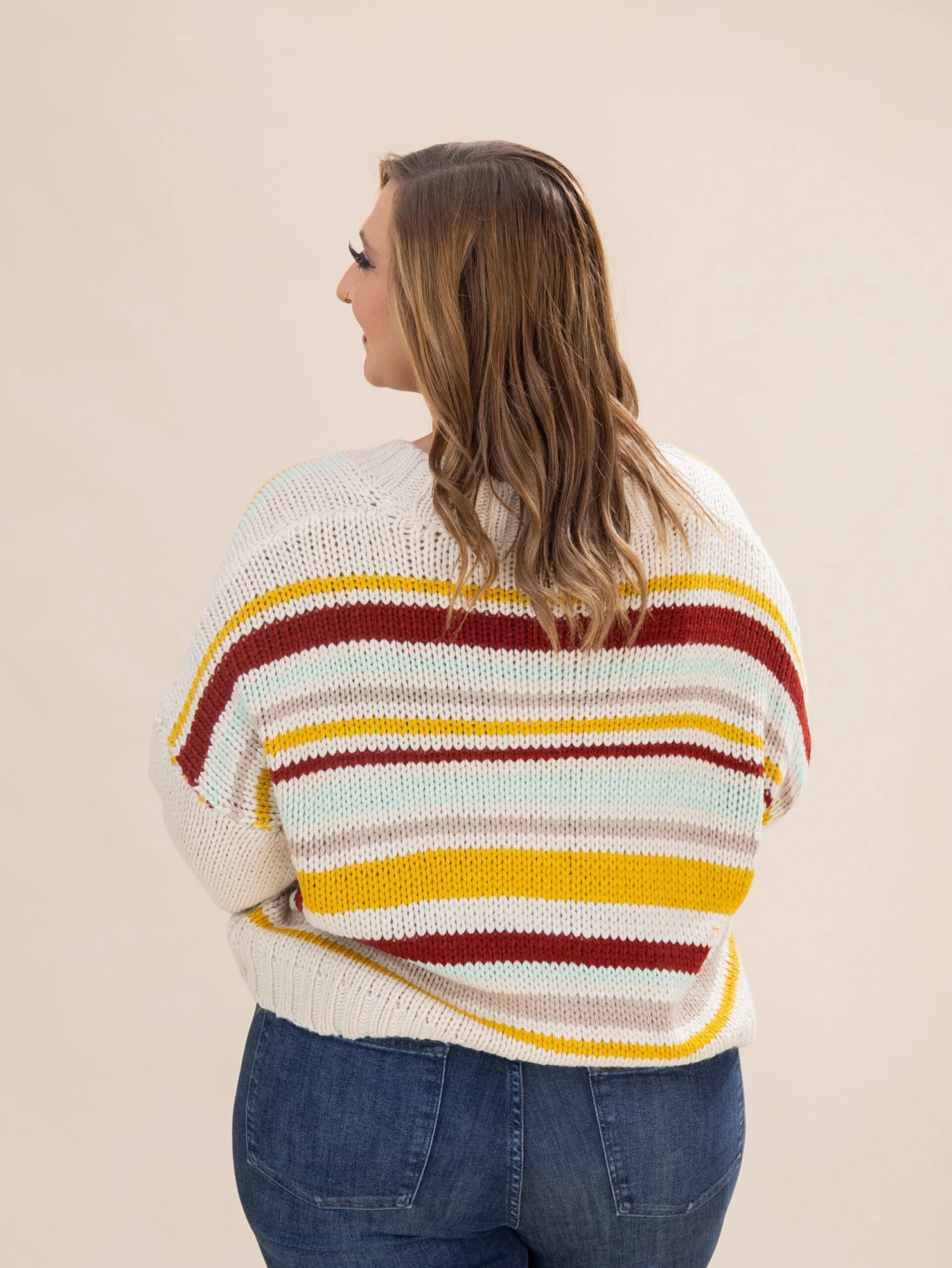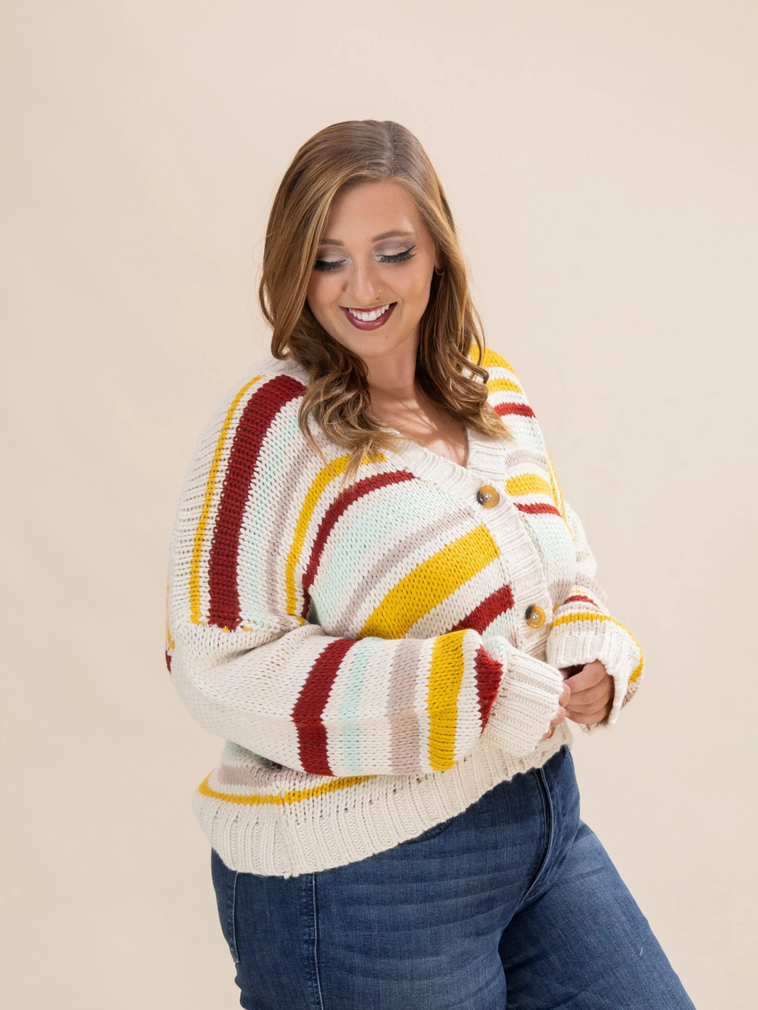 Features: Split Neck, Buttons Up, Long Sleeves, Striped Sweater Cardigan