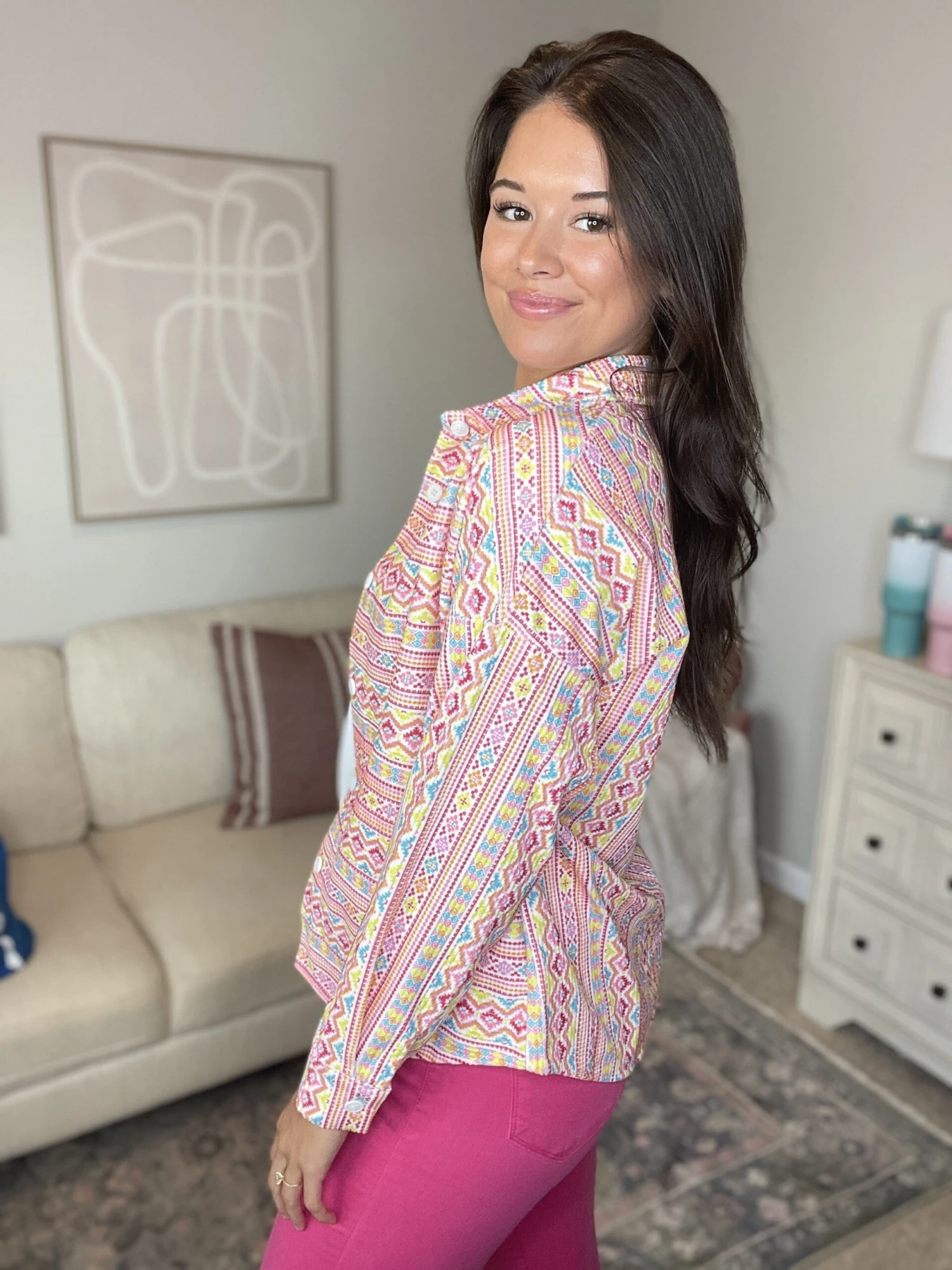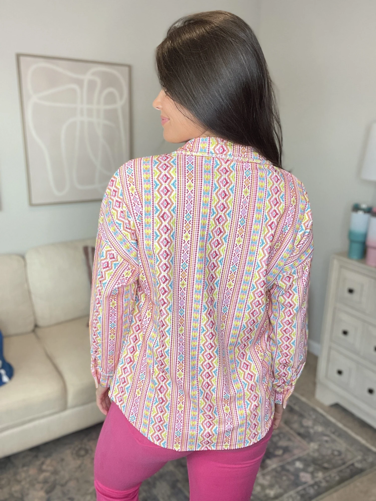 Features: Multicolor Print, Long Sleeve, Collared, Button Down