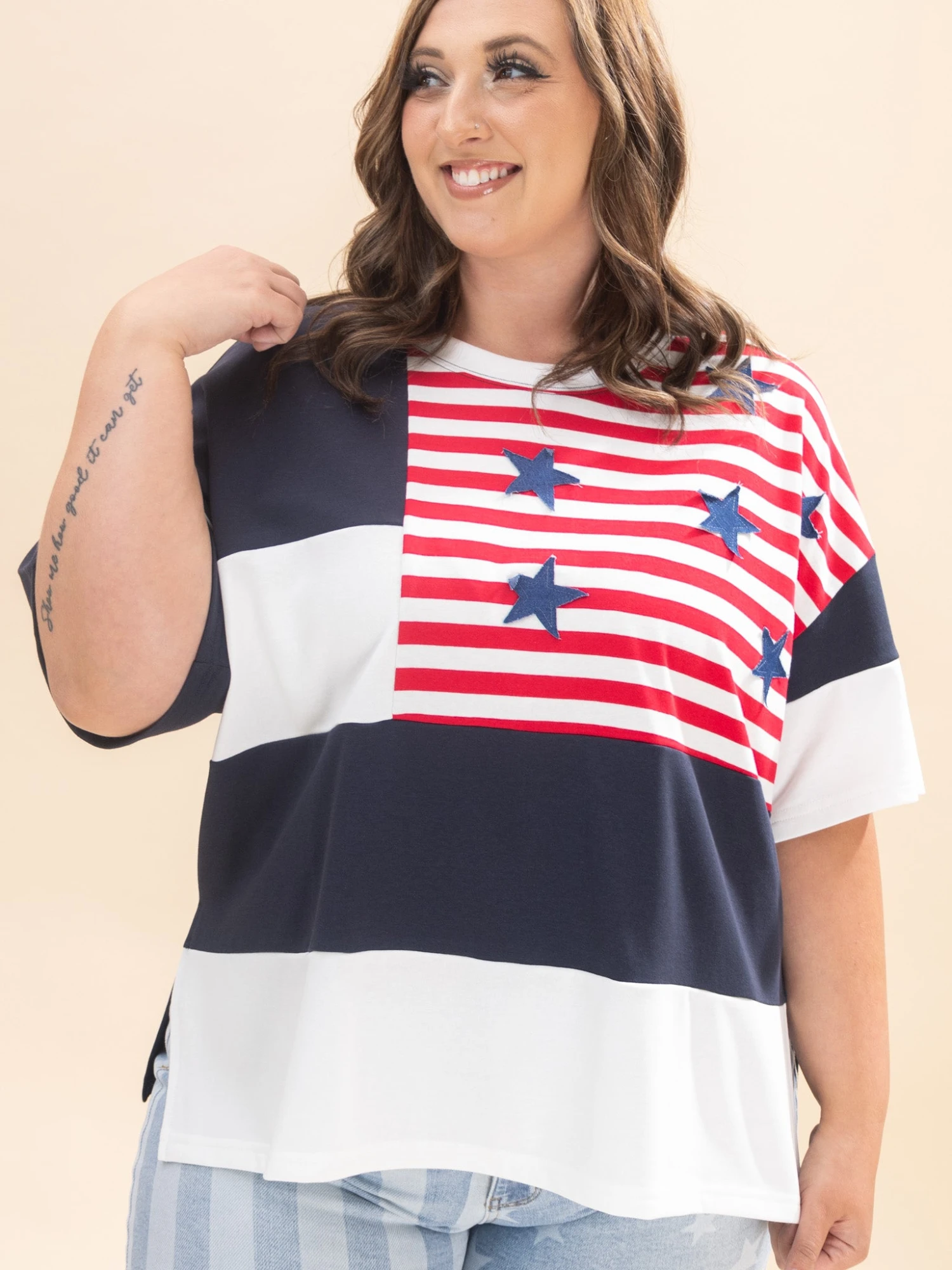 Features: Round Neck, Short Sleeves, Side Slits, American Flag Pattern Top