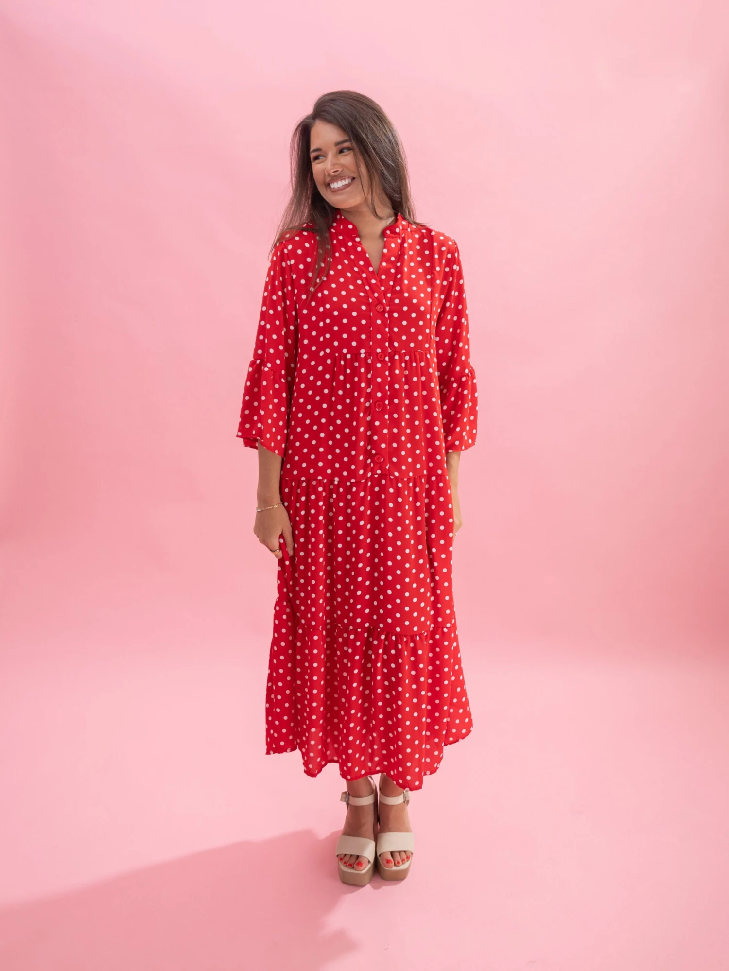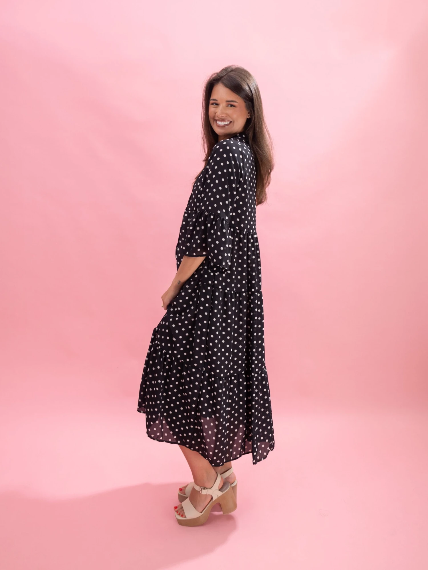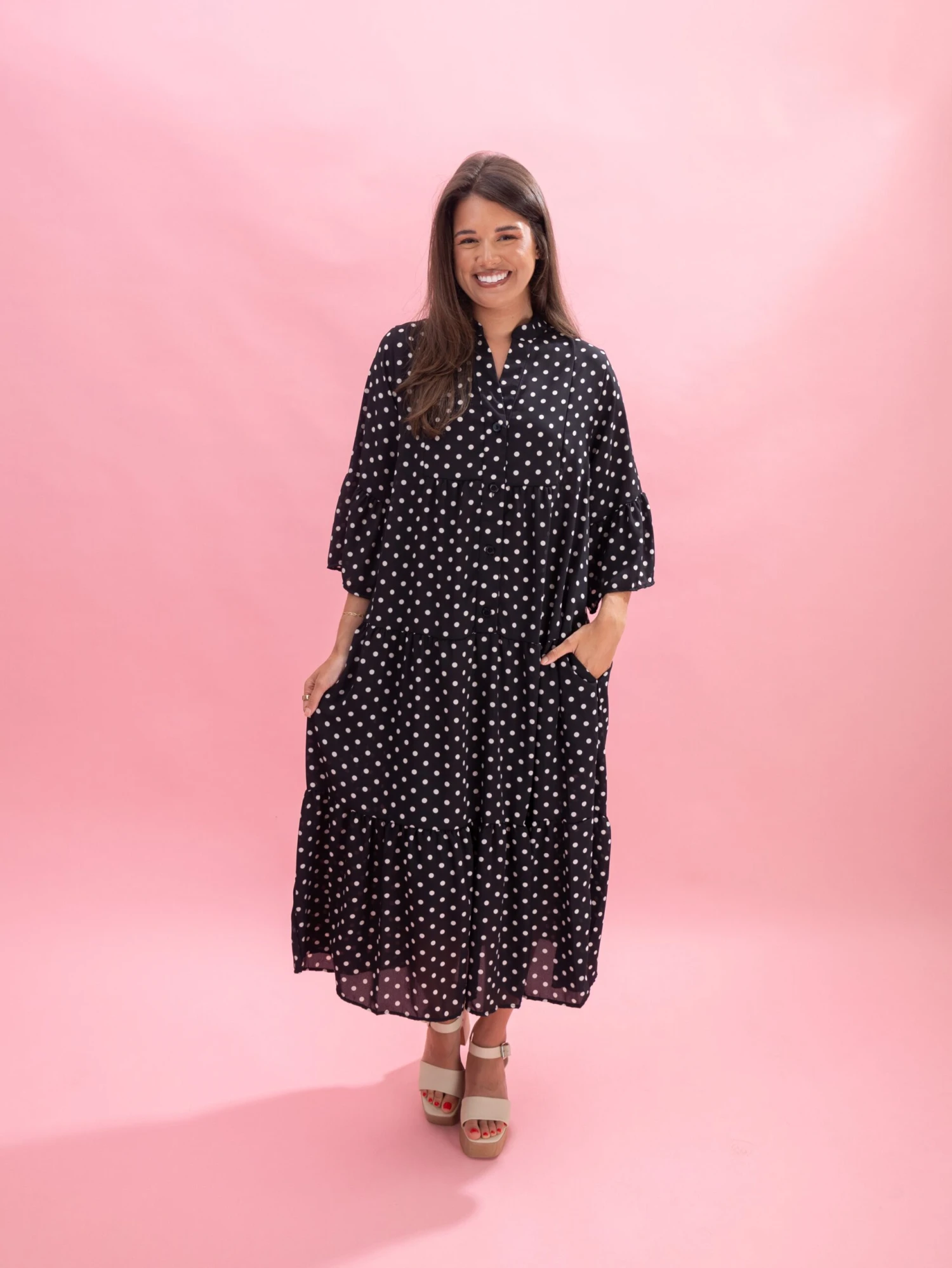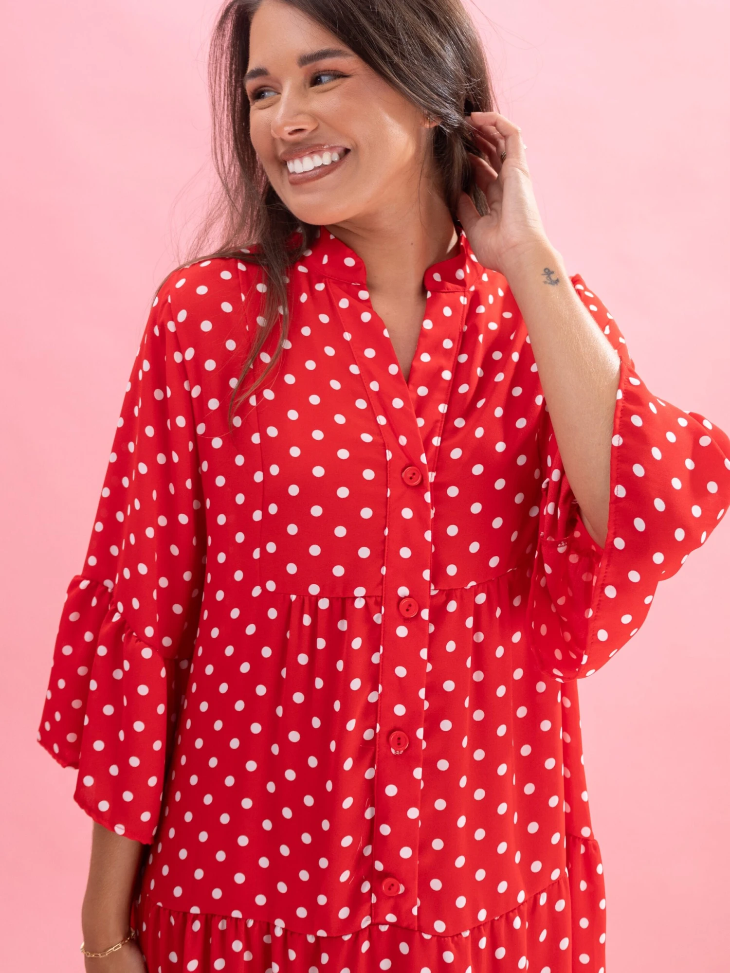 Features: V Neck, Half Button Up, Ruffle Half Sleeve, Pockets, Ruffle Hem, Polka Dot Dress