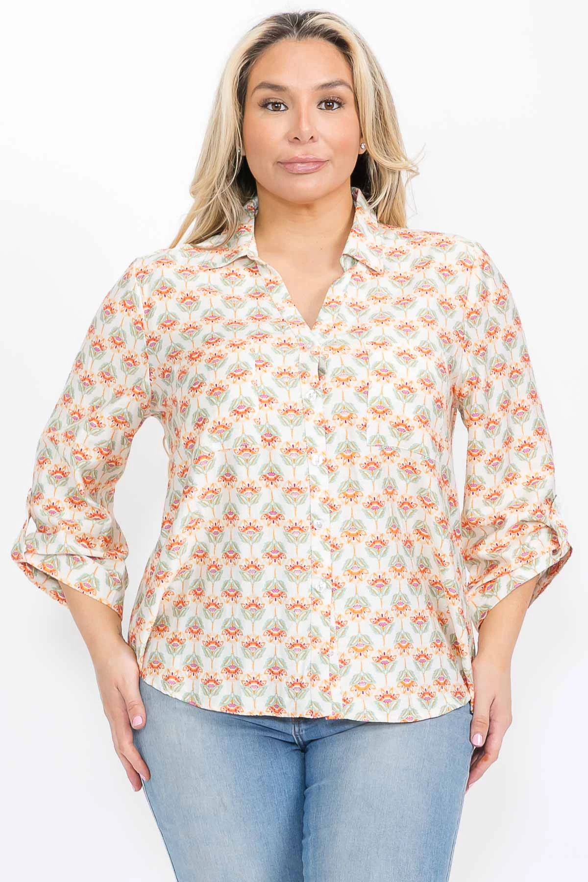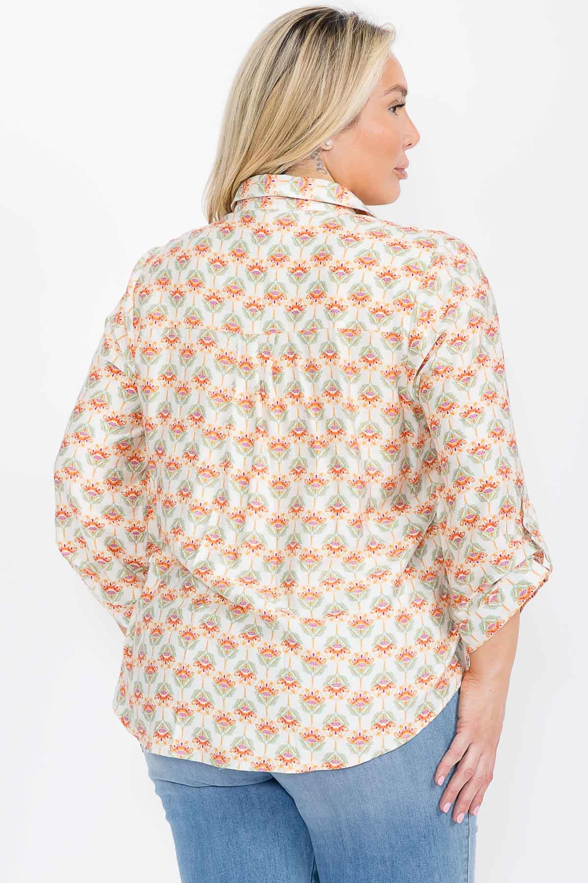 Features: Collar, Long Sleeves, Button Down, Printed