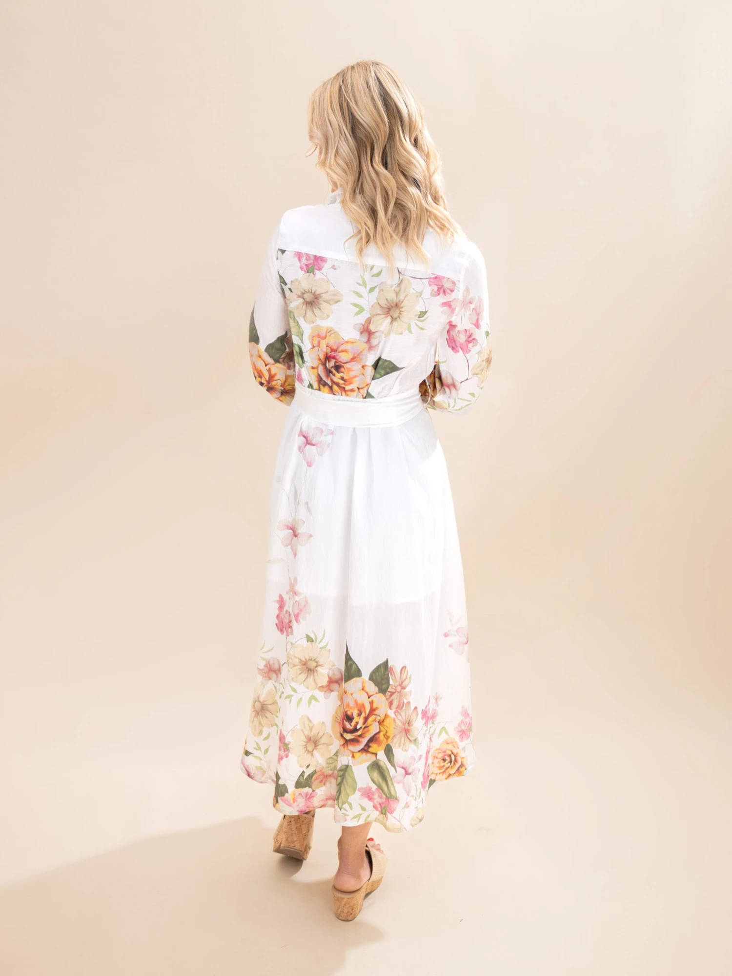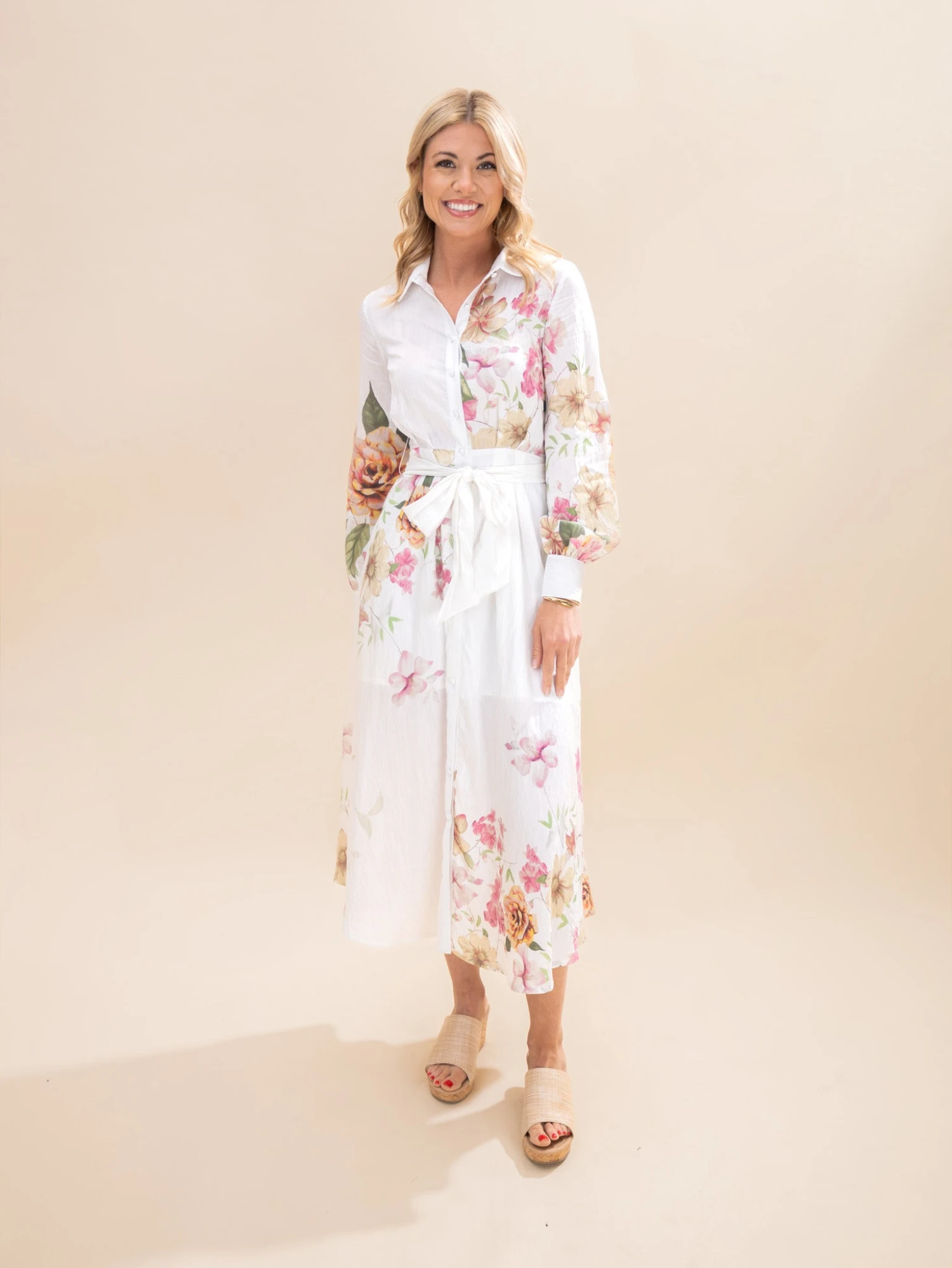 Features: Collar, Button Down, Long Sleeves, Tie Waist, Floral Printed Lined Maxi Dress