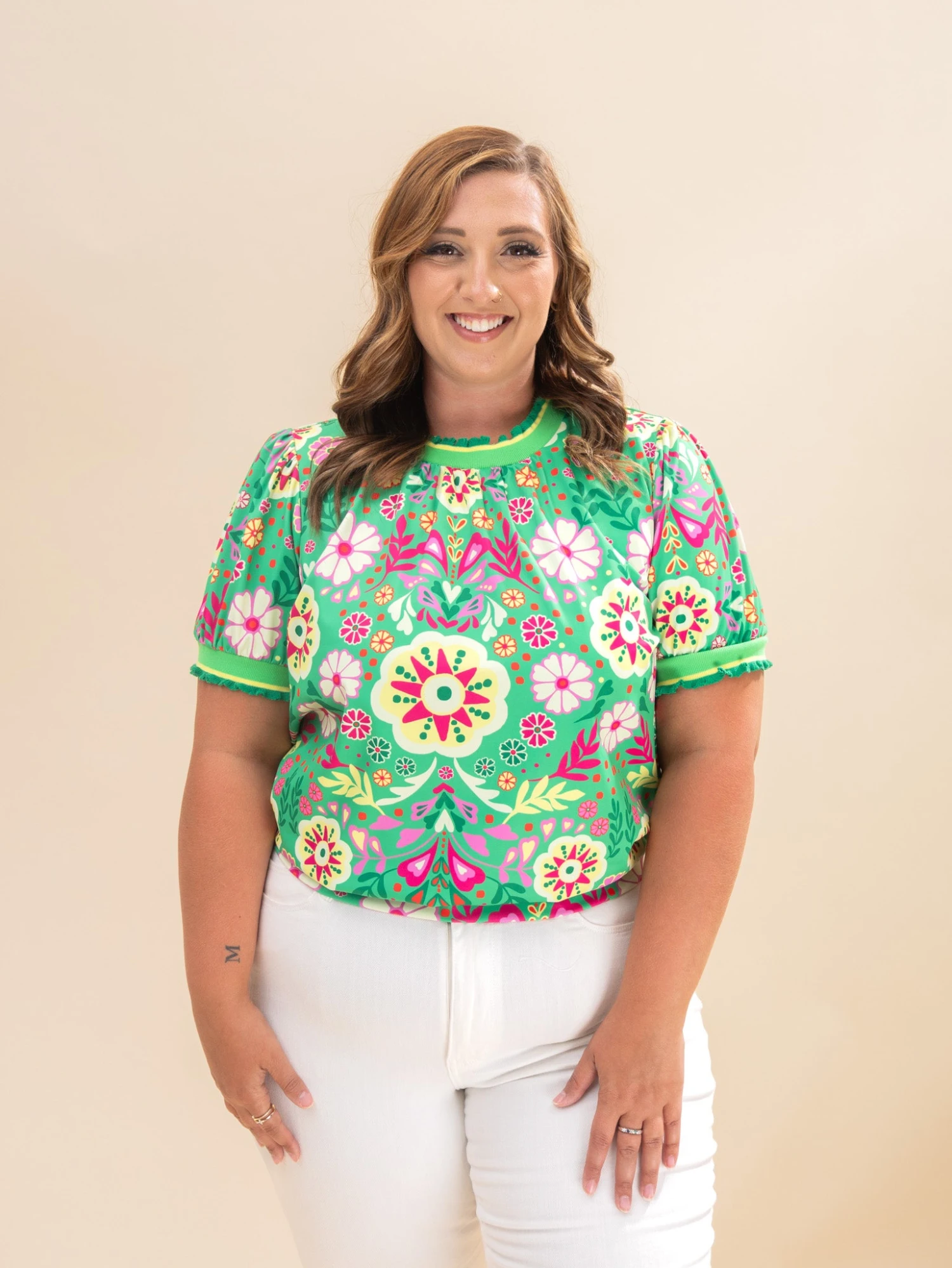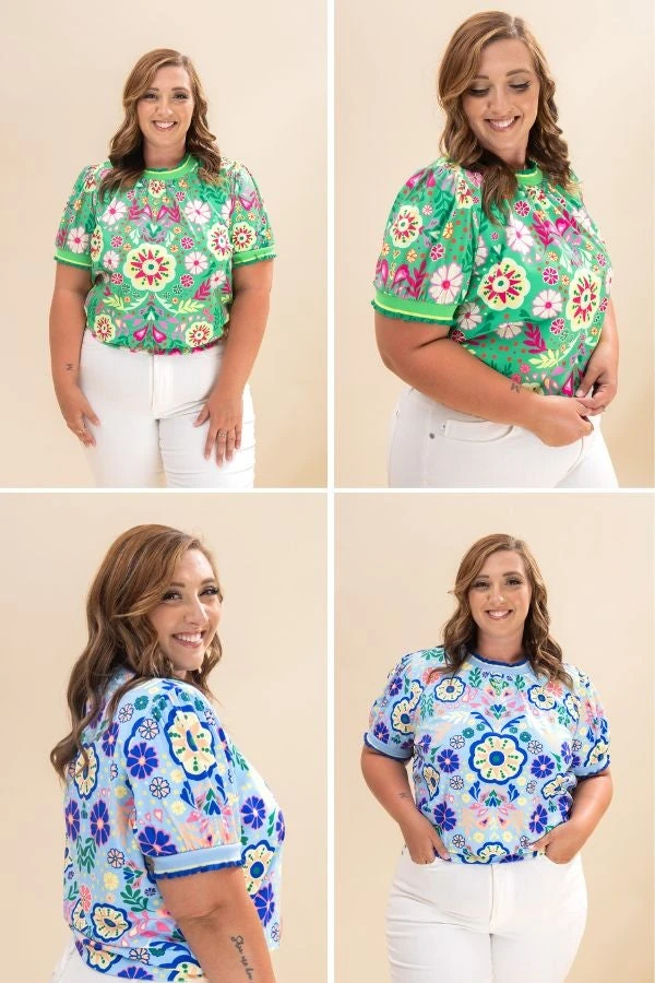 Features: Round Neck W/ Small Ruffle, Short Sleeves, Ruffle Ribbed Striped Band, Floral Printed