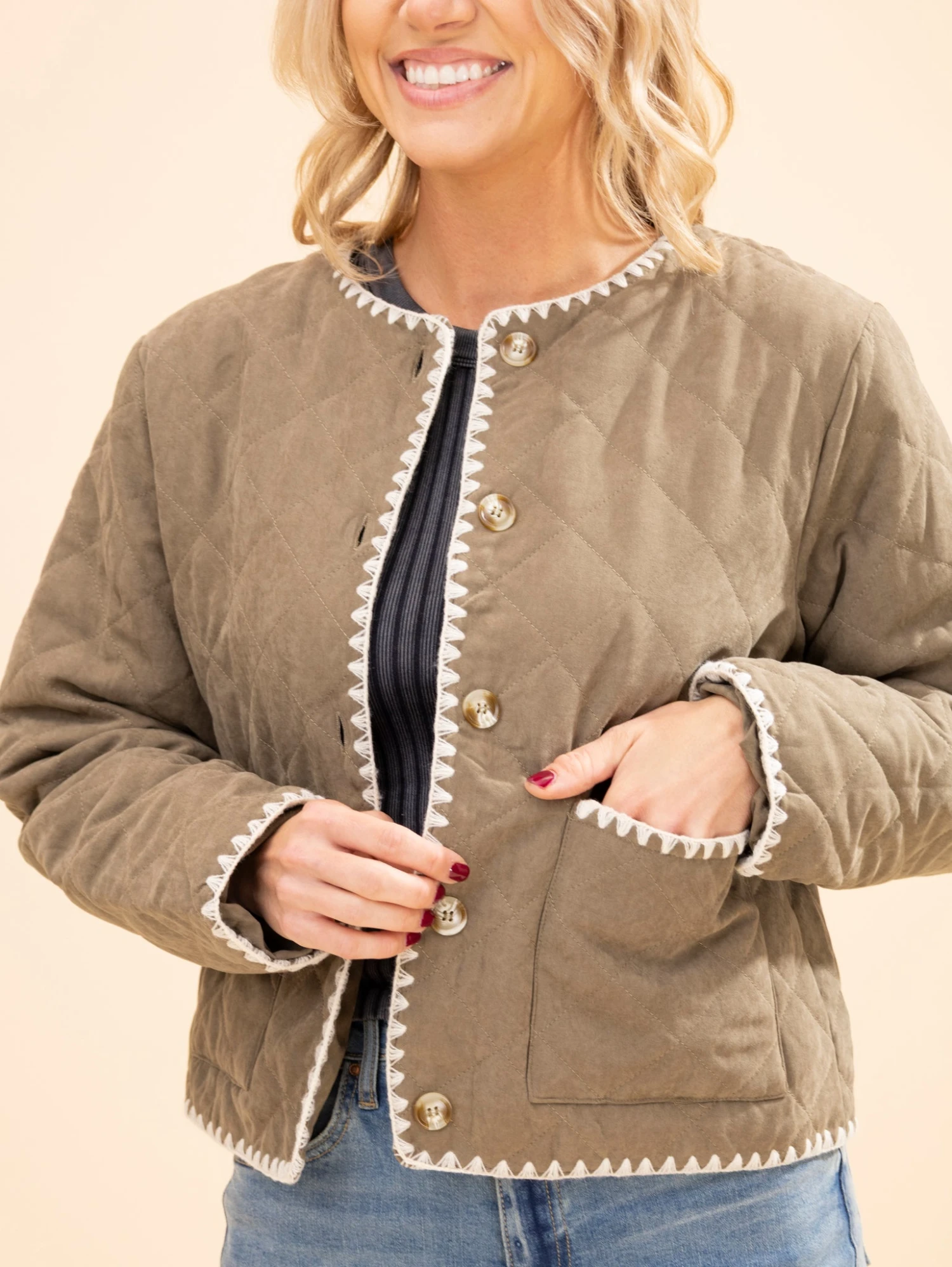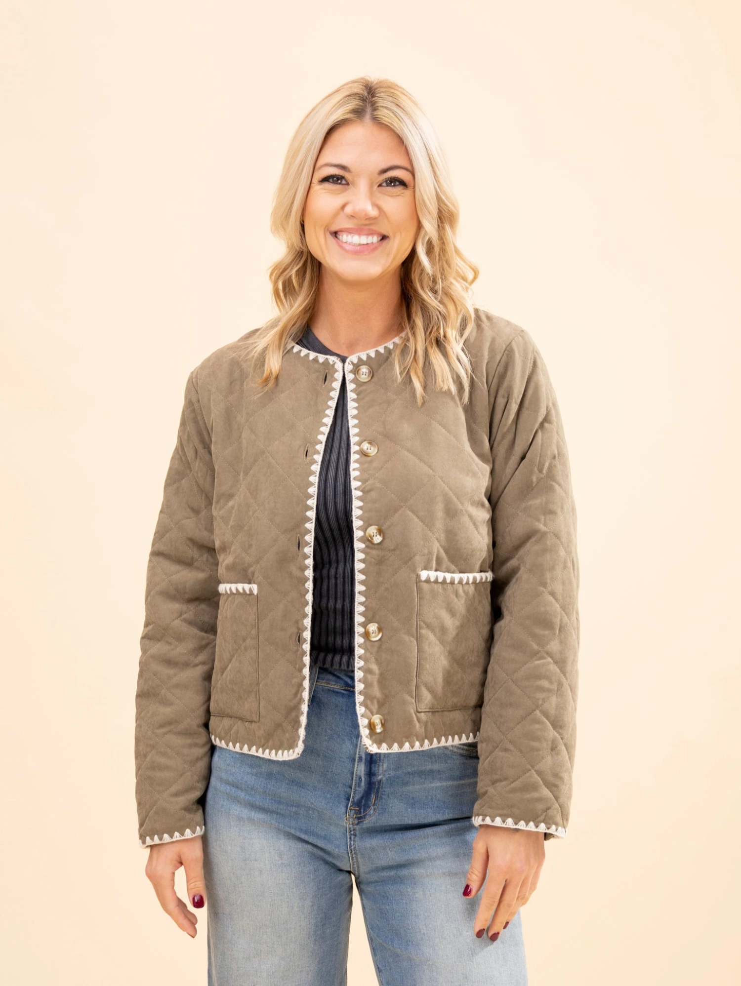 Features: Round Neck, Button Up, Long Sleeves, Patch Pockets, Solid W/ Stitching Trim, Quilted