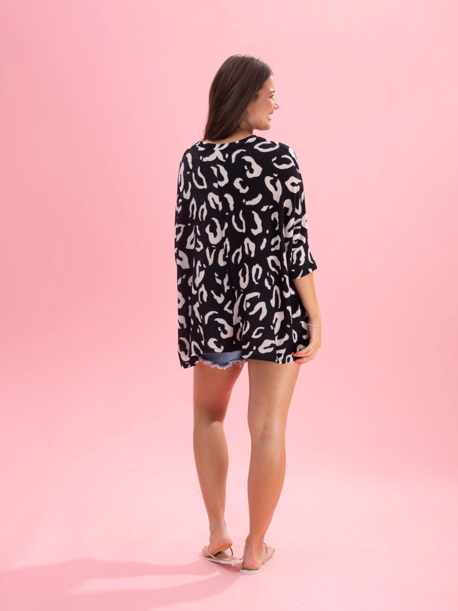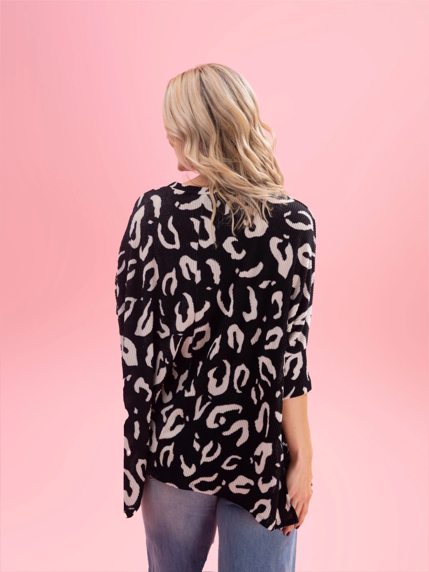 Features: Round Neck, 3/4 Sleeve, Side Slits, Raised Rib, Oversized, Leopard Print