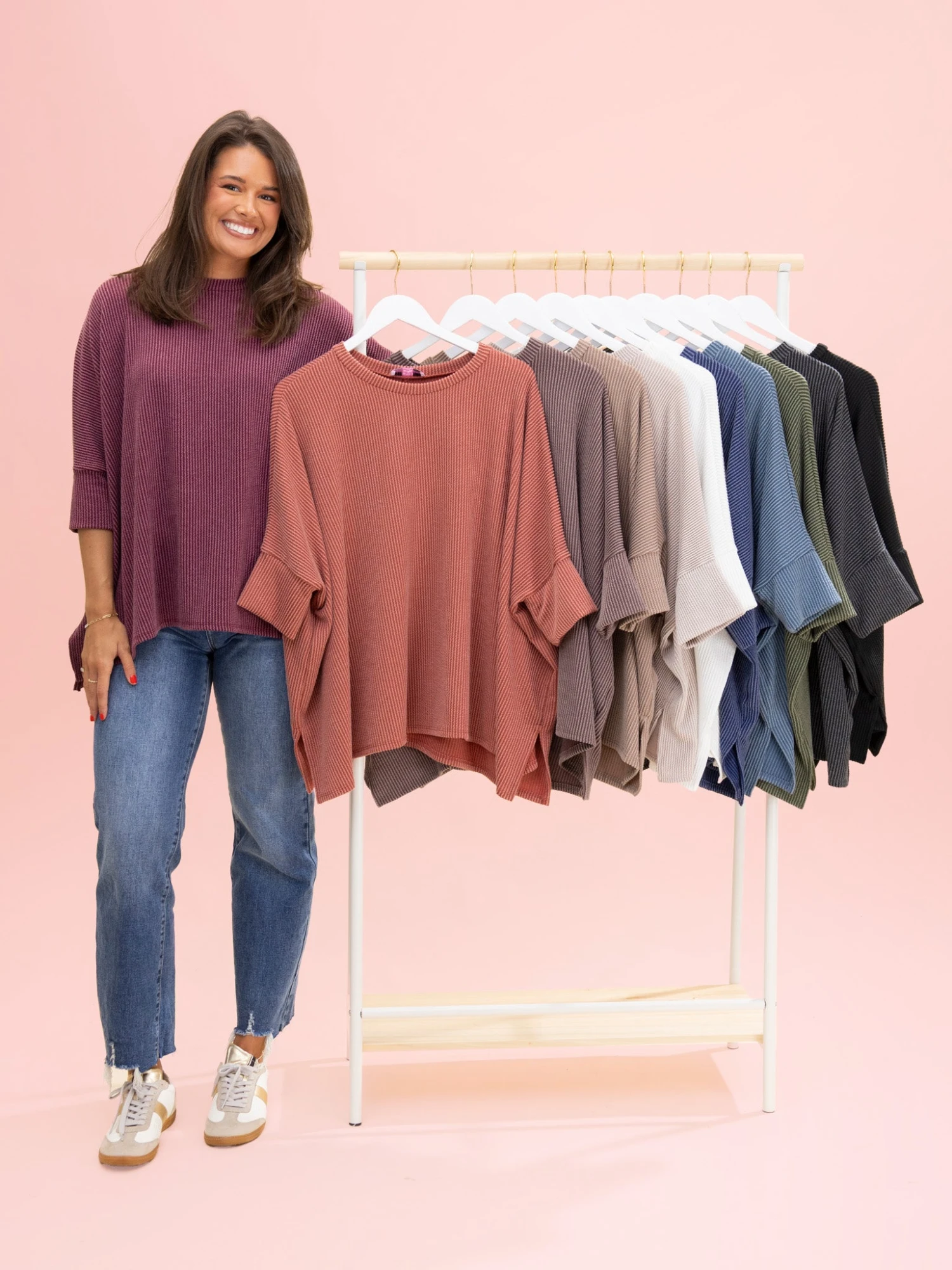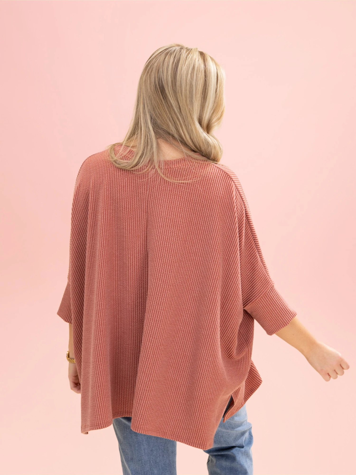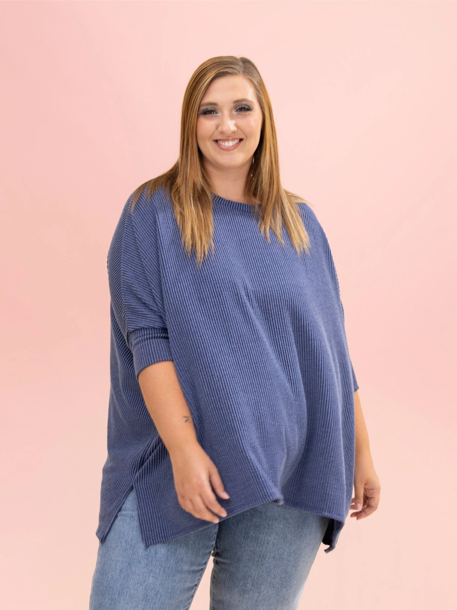 Erin is 5’8, 36C bra, typically wears size L/XL in tops and 14/15 in denim. Wearing size Plus. This fits oversized and flowy so if you are between sizes you can size down.