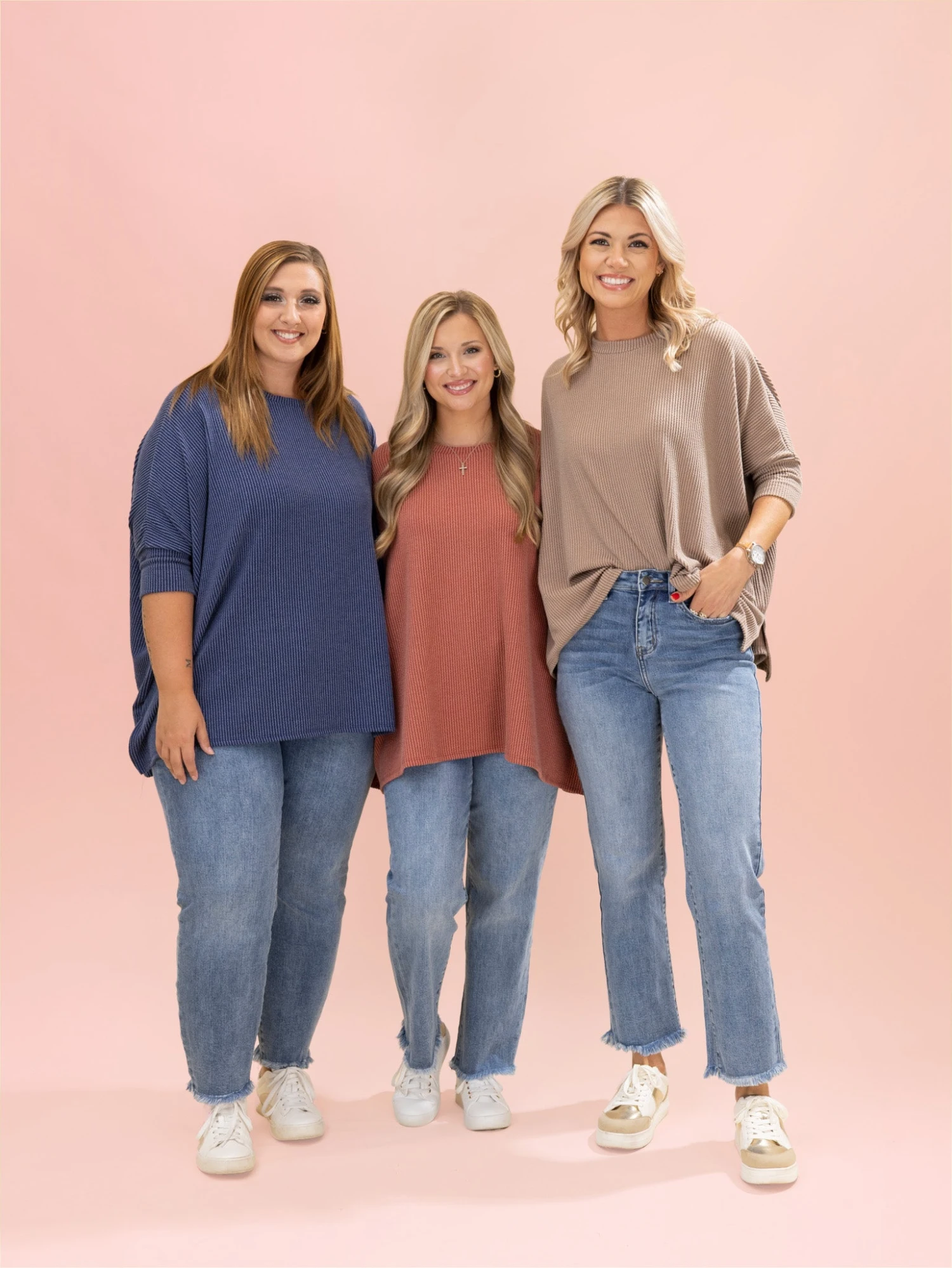 Crimsen (long blonde hair) is 5’1, 34B bra, typically wears size S in tops and 3 in denim. Wearing size Reg