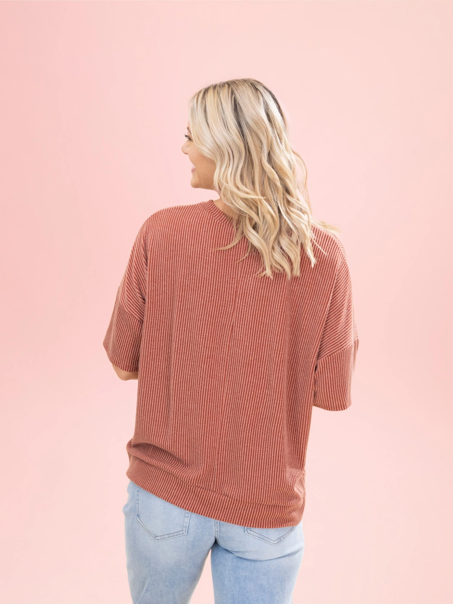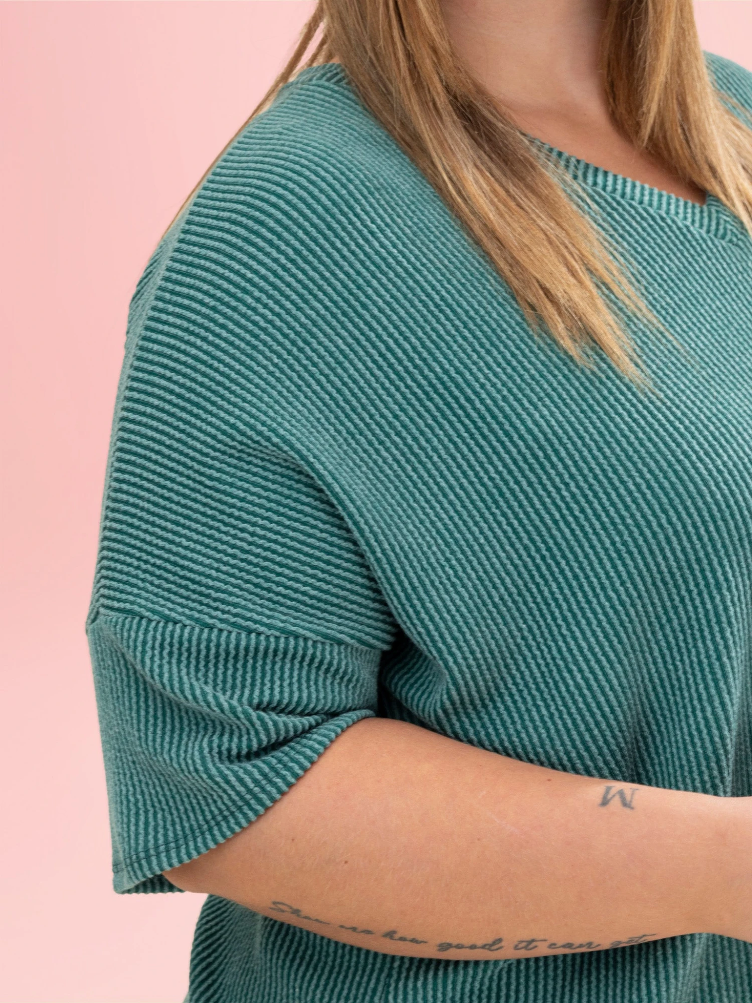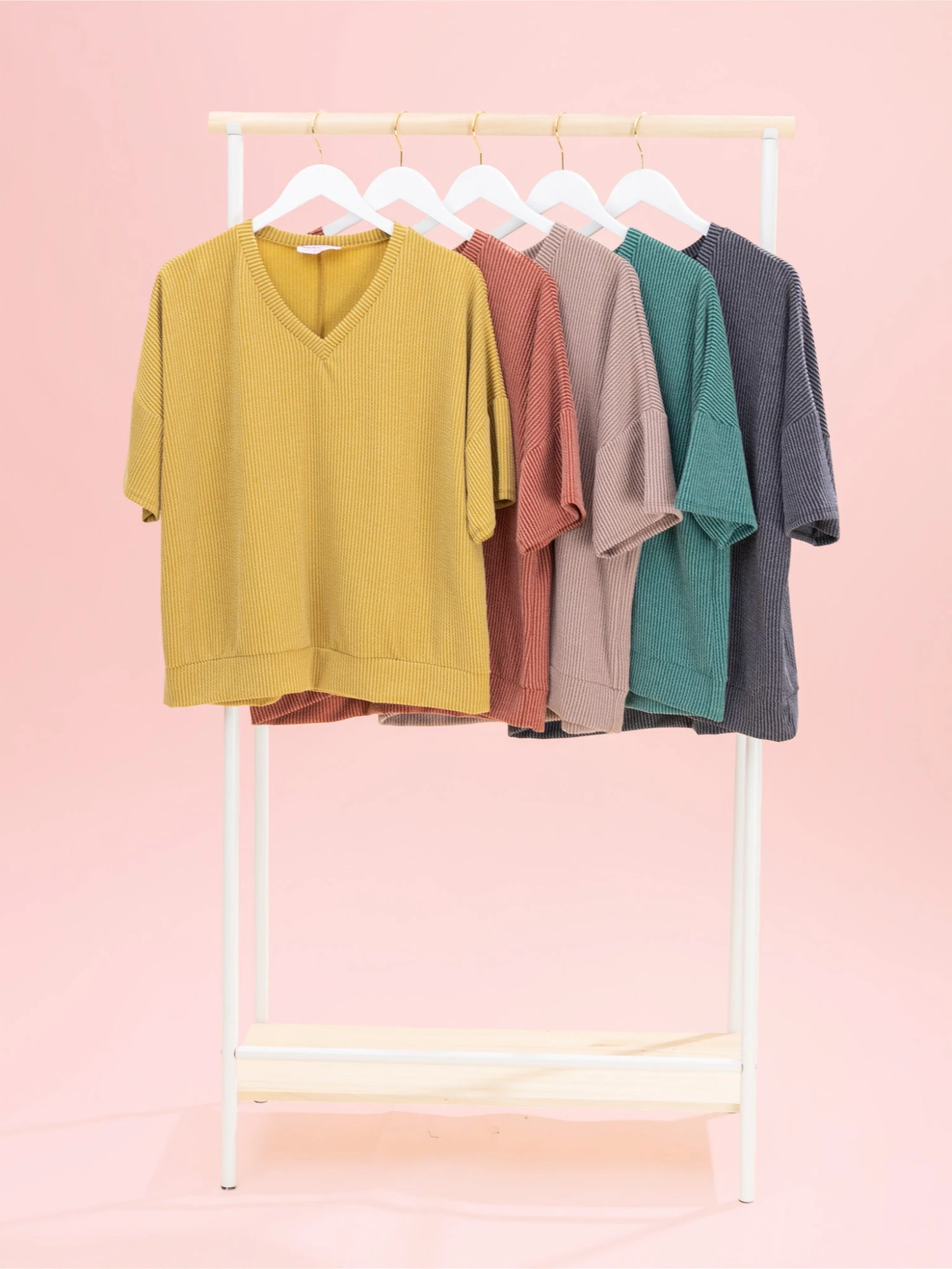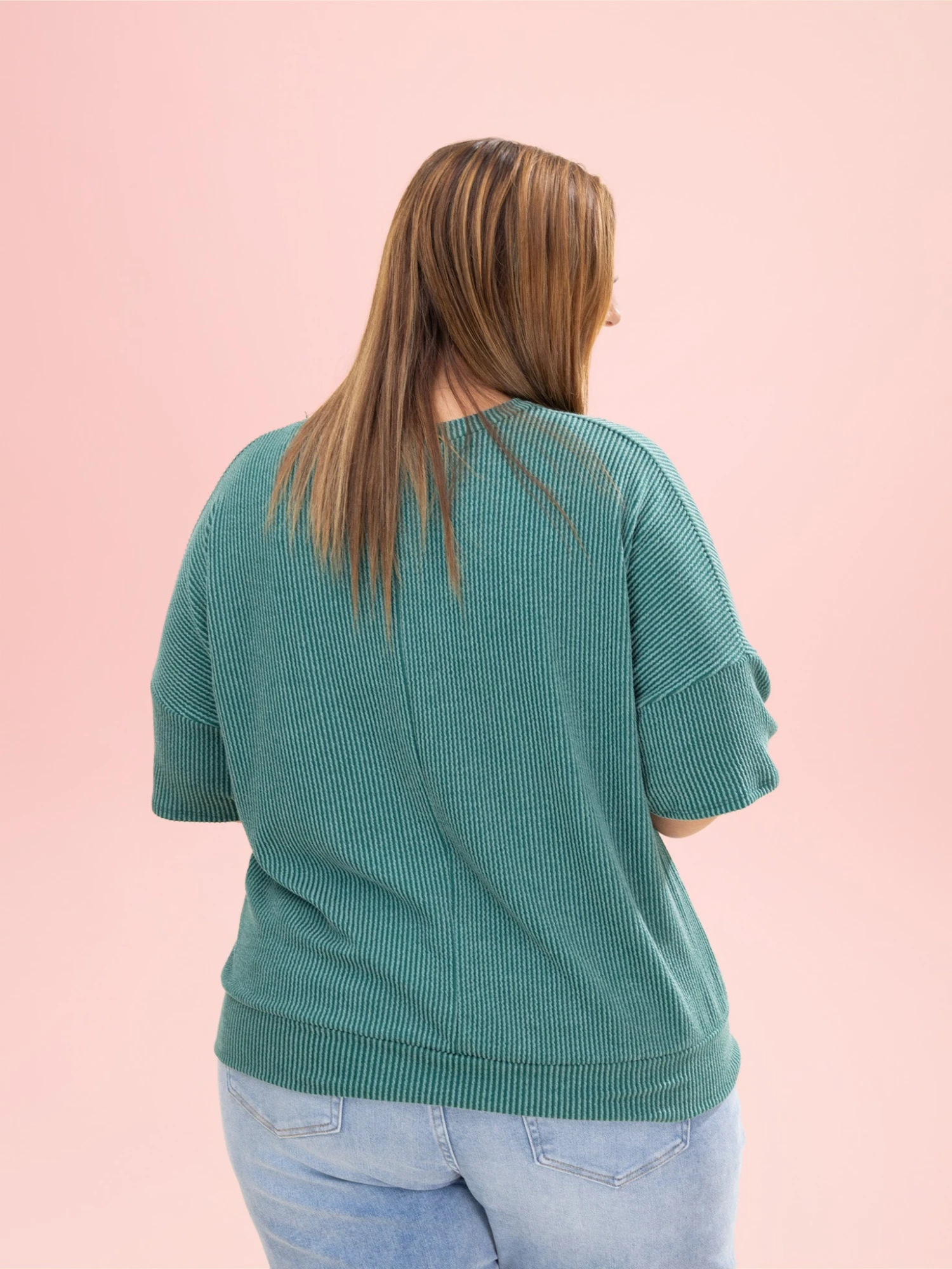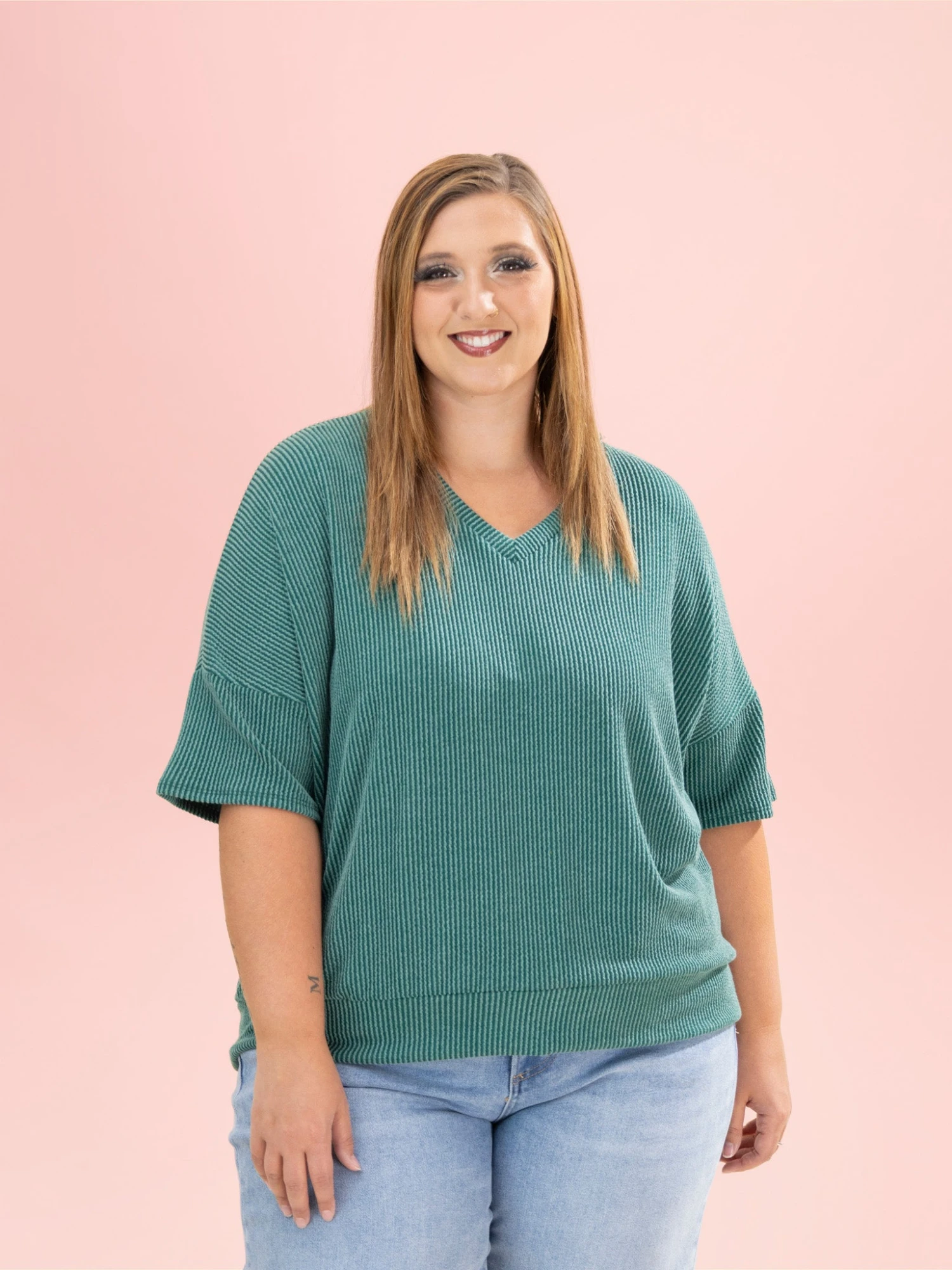 Features: V Neck, Half Sleeve, Banded Hem, Raised Rib Top