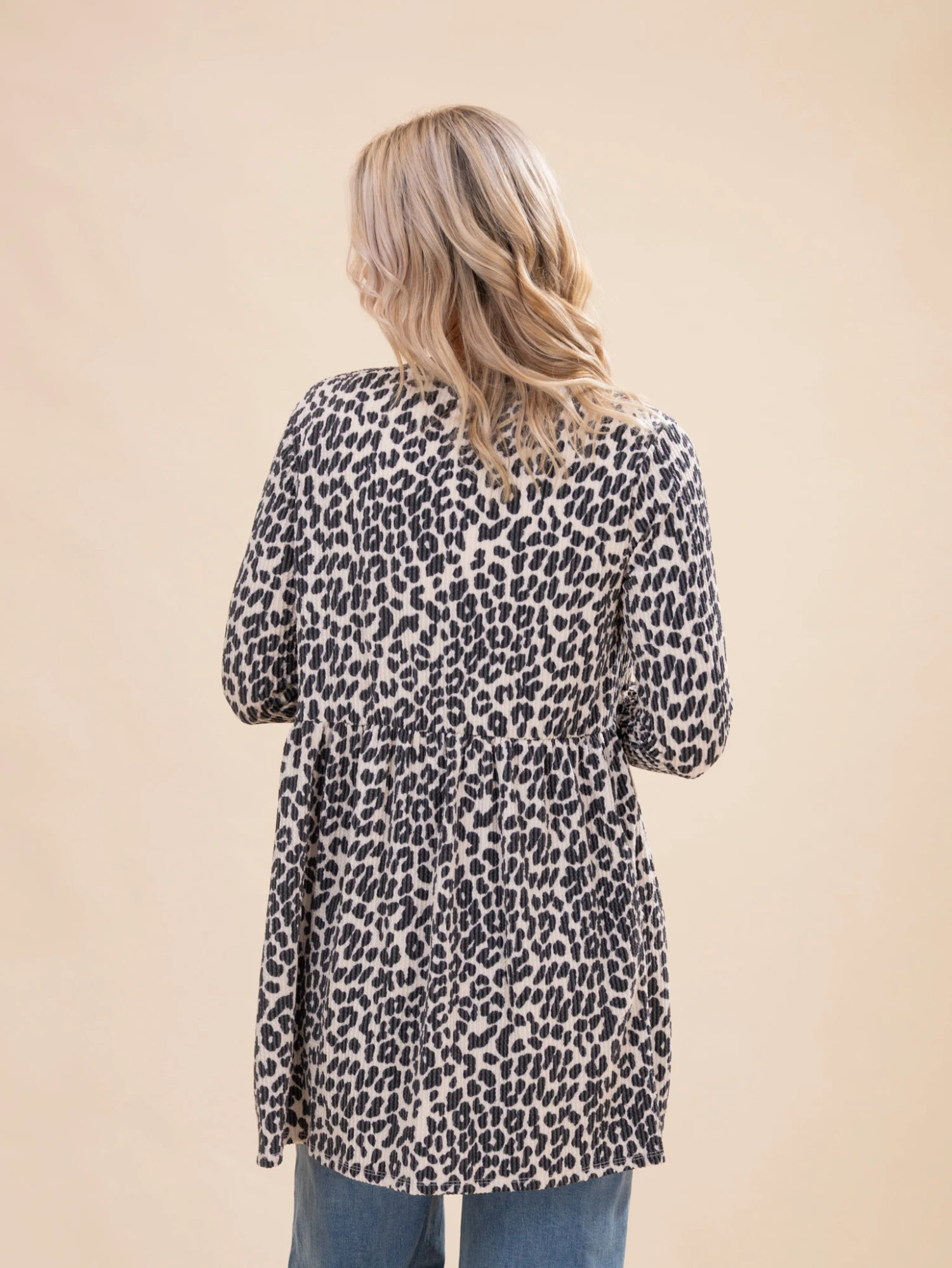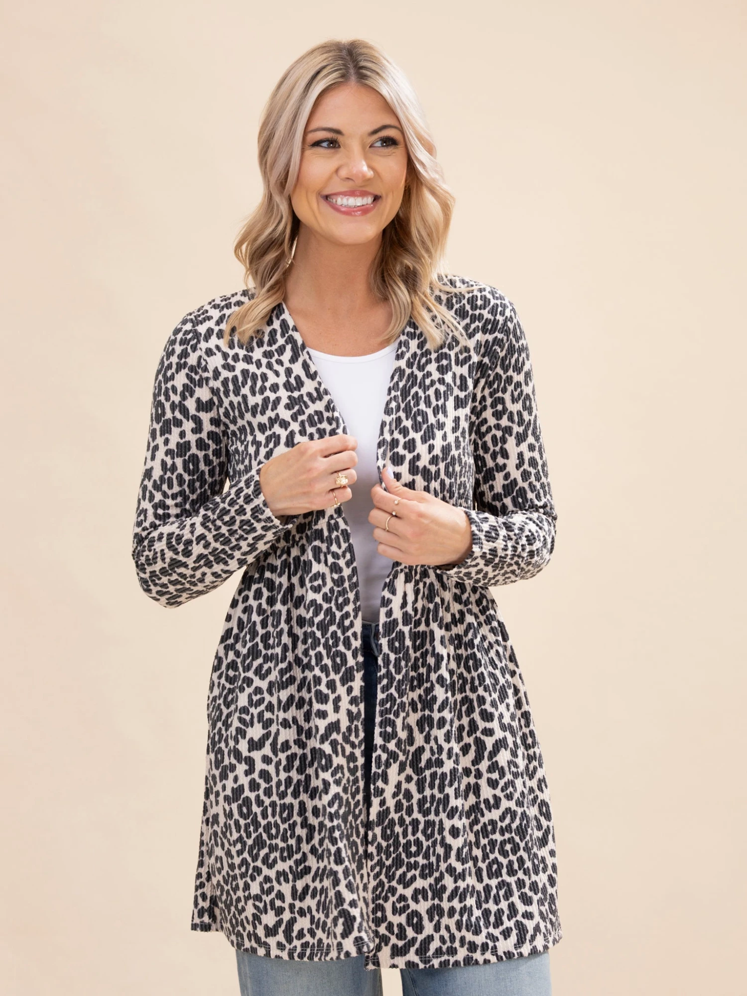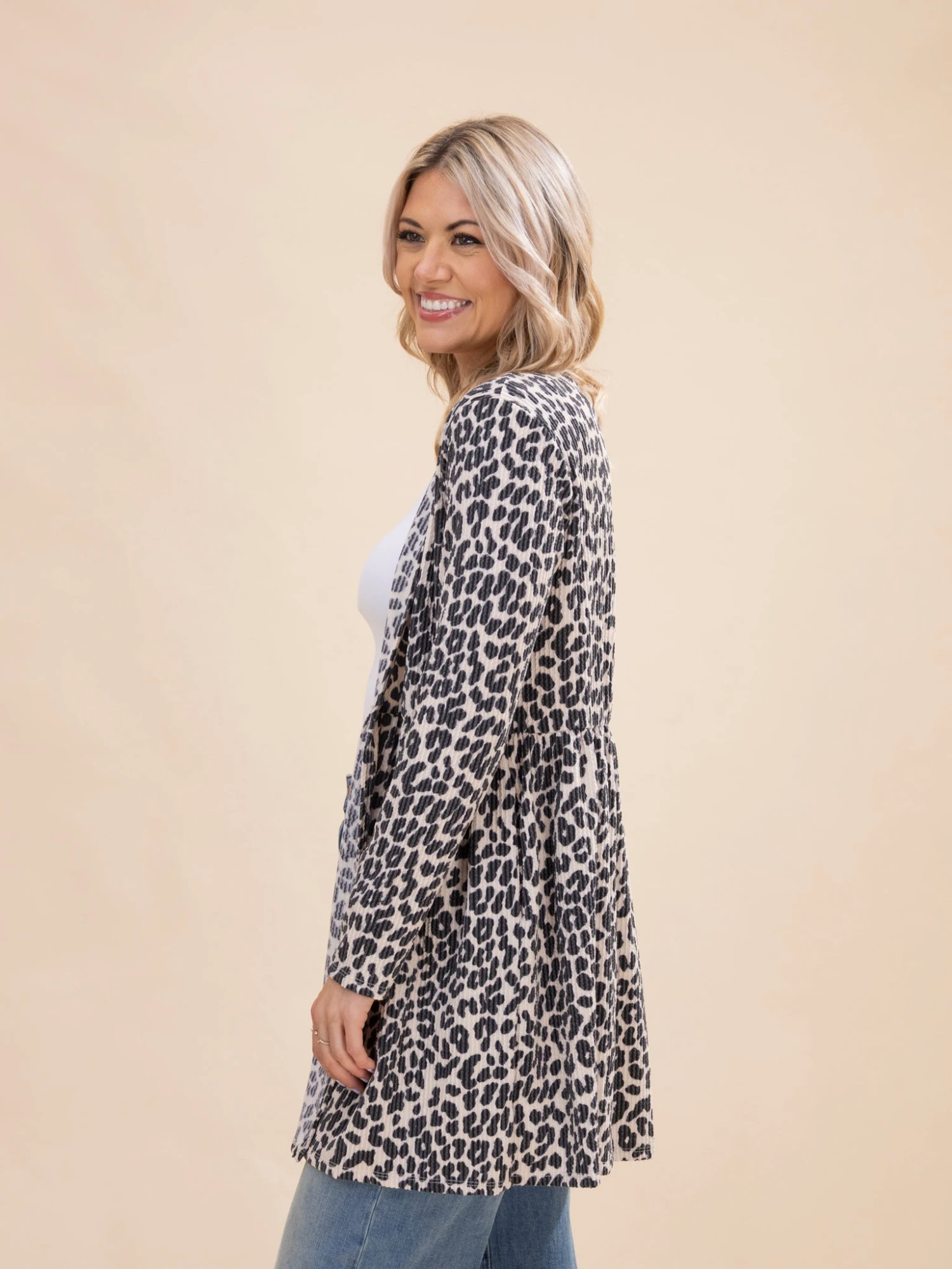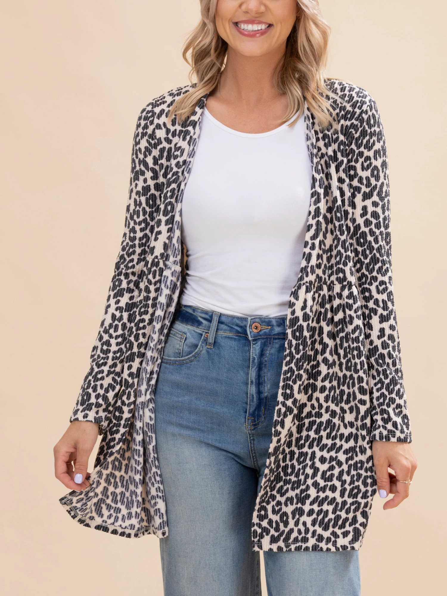 Features: Open Front, Long Sleeves, Pockets, Ruffle Hem Detail, Animal Print Raised Rib Cardigan