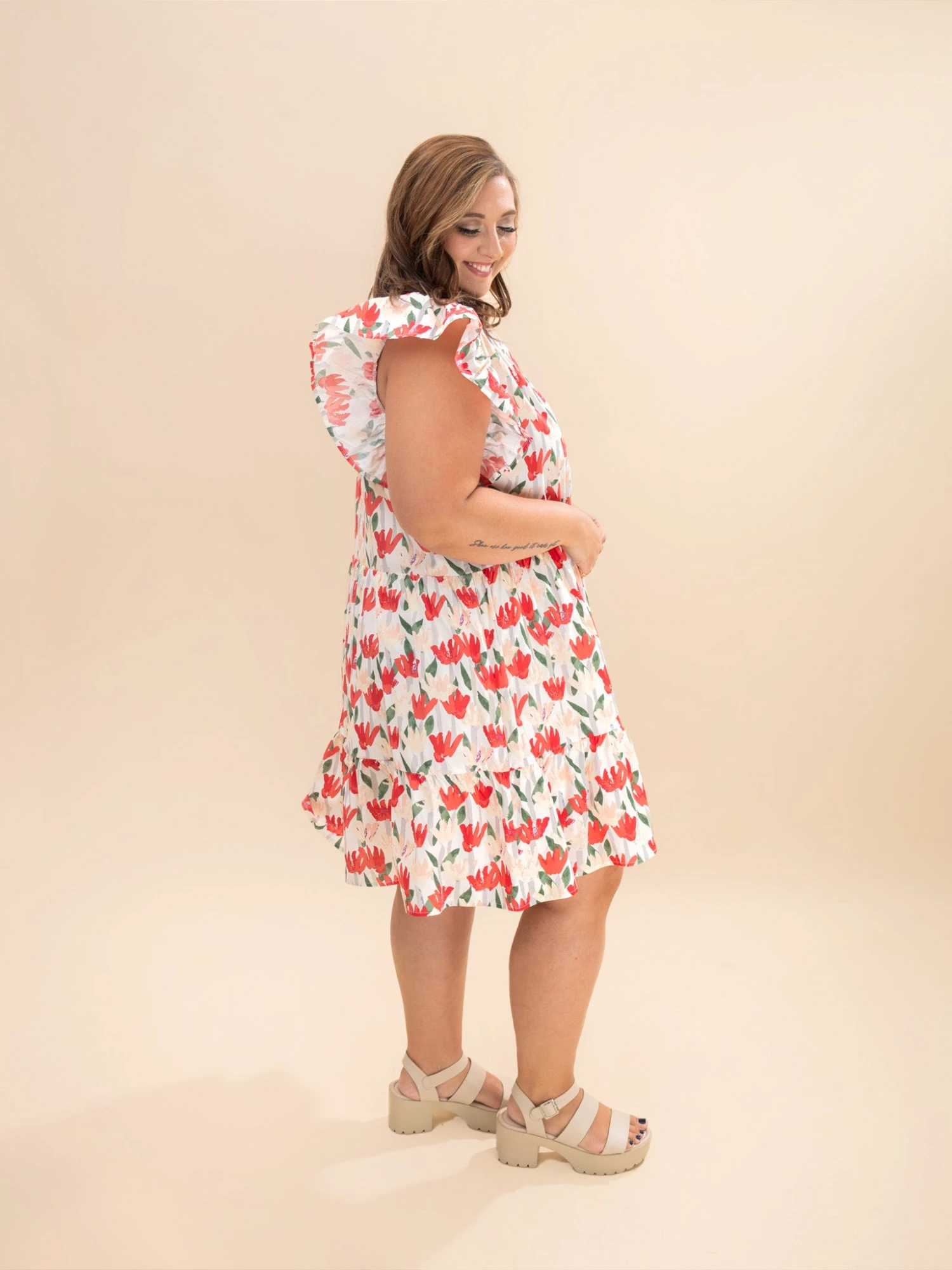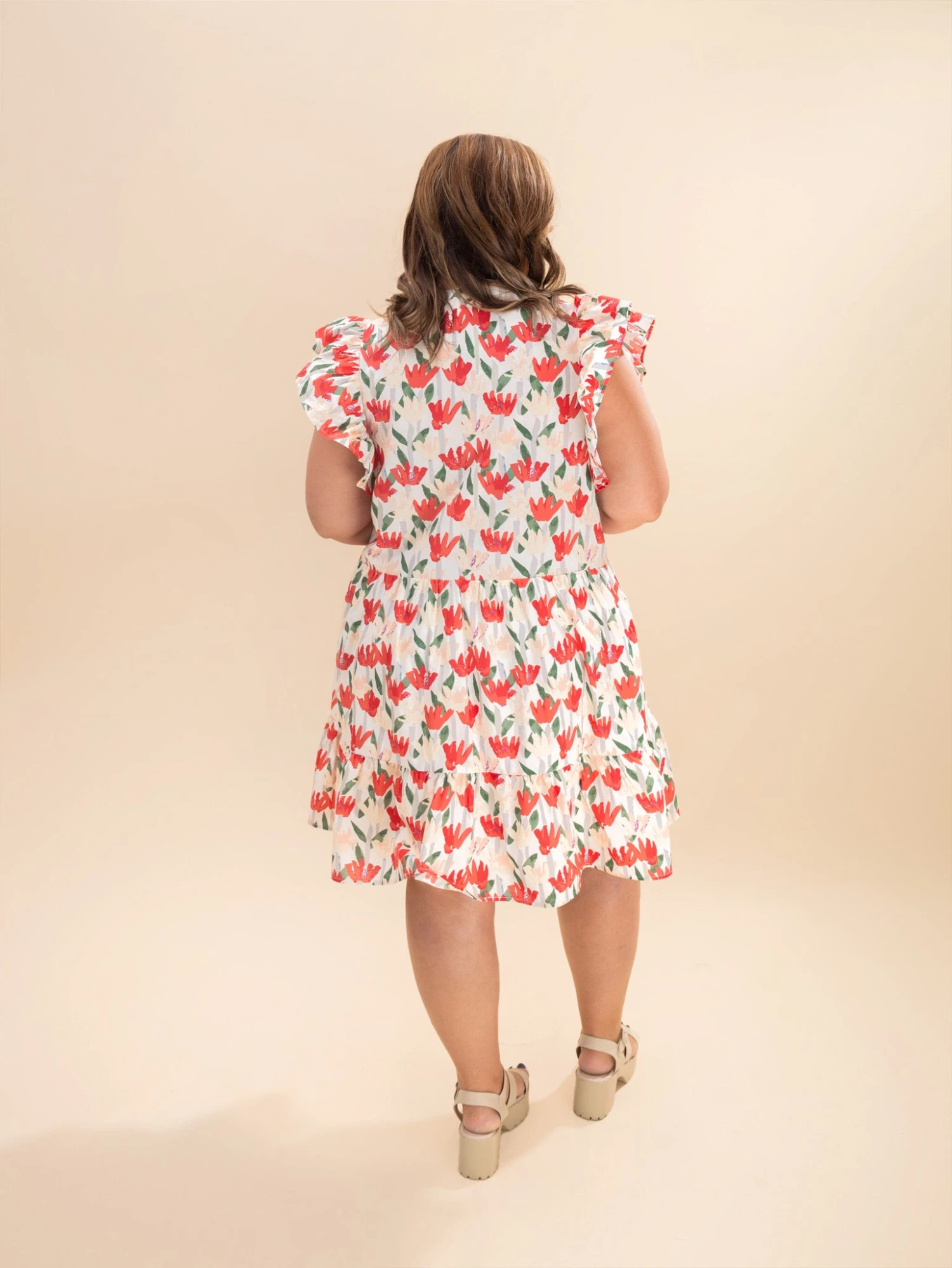Features: Split Neck, Half Button Up, No Pockets, Lined, Flutter Sleeves, Printed Tiered Loose Fit
