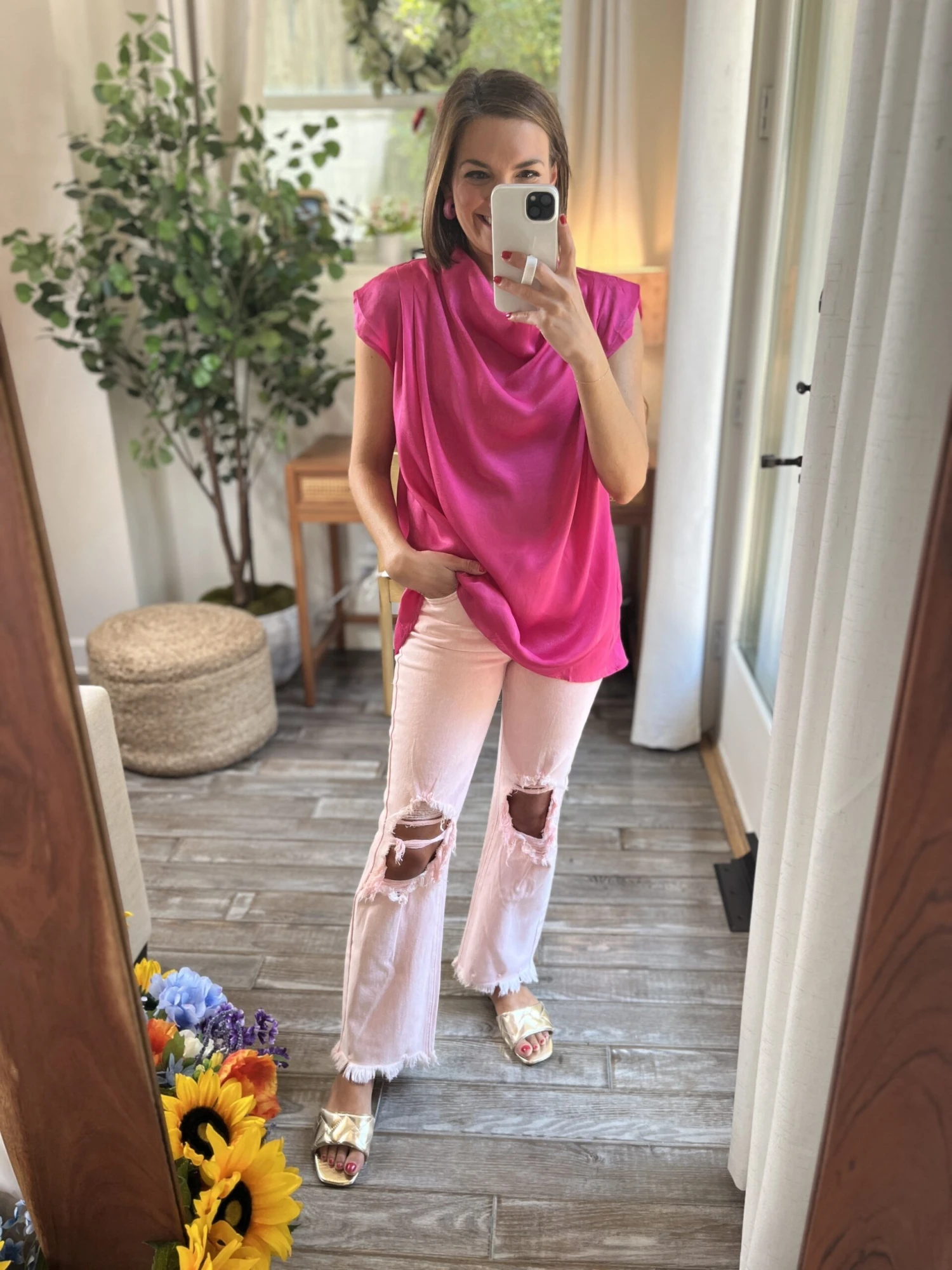 The “Returning Love Top” is just what you have been looking for! This stylish cowl neck design is beautifully bold and colorful! With some cute cap sleeves, you can channel your inner Barbie in this one! Don’t miss out here!