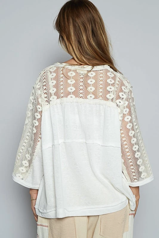 Features: Round Neck, 3/4 Sleeve, Crochet Contrast, Relaxed Fit, Top