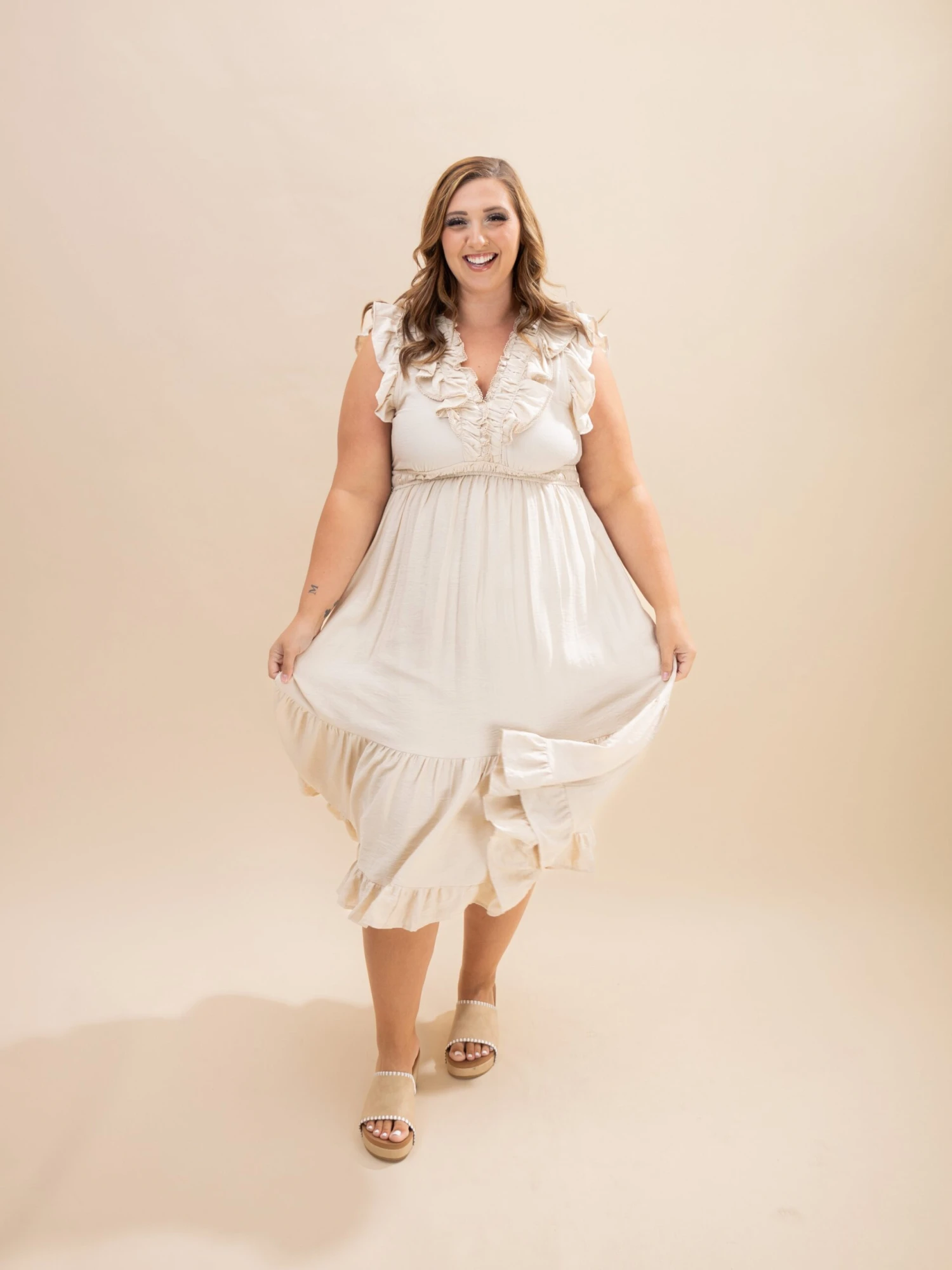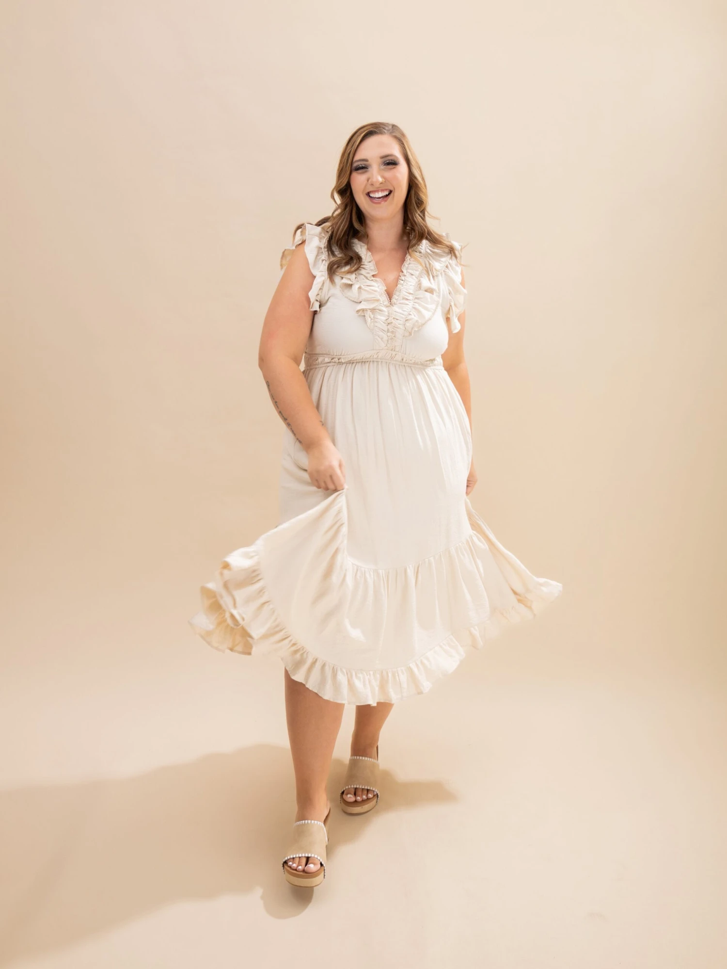 Features: V Neck W/ Ruffle Detail, Flutter Sleeves, Pockets, Lined Midi Dress