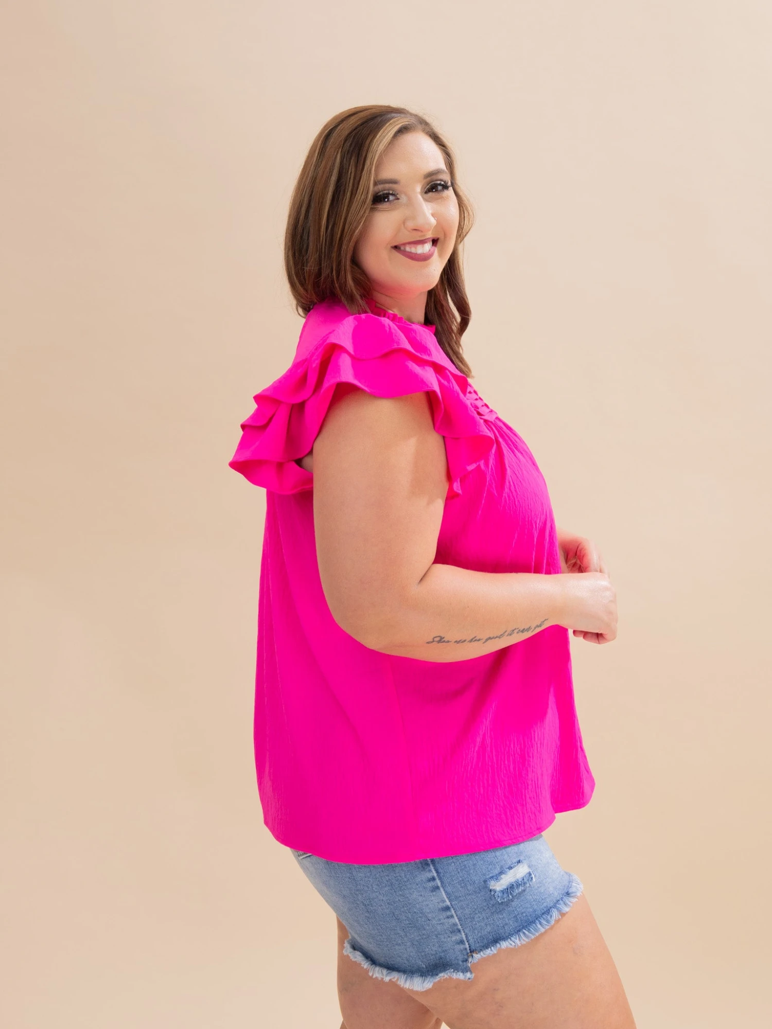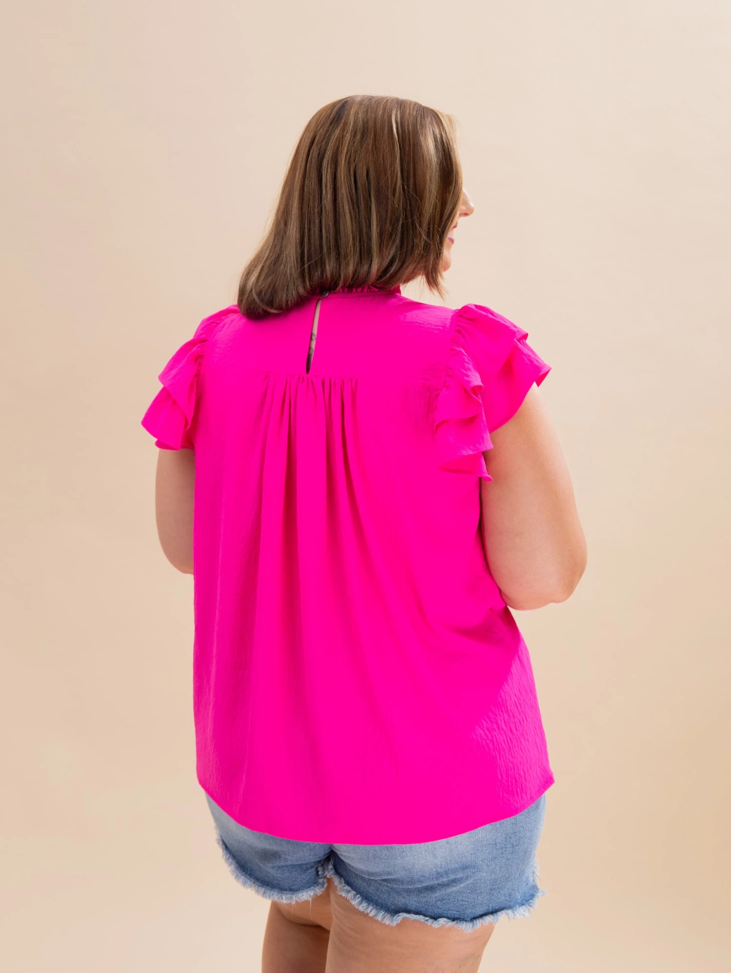 Features: Ruffle Neck, Flutter Sleeves, Solid Top