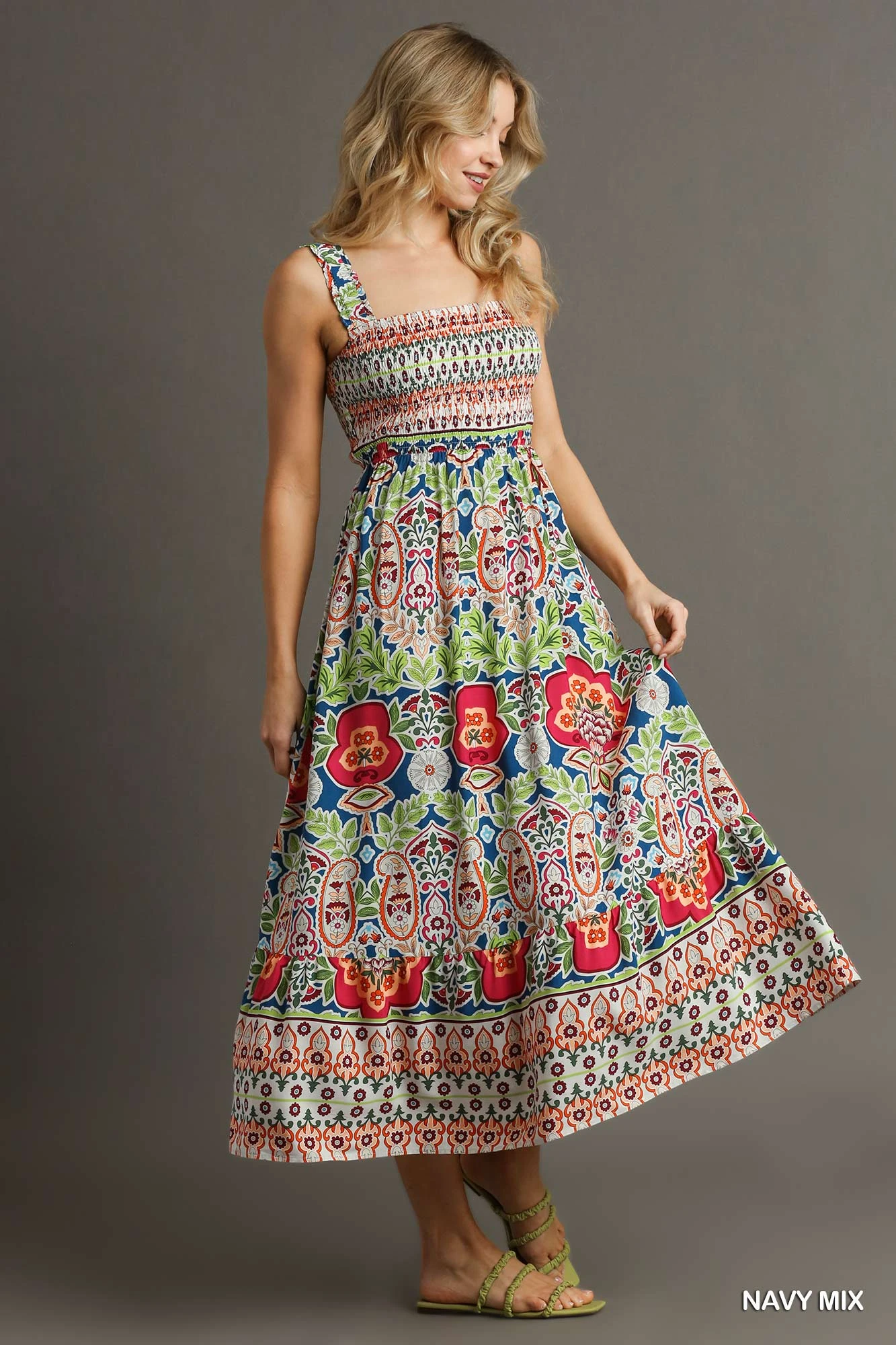 Satin A-Line Paisley Print Smocked Maxi Dress | S – L