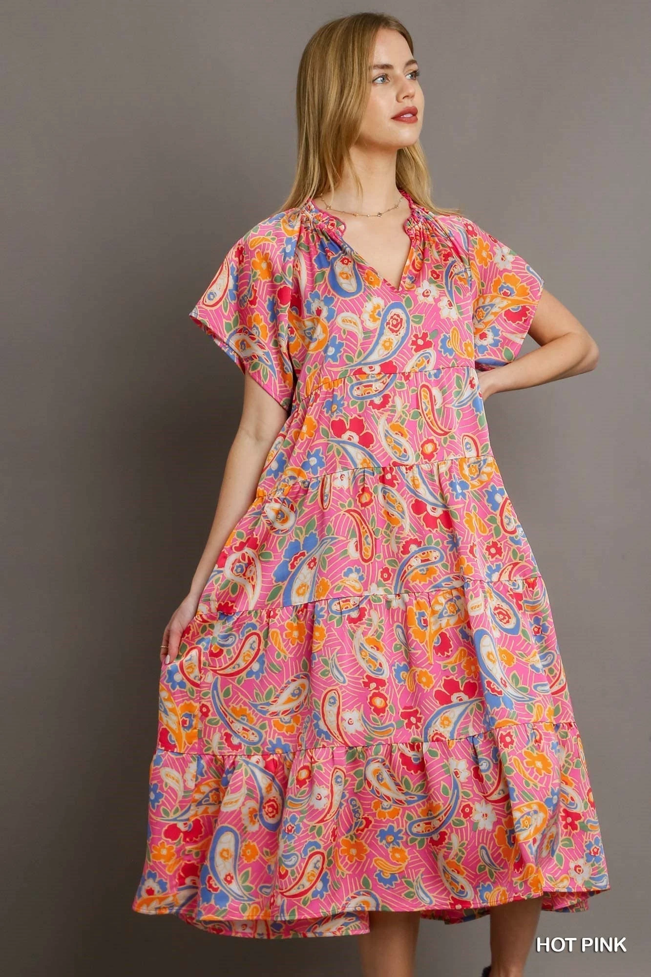 Features: Satin, Paisley, V-Neck, Maxi, Dress