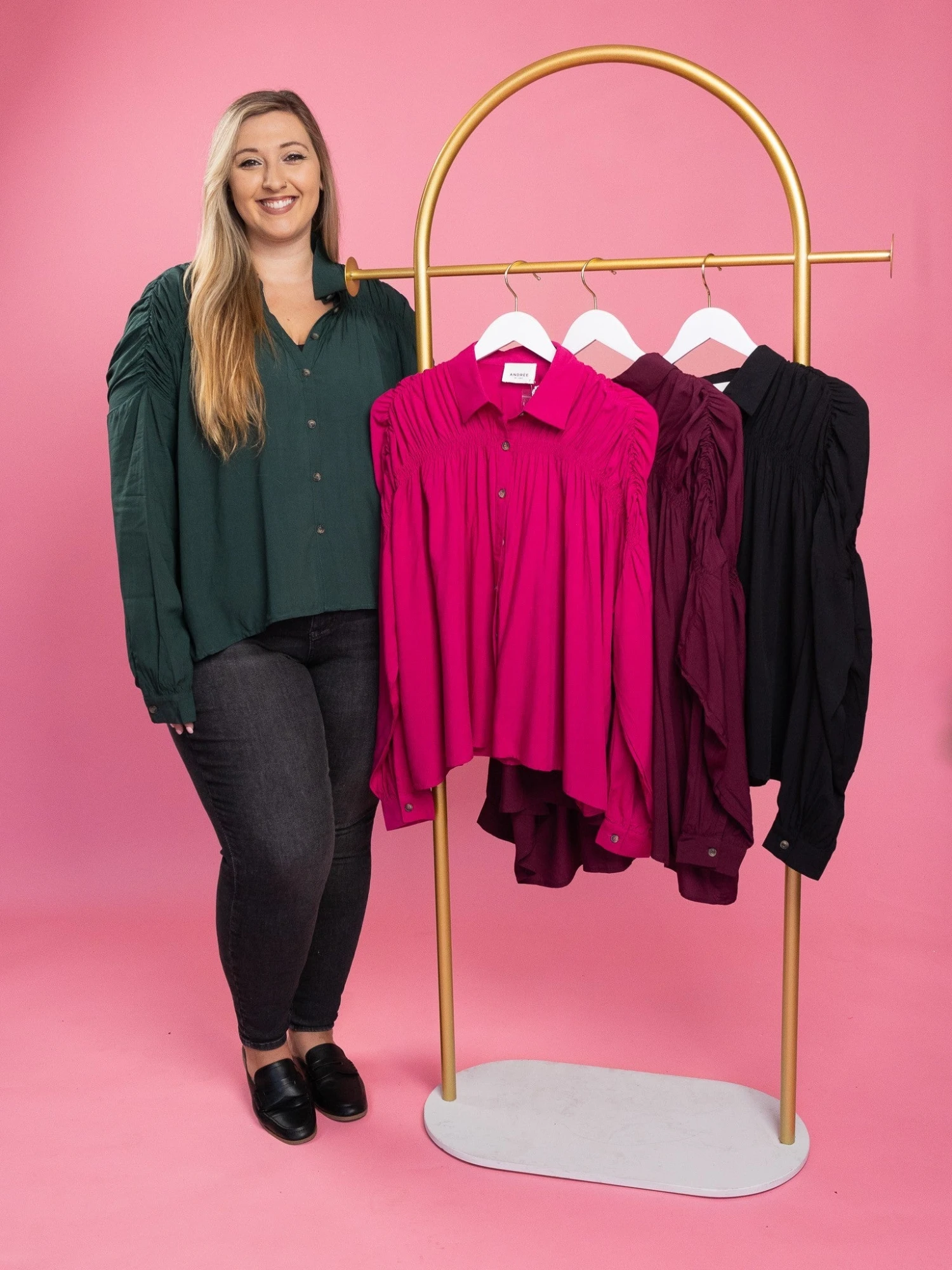 This blouse features shirred shoulders, adding a gorgeous texture to this classic summary-down collared top! Dress it down with jeans or up with slacks! You can’t go wrong with this piece!
