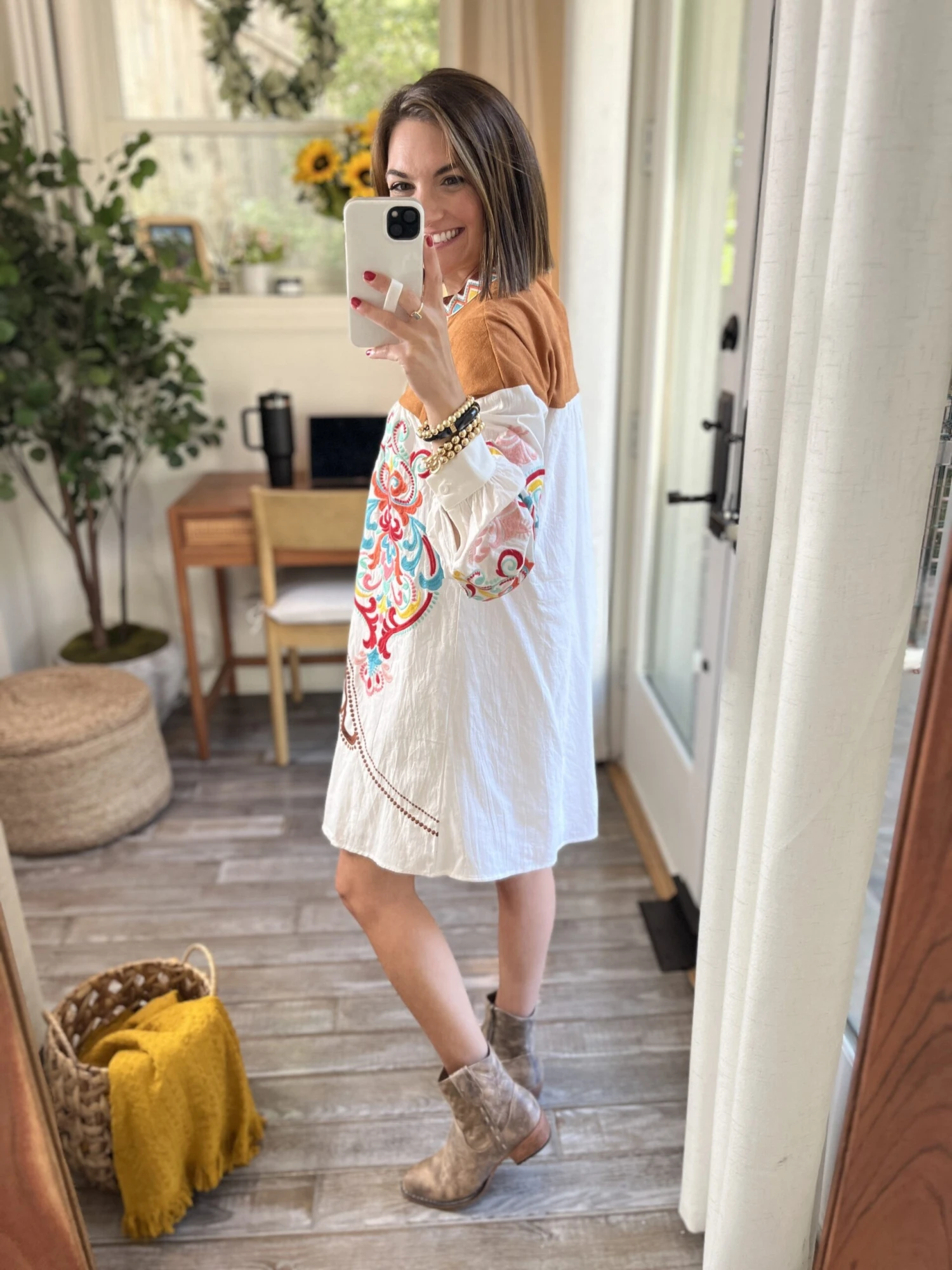 Features: Round Neck with Front Tie, Long Sleeves, Lined, Printed