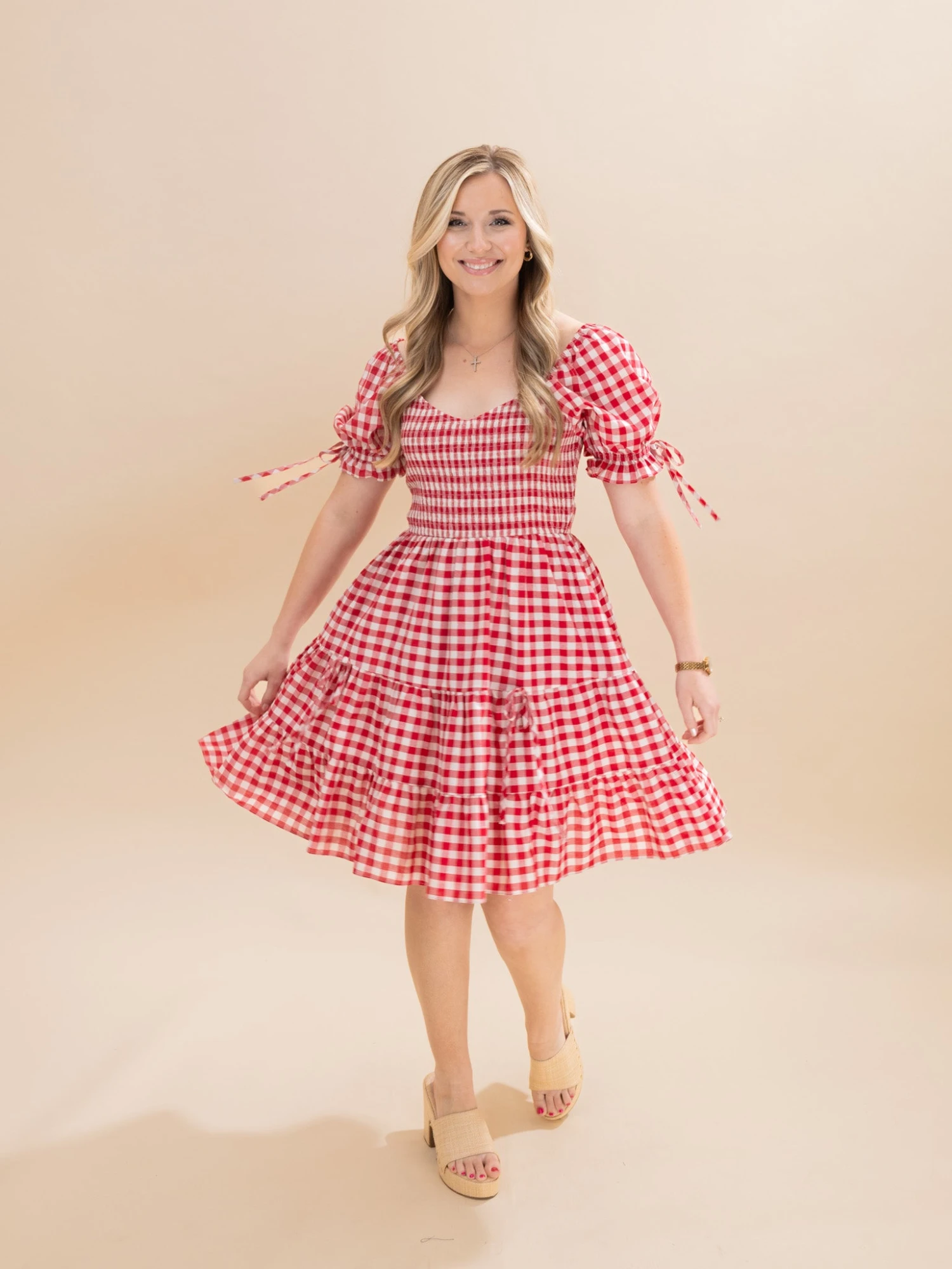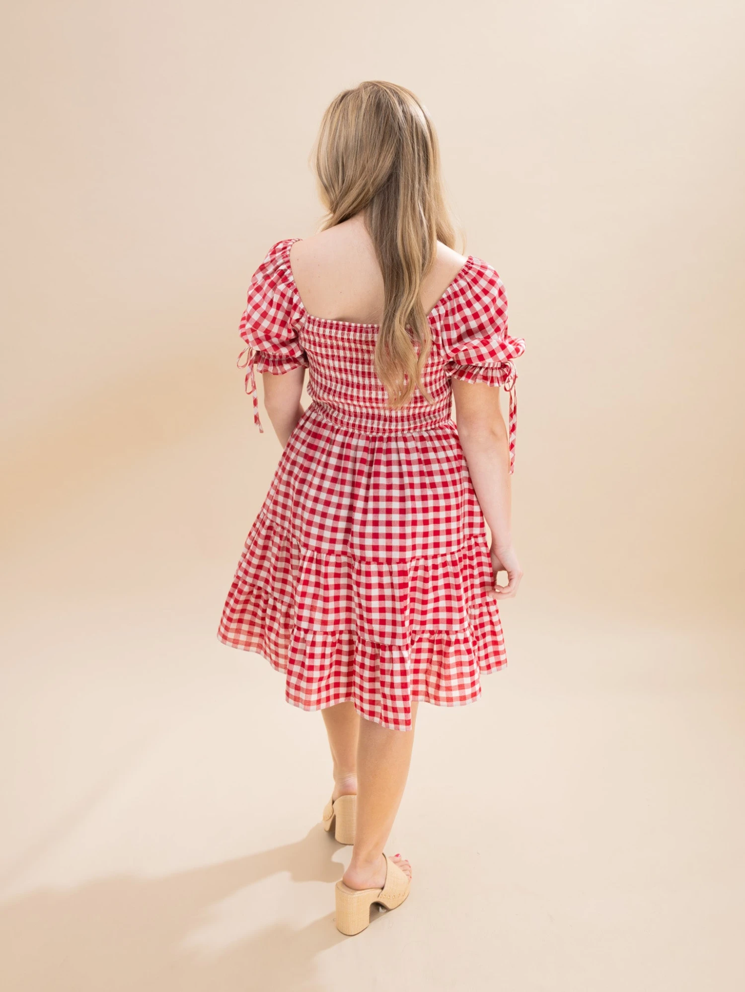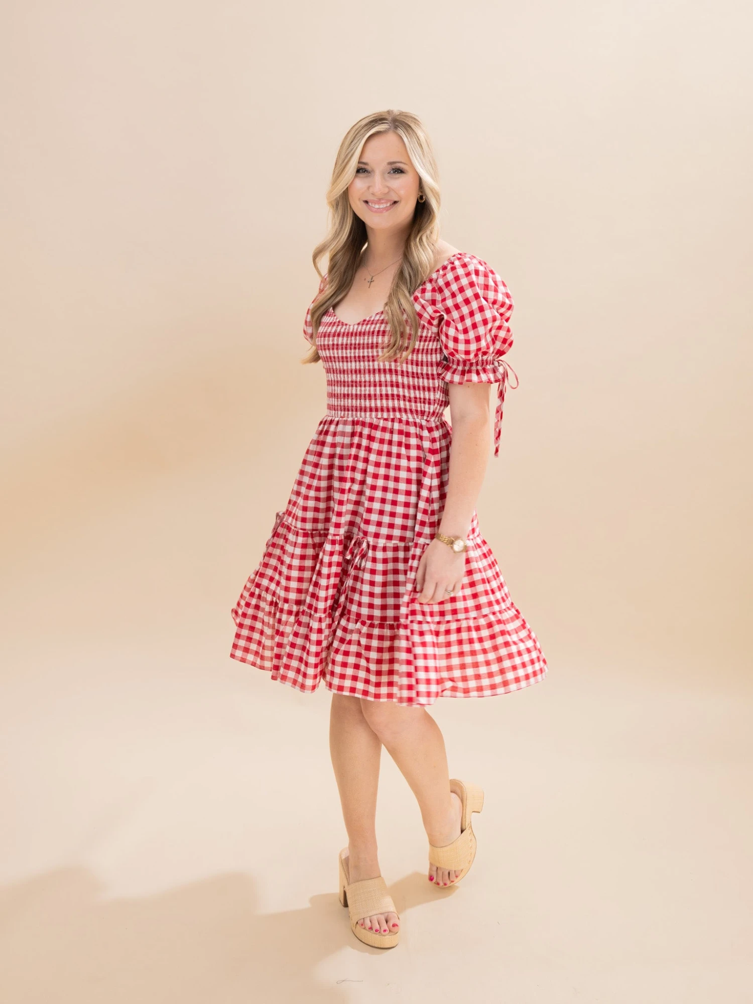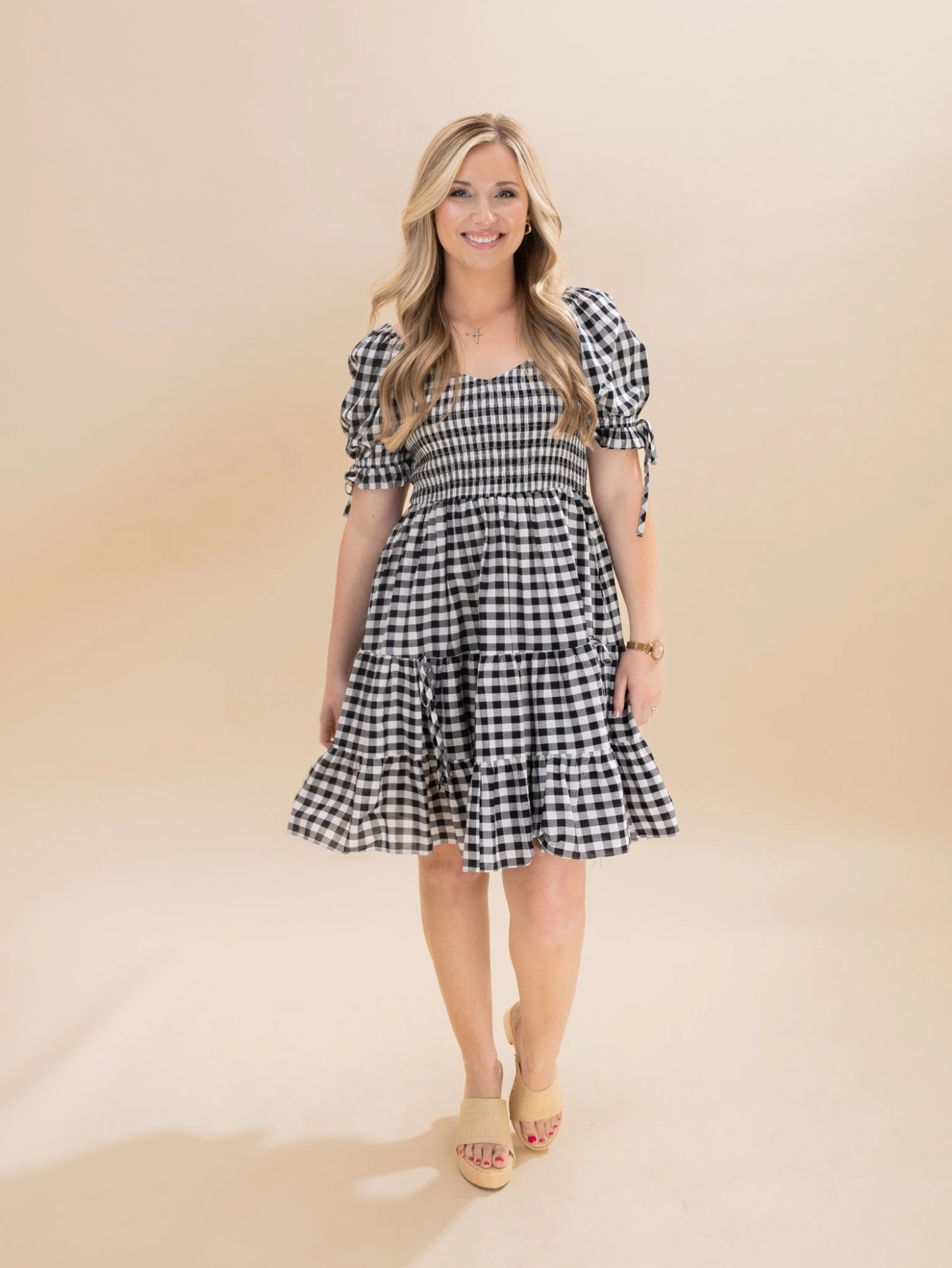 Features: Round Neck, Puff Short Sleeves, Pockets, Smocked Body, Checkered Tiered Dress