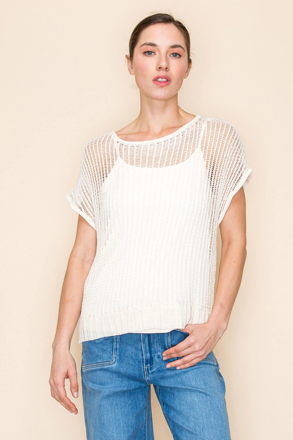 Features: Short Sleeve, Boat Neck, Solid Under Layer & Open Knit Top
