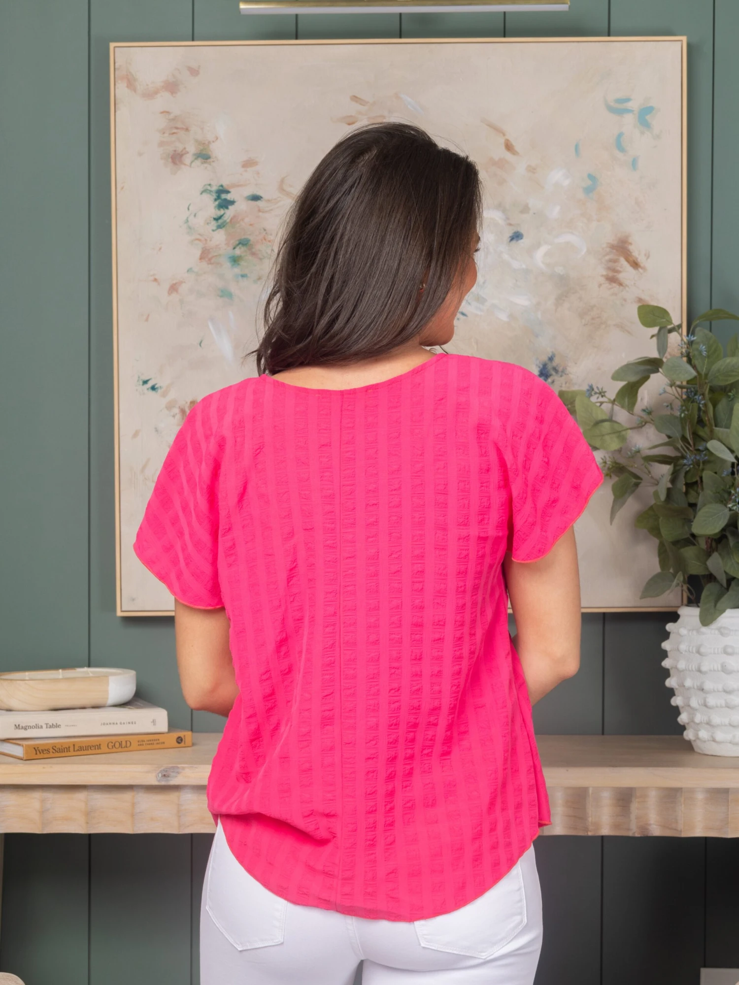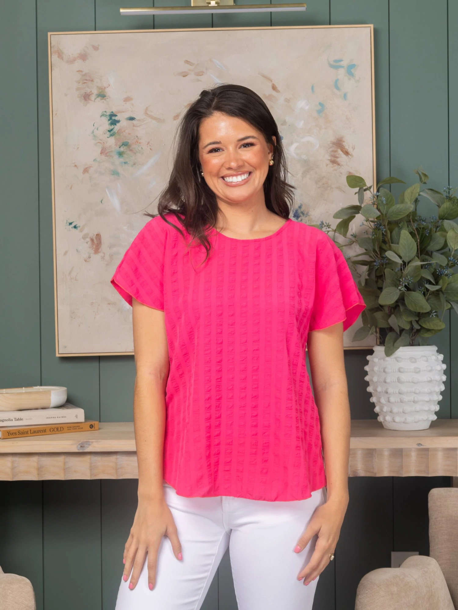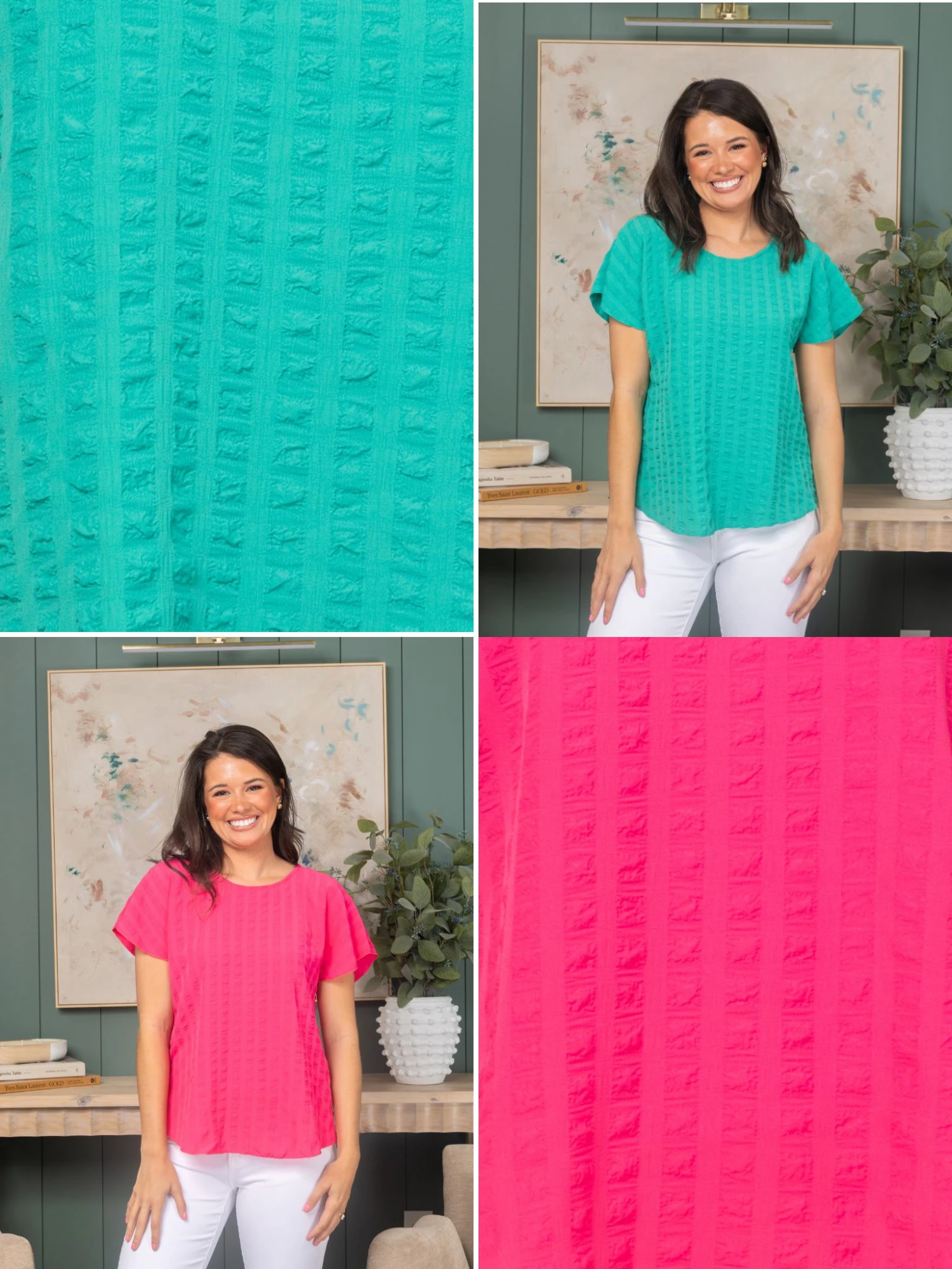Features: Round Neck, Short Sleeves, Textured Top