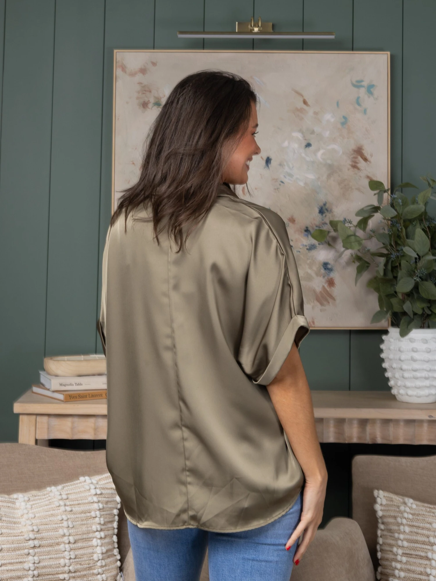 Features: Collared V Neck, Cuffed Short Sleeve, Round Bottom Hem