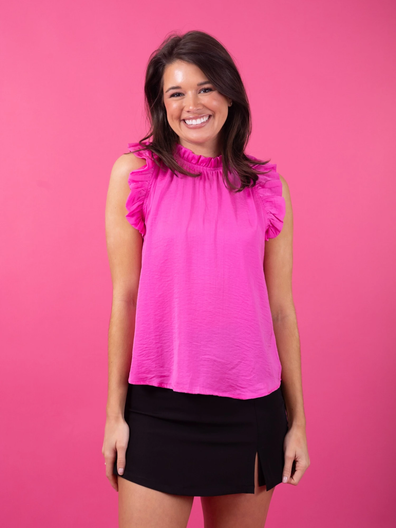 Features: Sleeveless, Mock Neck, Back Button Closure, Ruffled