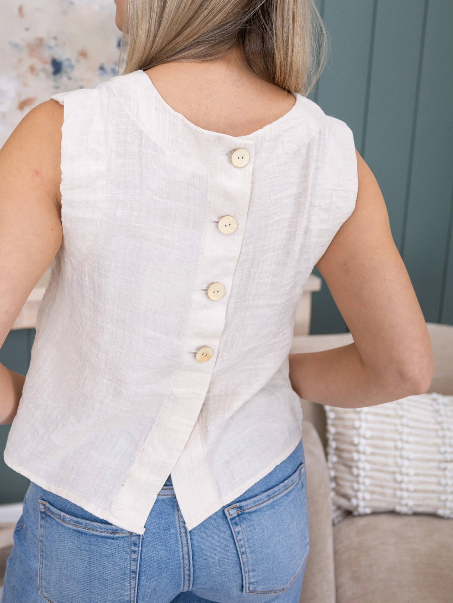 Features:U Neck, Sleeveless, Buttons Down Back