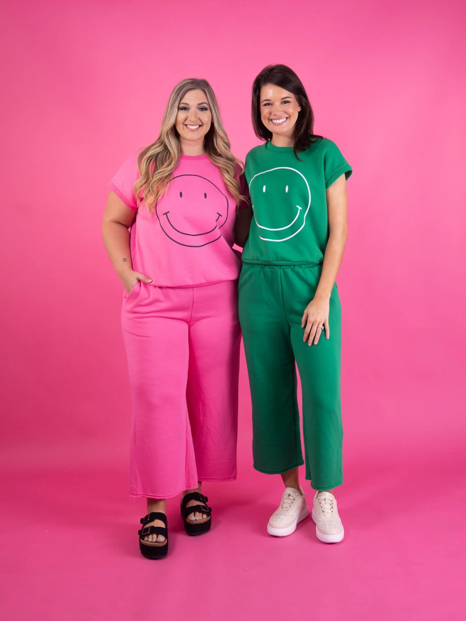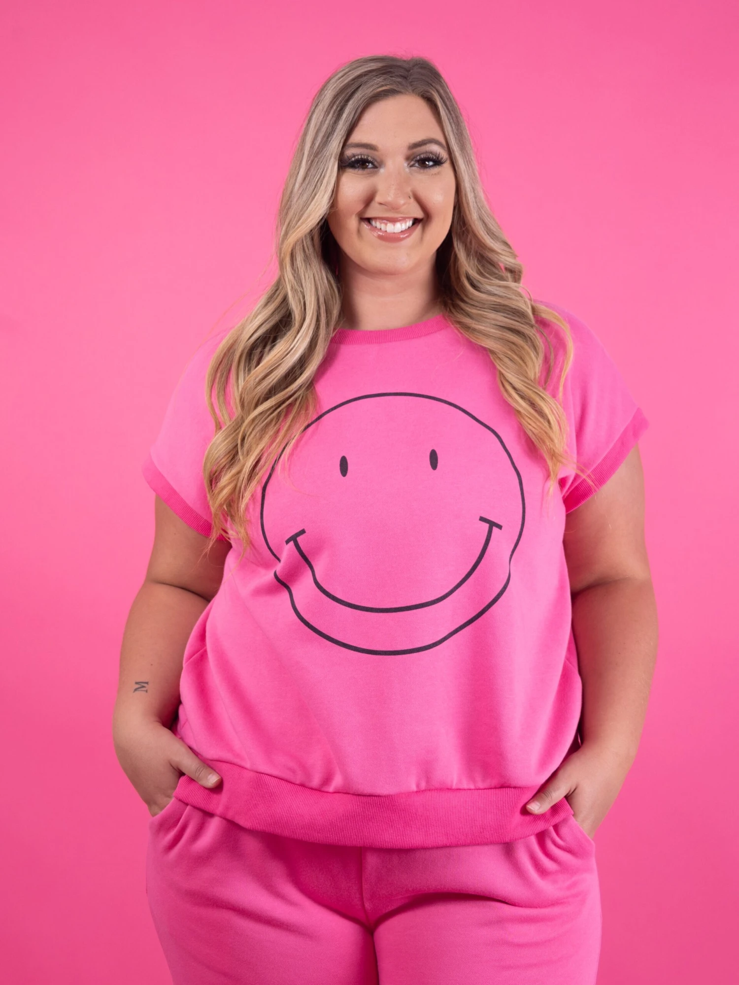 Features: Round Neck, Cuffed Short Sleeves, Smiley Graphic
