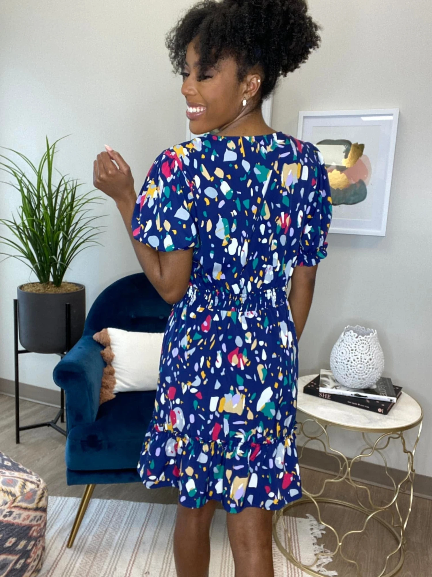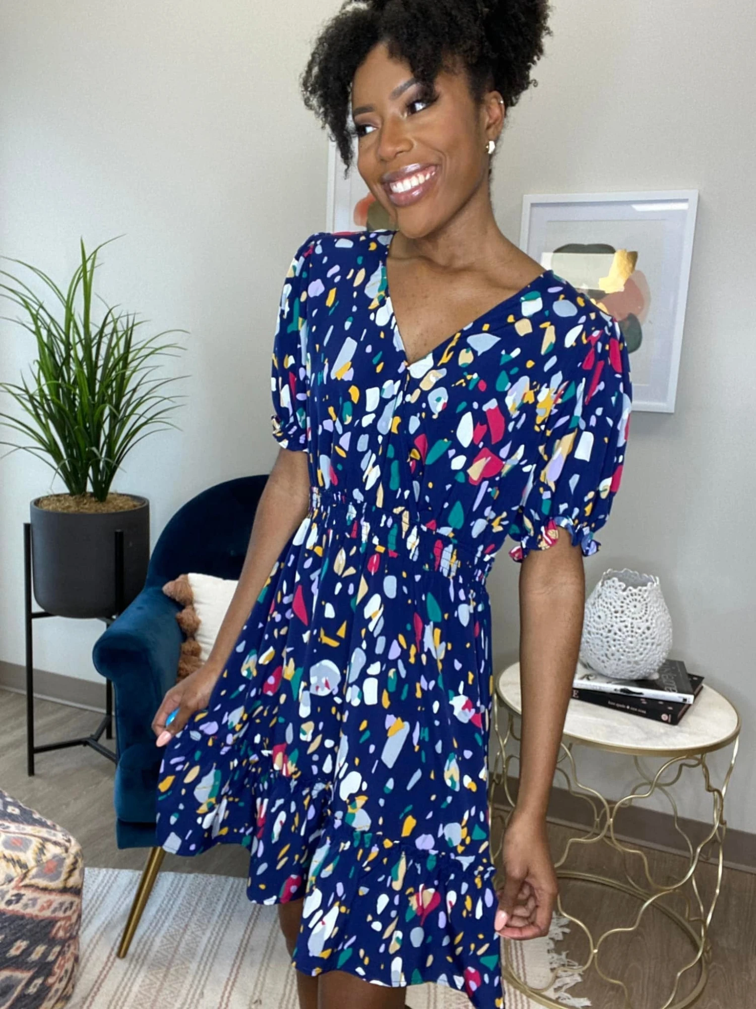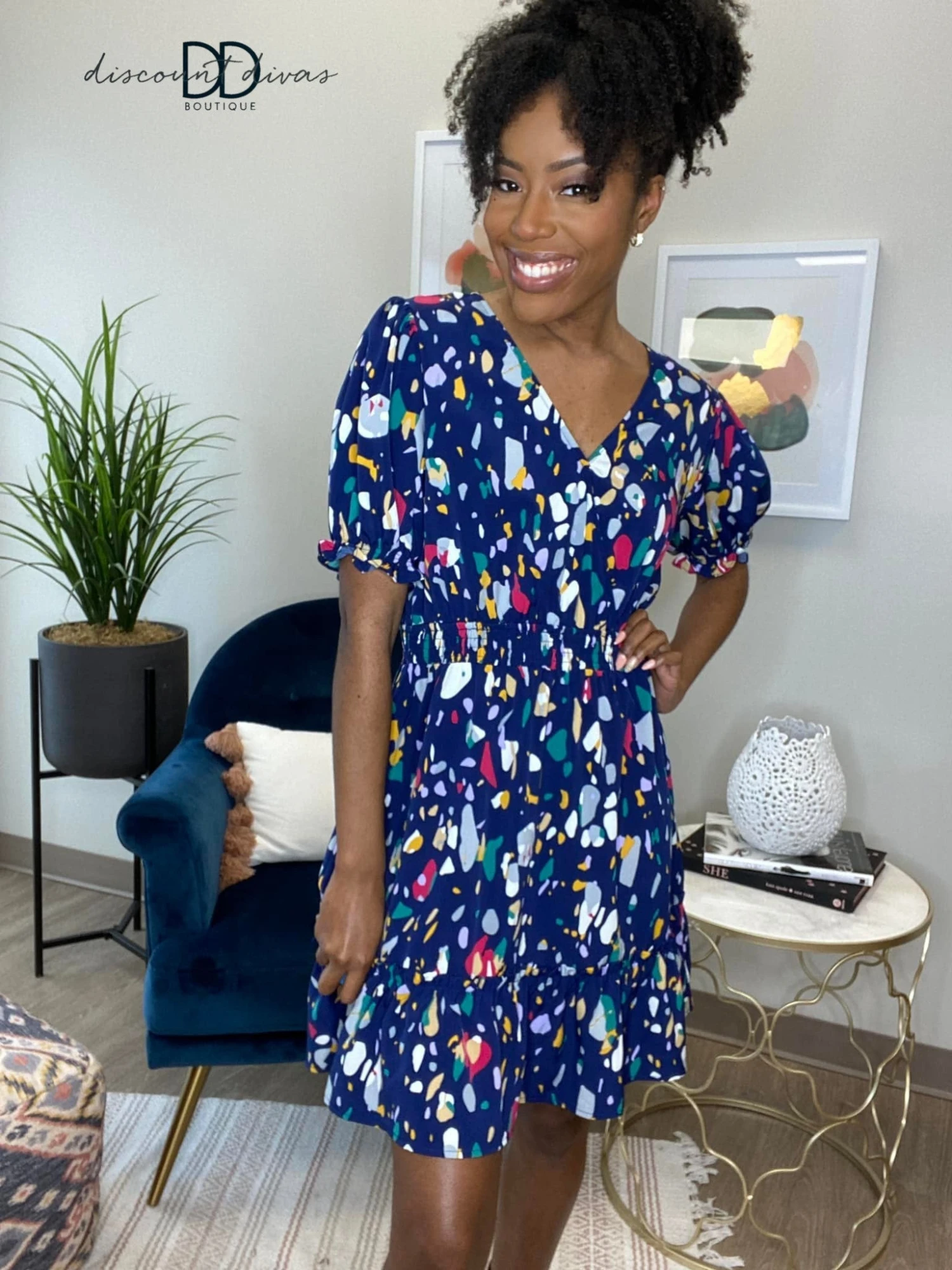 The “Social Sites Dress” has arrived! This multicolor printed dress is a must have! With short little balloon sleeves, the details on this one are so cute! Pair with some wedges or sandals, the possibilities are endless!
