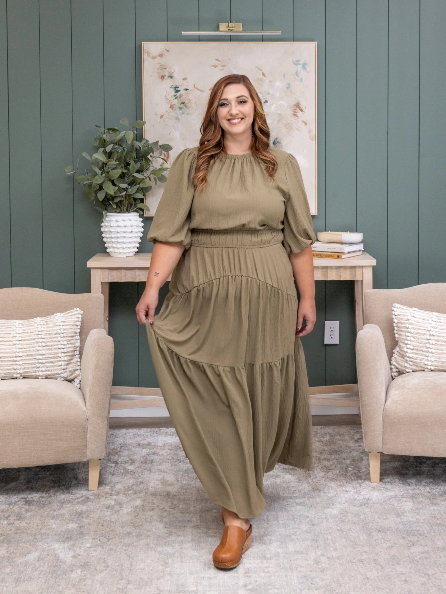 Features: Round Neck, 3/4/ Puff Sleeves, Solid Dress