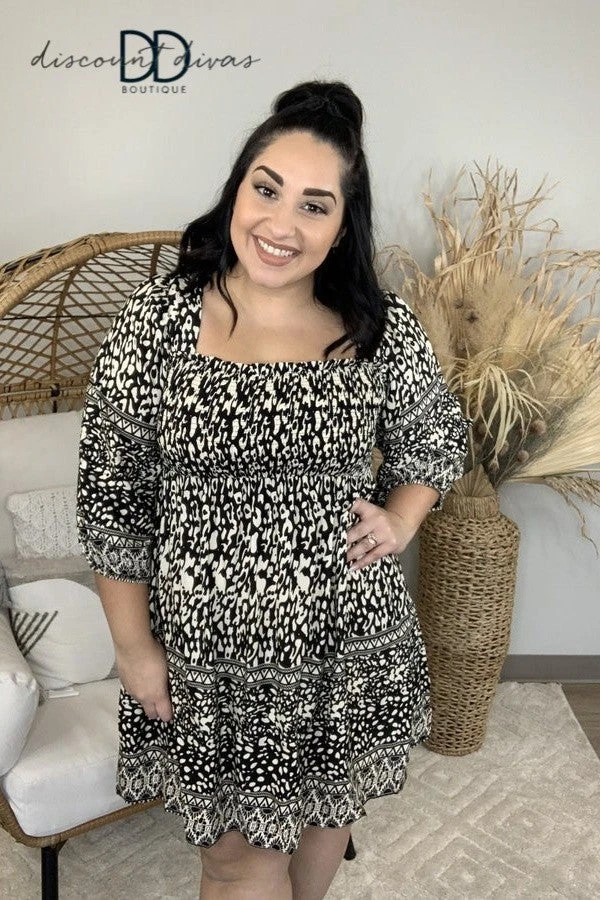 Features: animal border print, 3/4 sleeves, square neck, back tie, babydoll