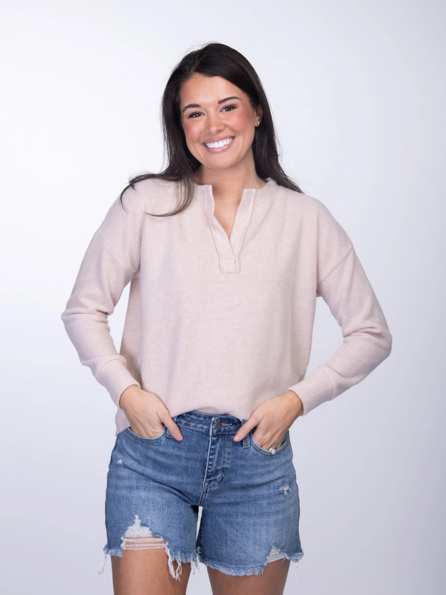 Features: Split V Neck, Long Sleeves, Solid Top