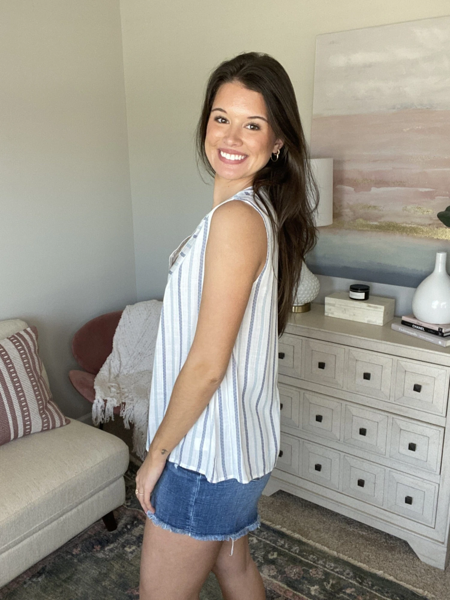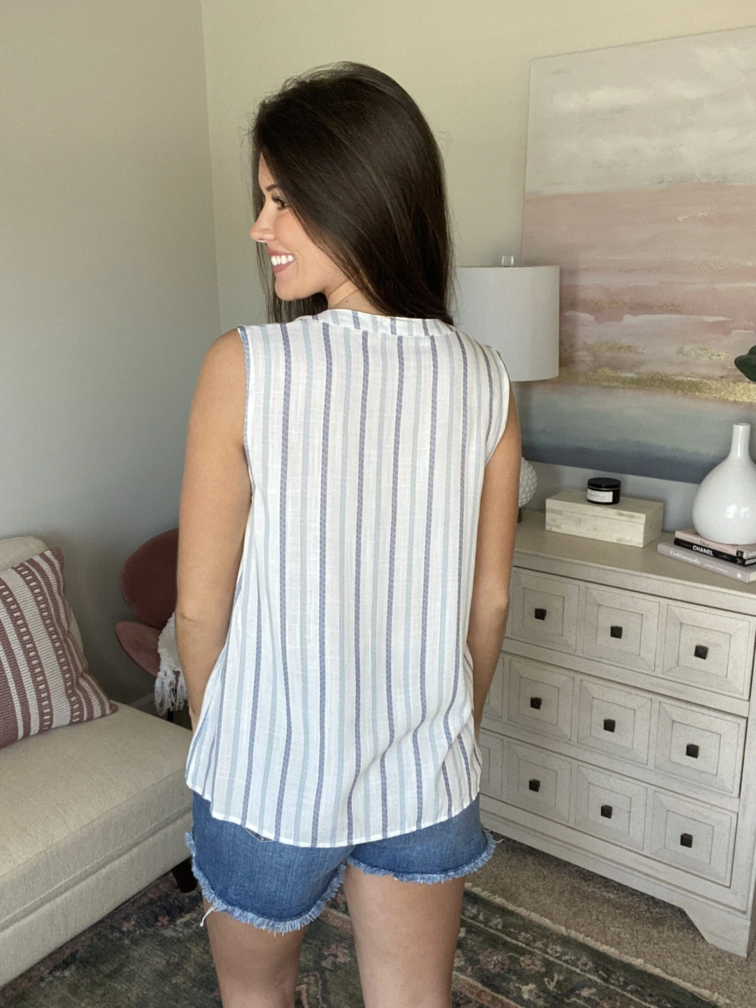The “Achieving The Goal Top” has arrived! This striped top is calling your name! With a v-neck design and sleeveless cut, this one is perfect for warm weather! Pair with denim or shorts, the possibilities are endless! Snag one before they are gone!