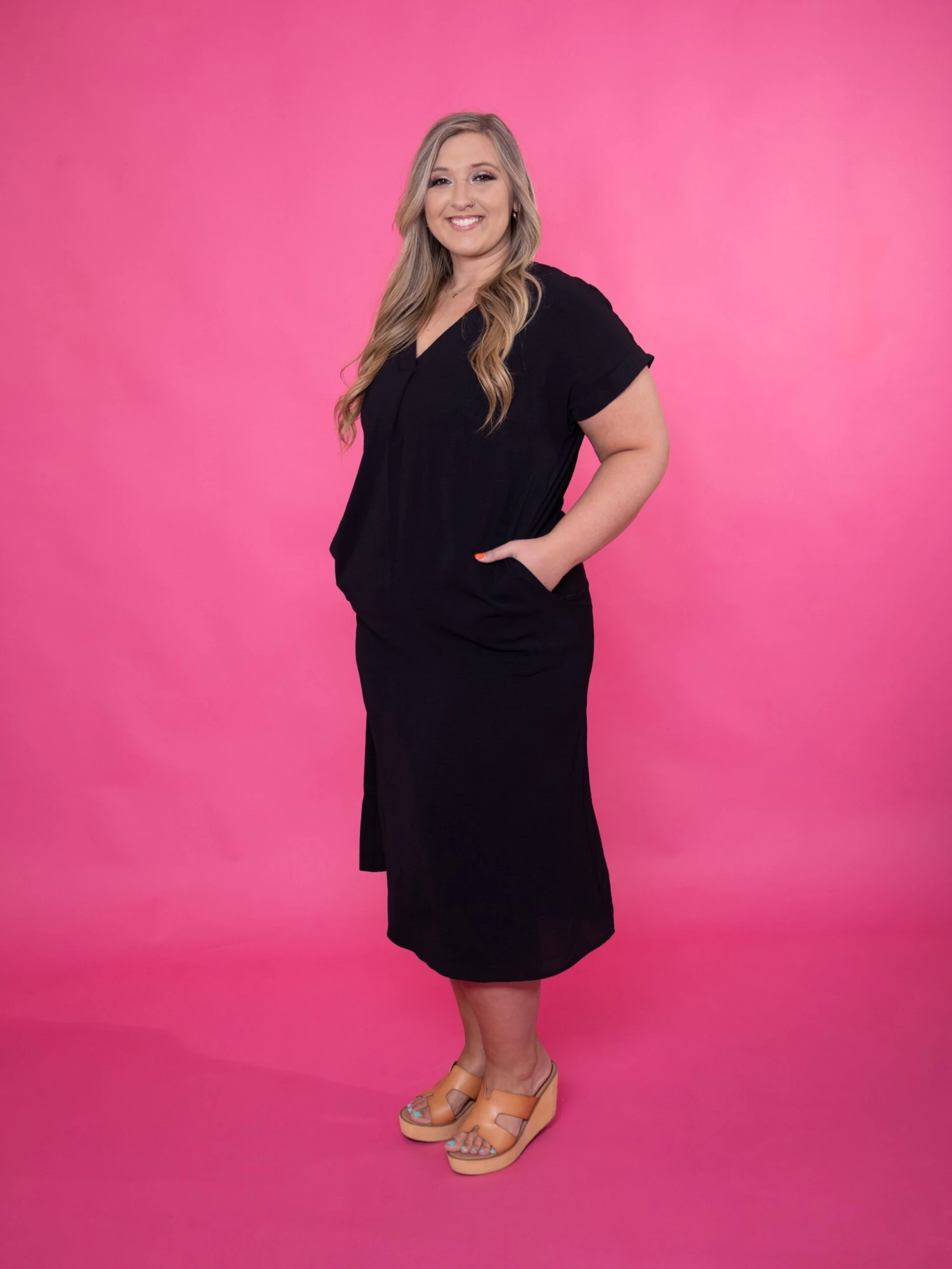 Features: V-Neck, Short Sleeve, Midi, Pockets