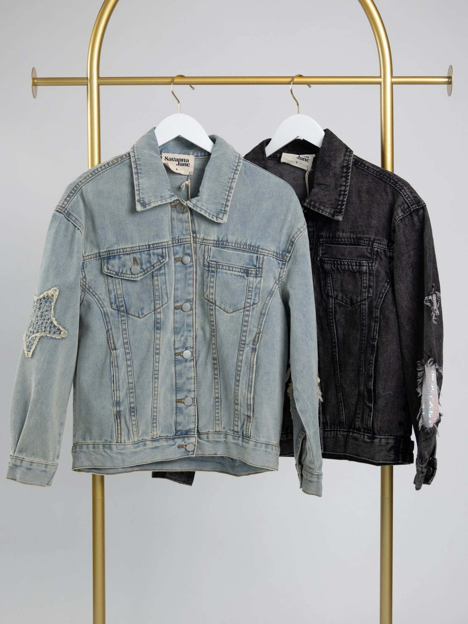 Features: Washed, Star Patch, Chest Pockets, Button-Down, Sequins Detail