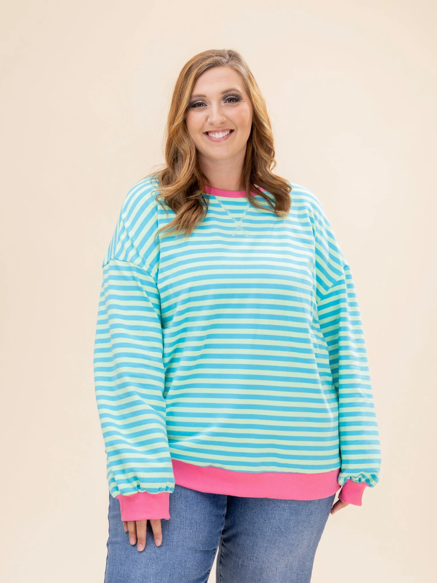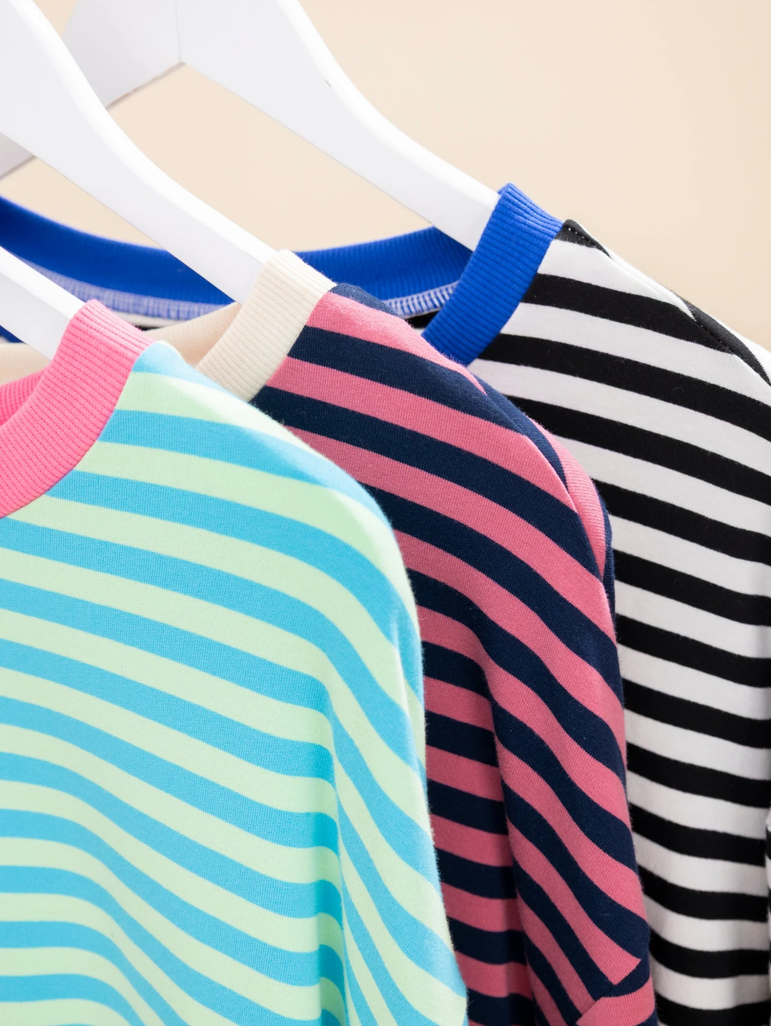 Features: Round Neck, Long Sleeves, Oversized, Striped W/ Solid Trim