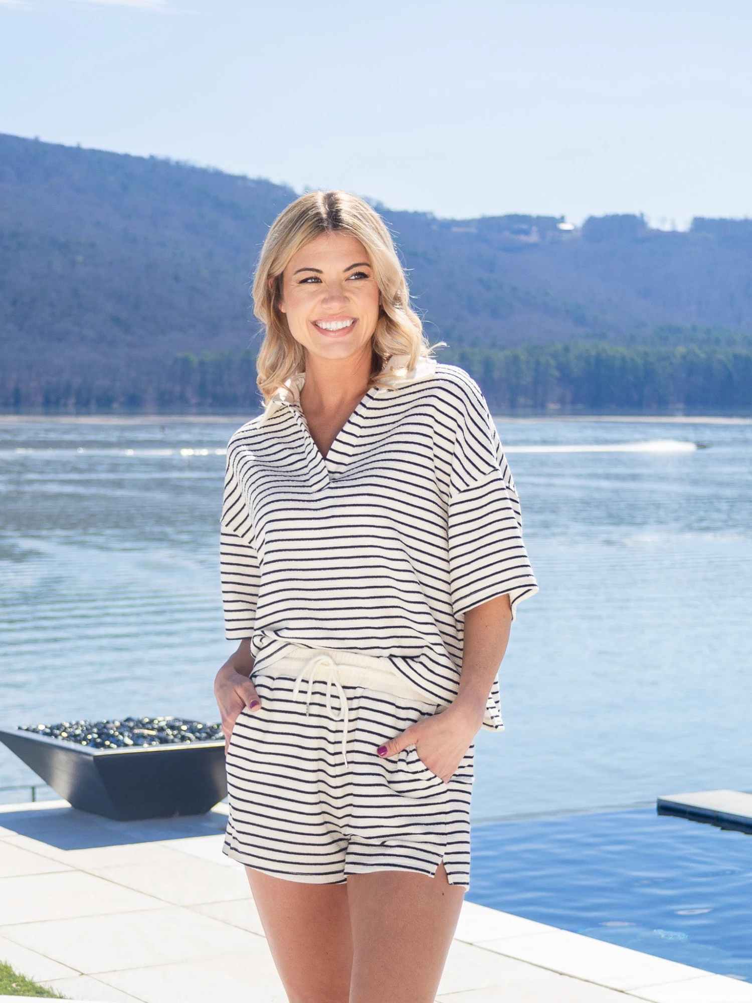 Brittany (short blonde hair) is 5’10, 36B bra, typically wears size S in tops and 3 in denim. Wearing size S