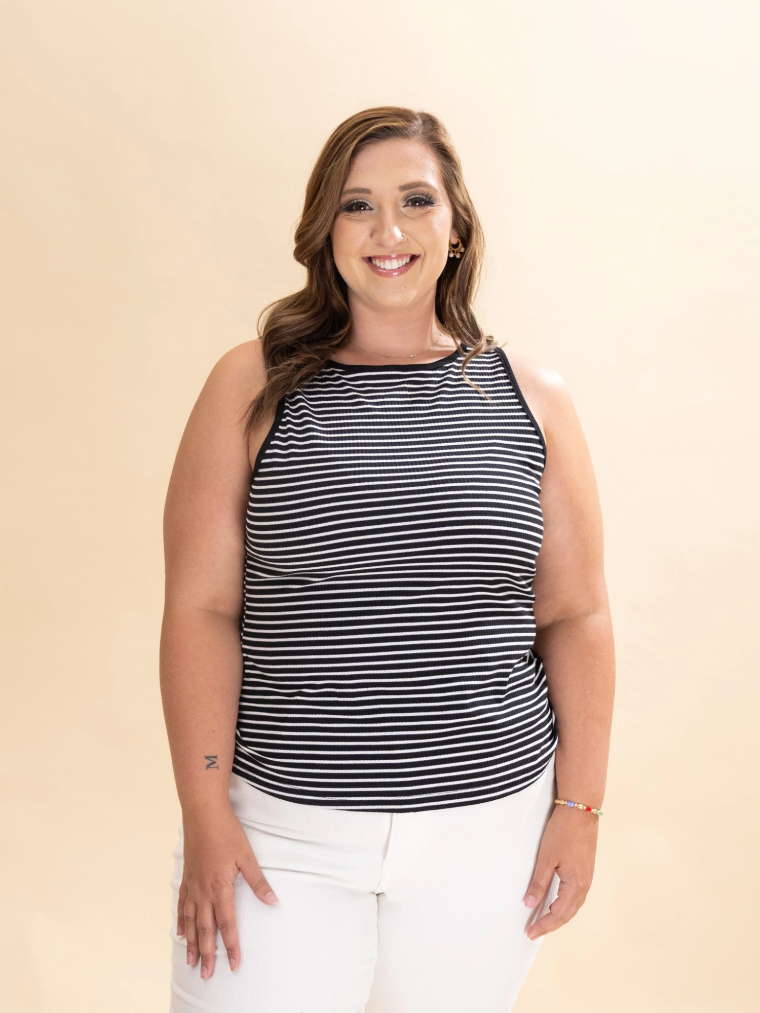 Features: Round Neck, Sleeveless, Keyhole Button Closure, Ribbed Striped Tank Top