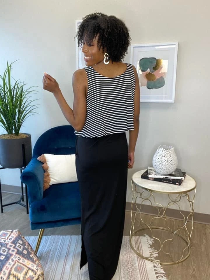The “Take It In Dress” has arrived! This adorable maxi dress is a must-have! You can’t miss out on this classy dress with the stripes and solid black! Be sure to snag one before they are gone!